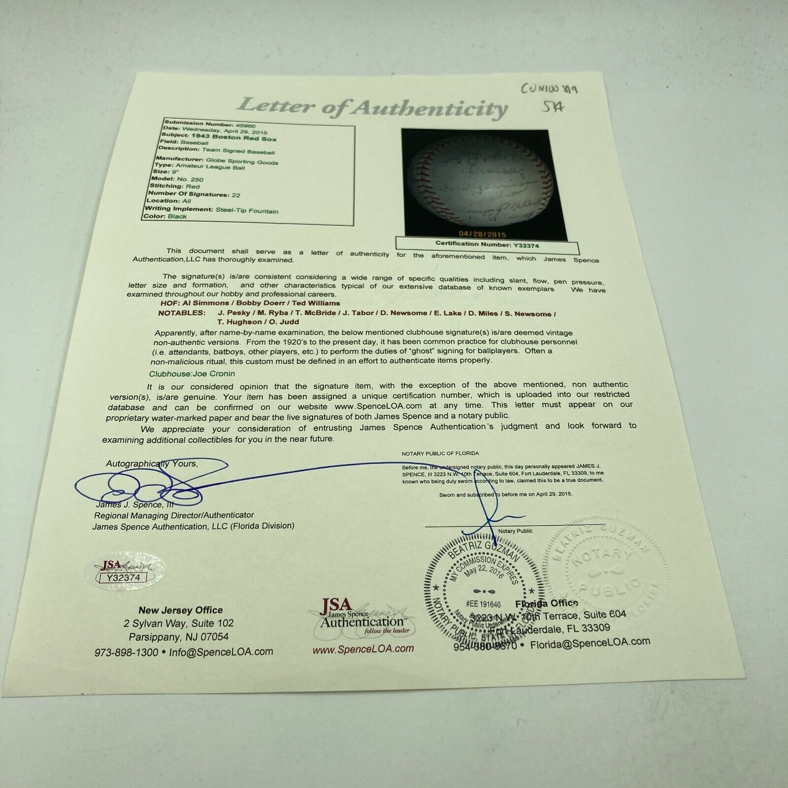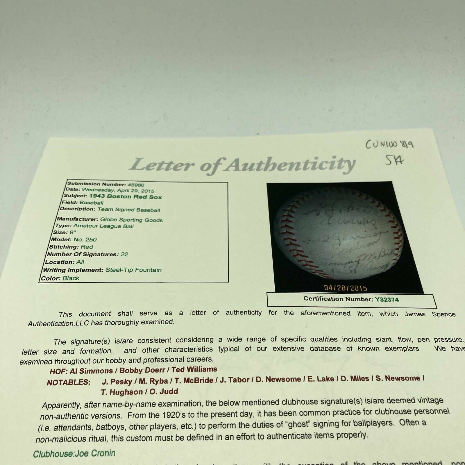 Nice 1943 Boston Red Sox Team Signed Baseball Ted Williams Al Simmons JSA COA