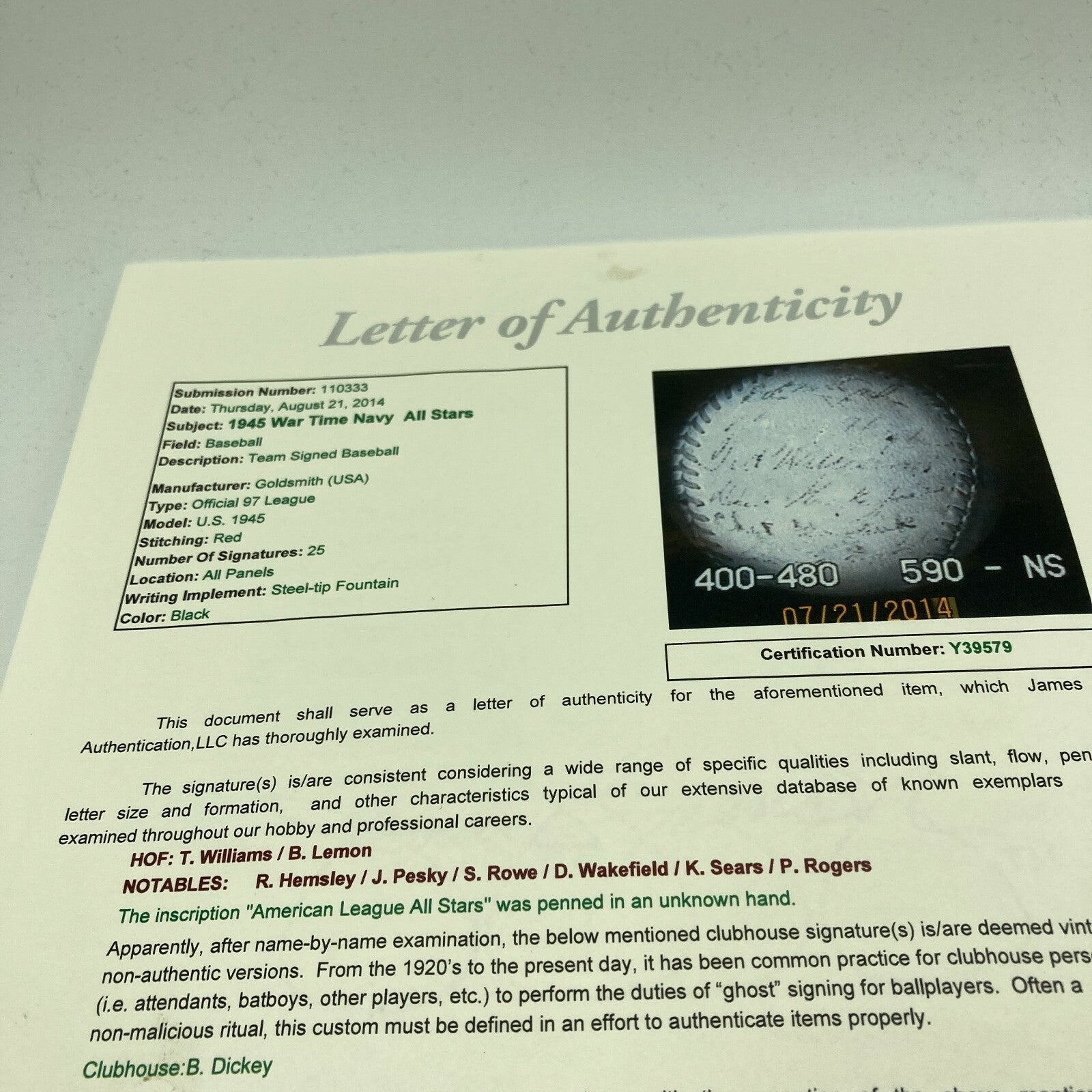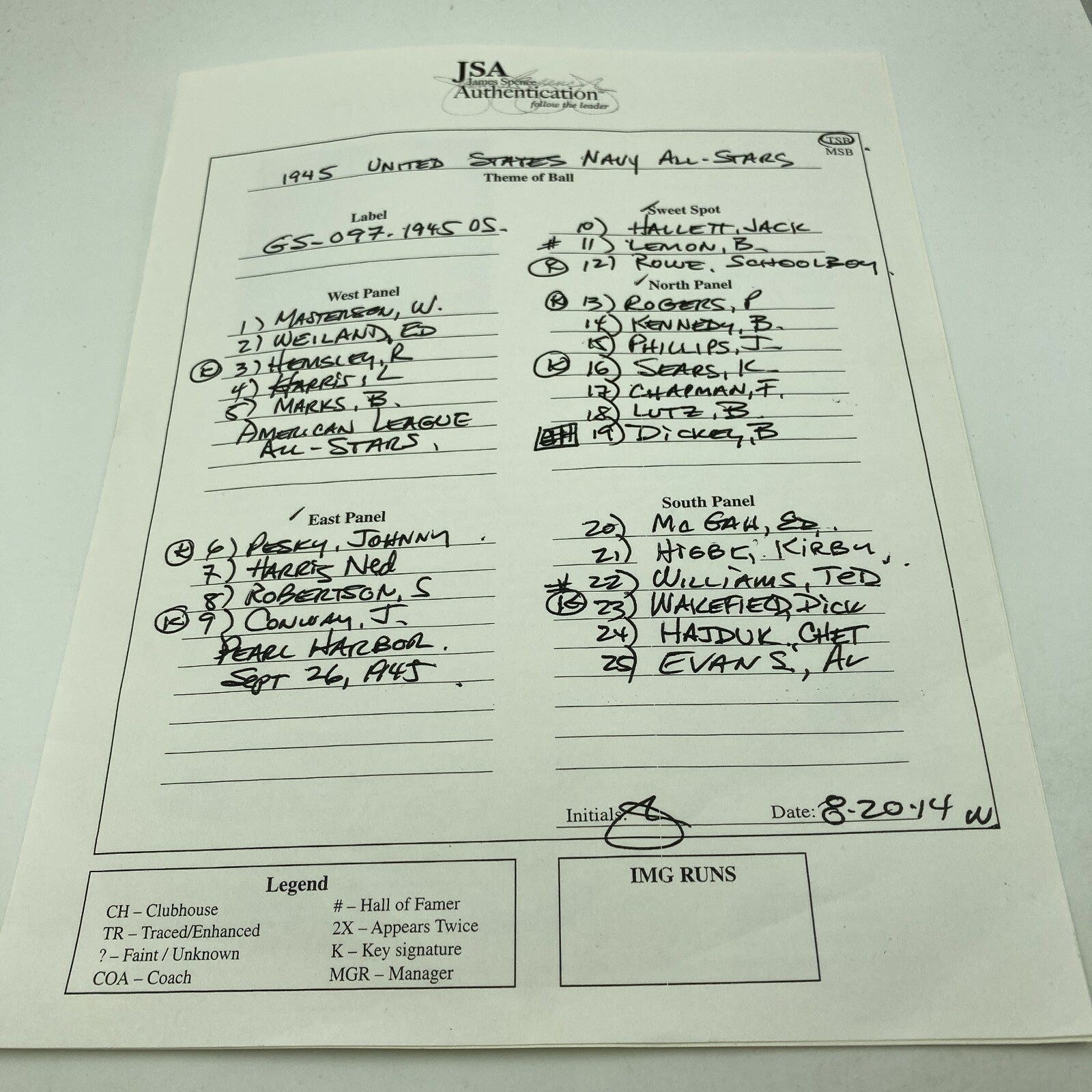 This ball was signed on September 28, 1945, in WWII Oahu, Hawaii. Played in Furlong Field at PEARL HARBOR, American League vs National League “ALL NAVY World Series”, was also Called ‘”All-Star Championship Series”. Signed by (25 ) All-Stars and two HOF Ted Williams, Bob Lemon. Followed by 6 Notables R. Hemsley, J. Pesky, Schoolboy Rowe, Dick Wakefield, K. Sears, P. Rogers, Jack Hallett, W.Masterson, Ed Weiland, B. Marks, B.Kennedy, J. Phillips, F. Chapman, B. Lutz, Ned Harris, S. Robertson, J. Conway, Ed Mcgah, Kirby Heike, Chet Hajduk and Al Evans . Signatures signed on a Goldsmith(USA) Official 97 League red stitch baseball. All signatures signed black Steel-tip Fountain pen