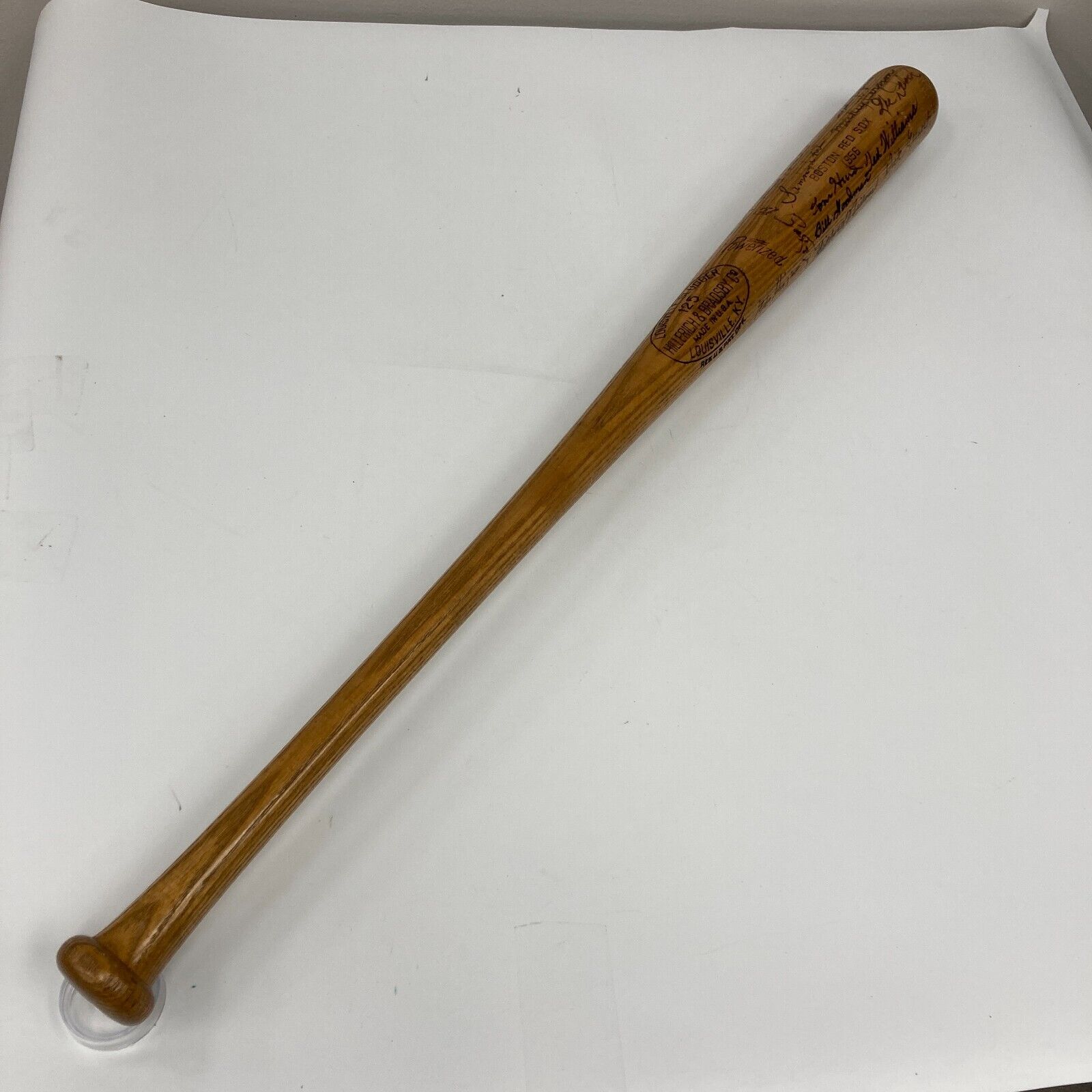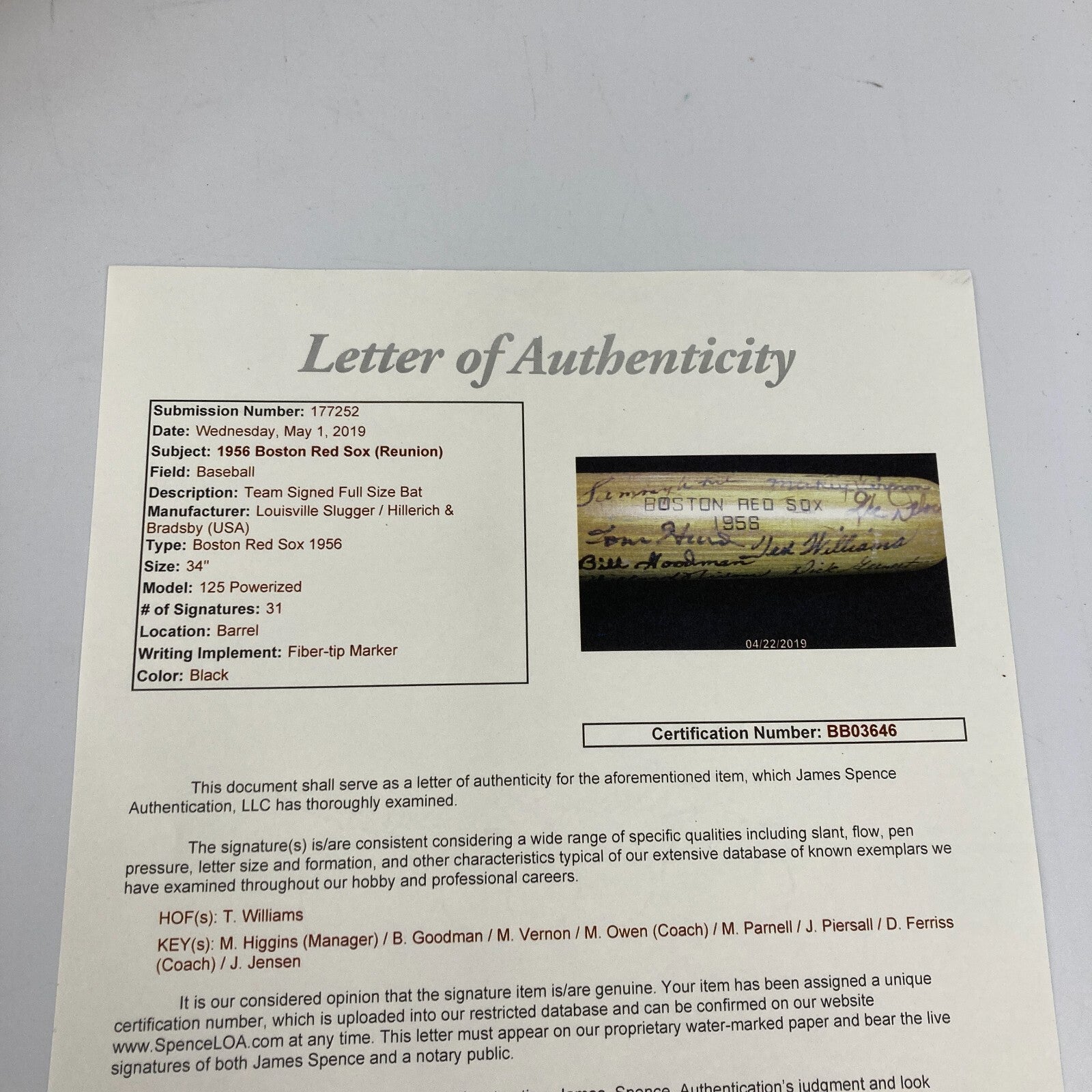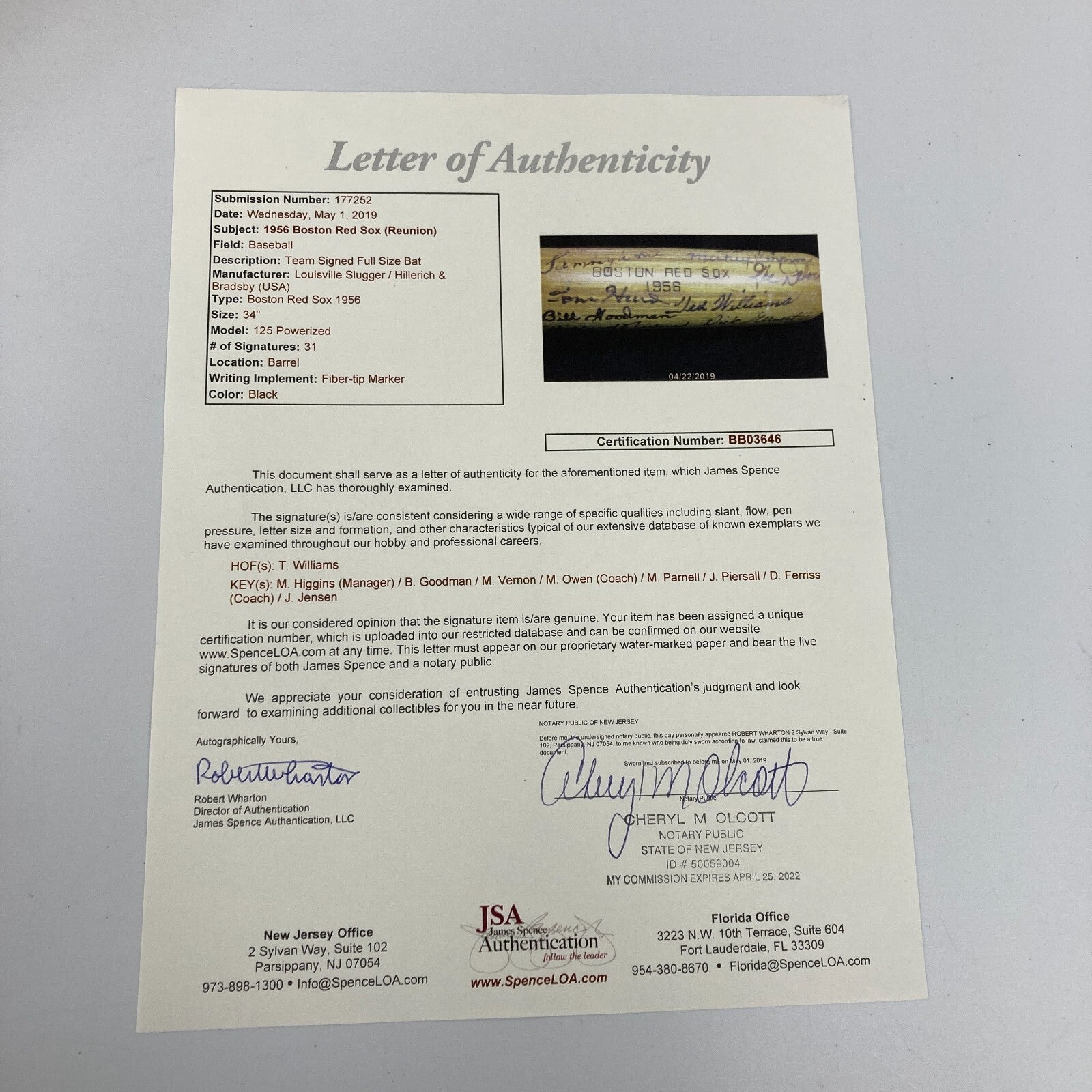 1956 Boston Red Sox team signed baseball bat. Louisville Slugger 125 model bat has "Boston Red Sox 1956" block lettered in the barrel. It has been signed by (31) including Ted Williams, Mike Higgins, Jackie Jensen, Mickey Vernon, Jim Piersall, Bill Goodman, Dick Gernert, and others. Includes full LOA from JSA (Note - JSA has listed this as a "reunion" piece however we are confident that it was signed in the period)