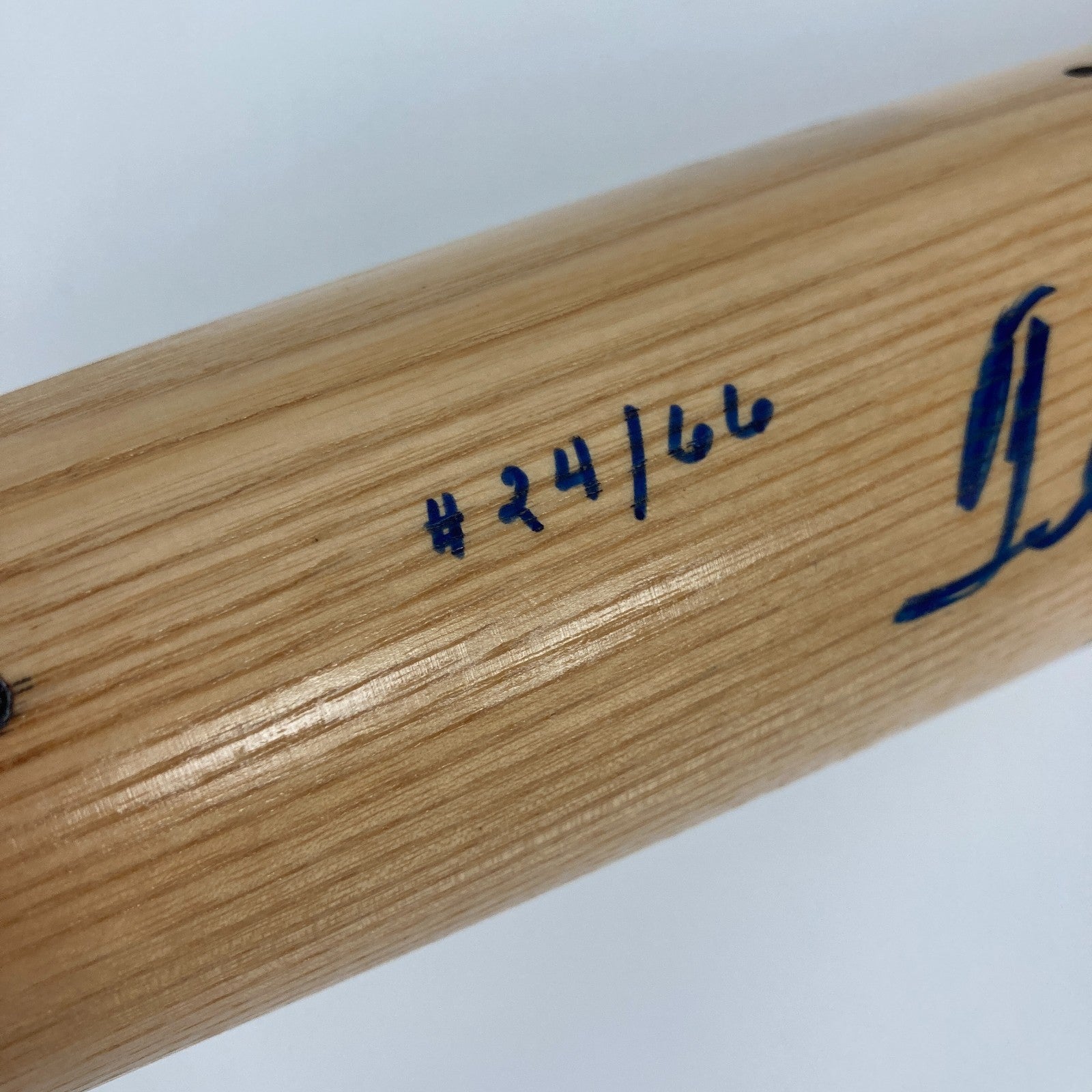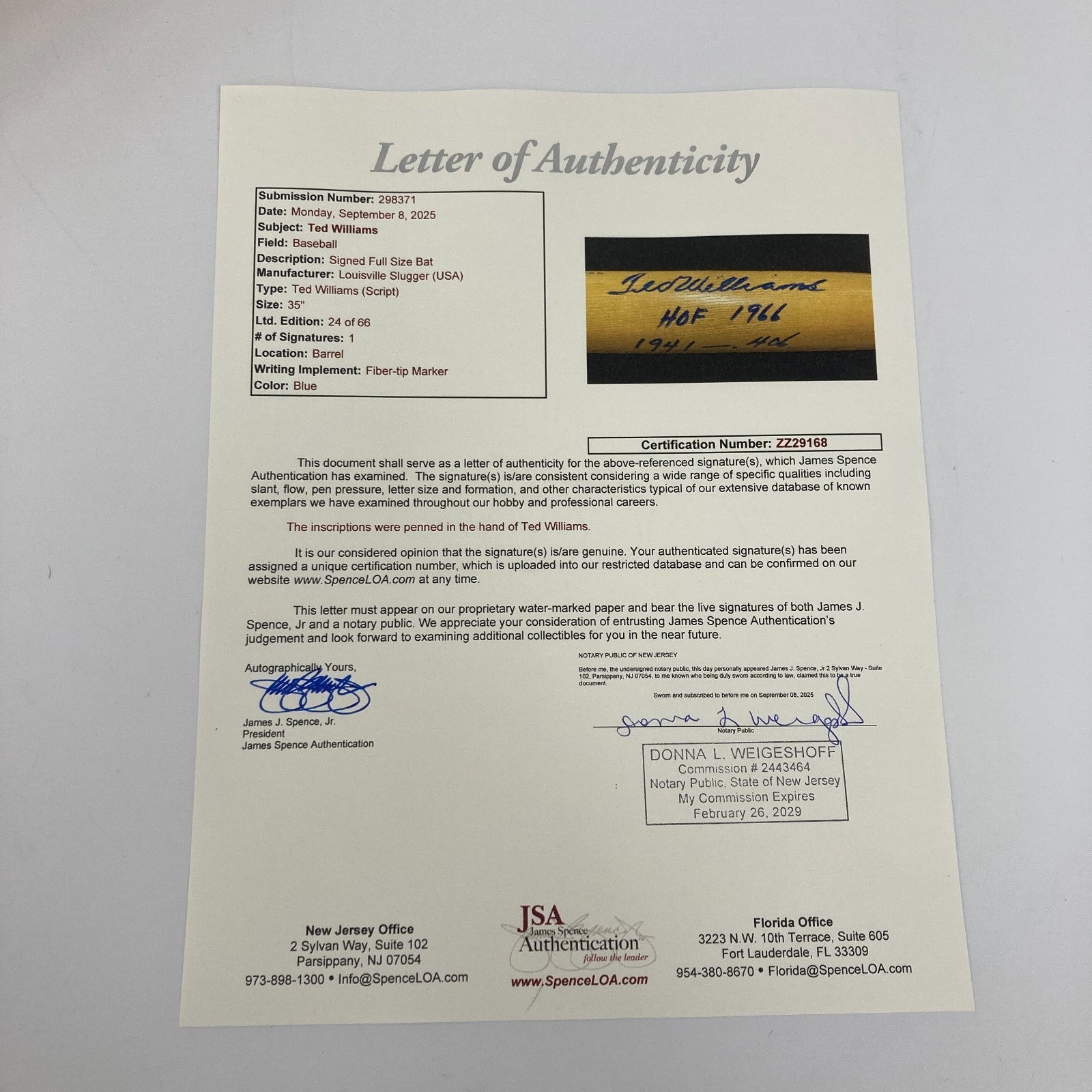 A limited edition bat #24/66, signed by iconic Boston Red Sox star Ted Williams. Williams has signed the natural colored, 34.5" long bat in blue marker on the barrel. He has added the inscriptions, "HOF 1966" and "1941 - .406." The gorgeous looking signature rates a 10/10. Williams is widely considered to be one of the best hitters in baseball history, hitting .344 for his career and winning six American League batting titles.