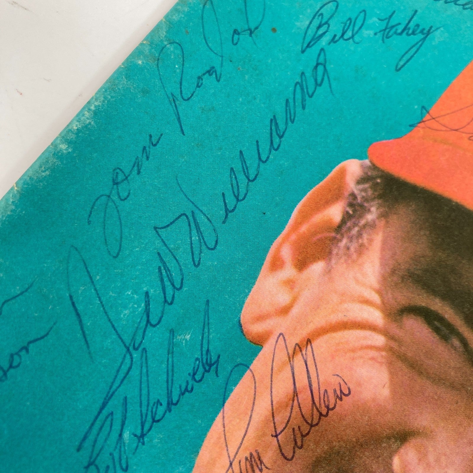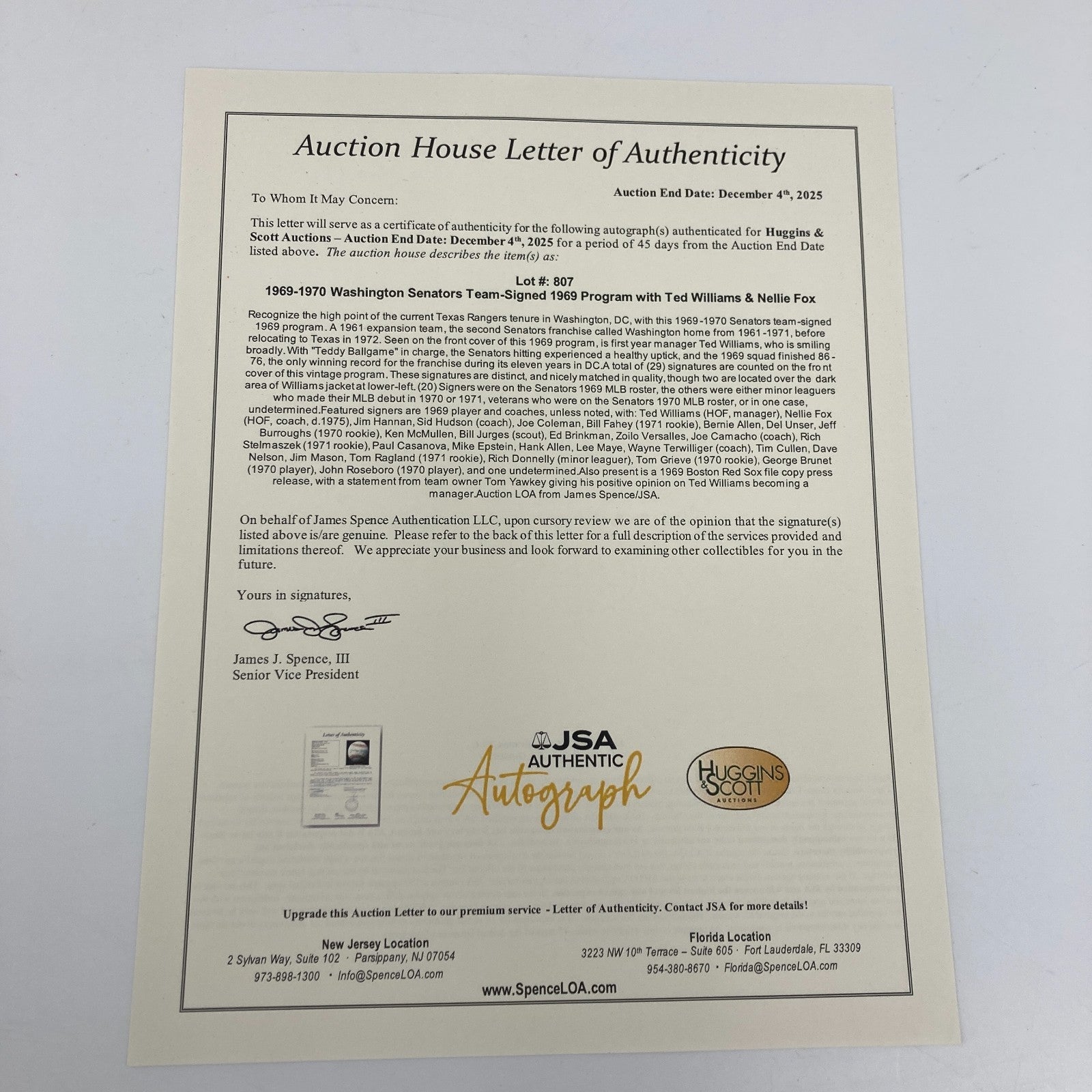 A total of (29) signatures are counted on the front cover of this vintage program. These signatures are distinct, and nicely matched in quality, though two are located over the dark area of Williams jacket at lower-left. (20) Signers were on the Senators 1969 MLB roster, the others were either minor leaguers who made their MLB debut in 1970 or 1971, veterans who were on the Senators 1970 MLB roster, or in one case, undetermined.