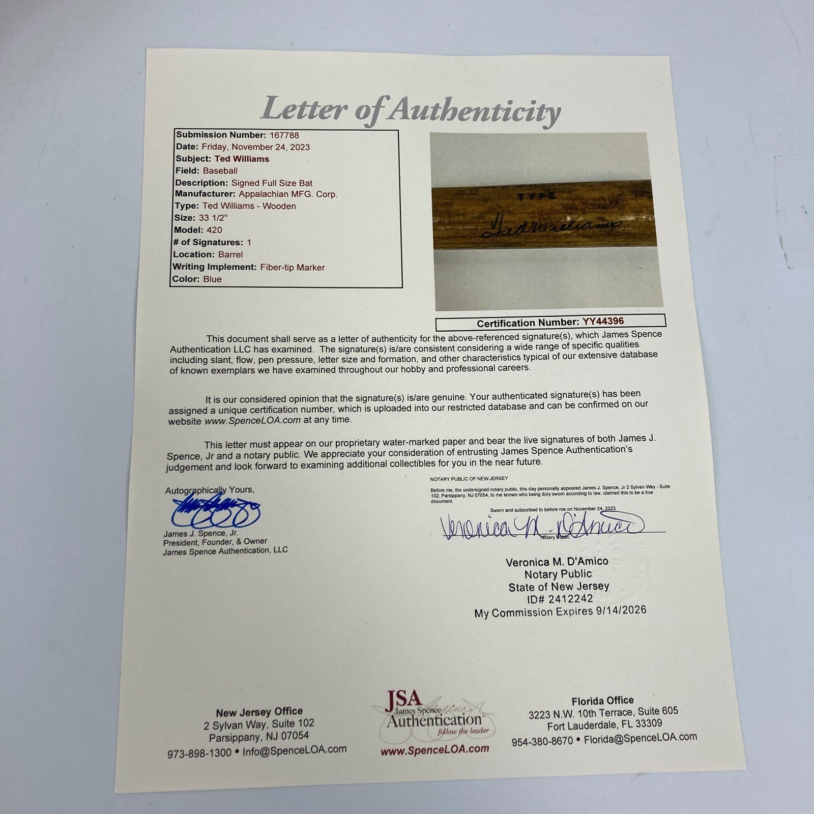 Beautiful Ted Williams Signed Louisville Slugger Game Model Baseball Bat JSA COA Graded 10 GEM MINT Bat #18 Listed with ExportYourStore.com