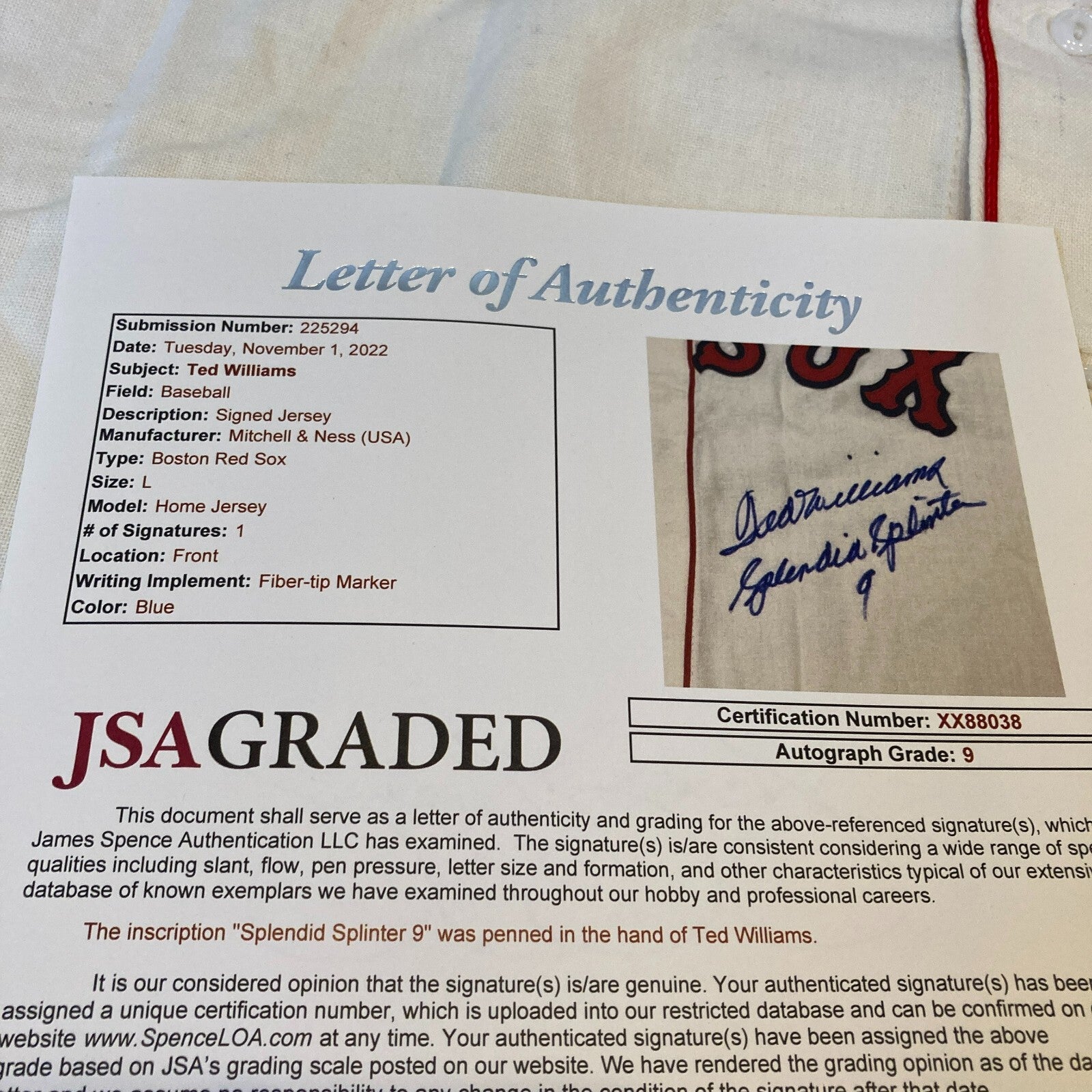 Click or scroll to zoom Tap or pinch to zoom Click or scroll to zoom Tap or pinch to zoom Click or scroll to zoom Tap or pinch to zoom Click or scroll to zoom Tap or pinch to zoom Click or scroll to zoom Tap or pinch to zoom Click or scroll to zoom Tap or pinch to zoom Click or scroll to zoom Tap or pinch to zoom Click or scroll to zoom Tap or pinch to zoom Click or scroll to zoom Tap or pinch to zoom Ted Williams Splendid Splinter Signed Boston Red Sox Jersey JSA Graded MINT 9 $14,995.00 1 2 3 4 5 6 7 8 9 10+ Quantity Quantity Add to cart This item is a recurring or deferred purchase. By continuing, I agree to the cancellation policy and authorize you to charge my payment method at the prices, frequency and dates listed on this page until my order is fulfilled or I cancel, if permitted. The Finest Ted Williams "Splendid Splinter, #9" Signed Mitchell & Ness Boston Red Sox Jersey JSA Graded MINT 9. Comes with full letter JSA COA.D#A15