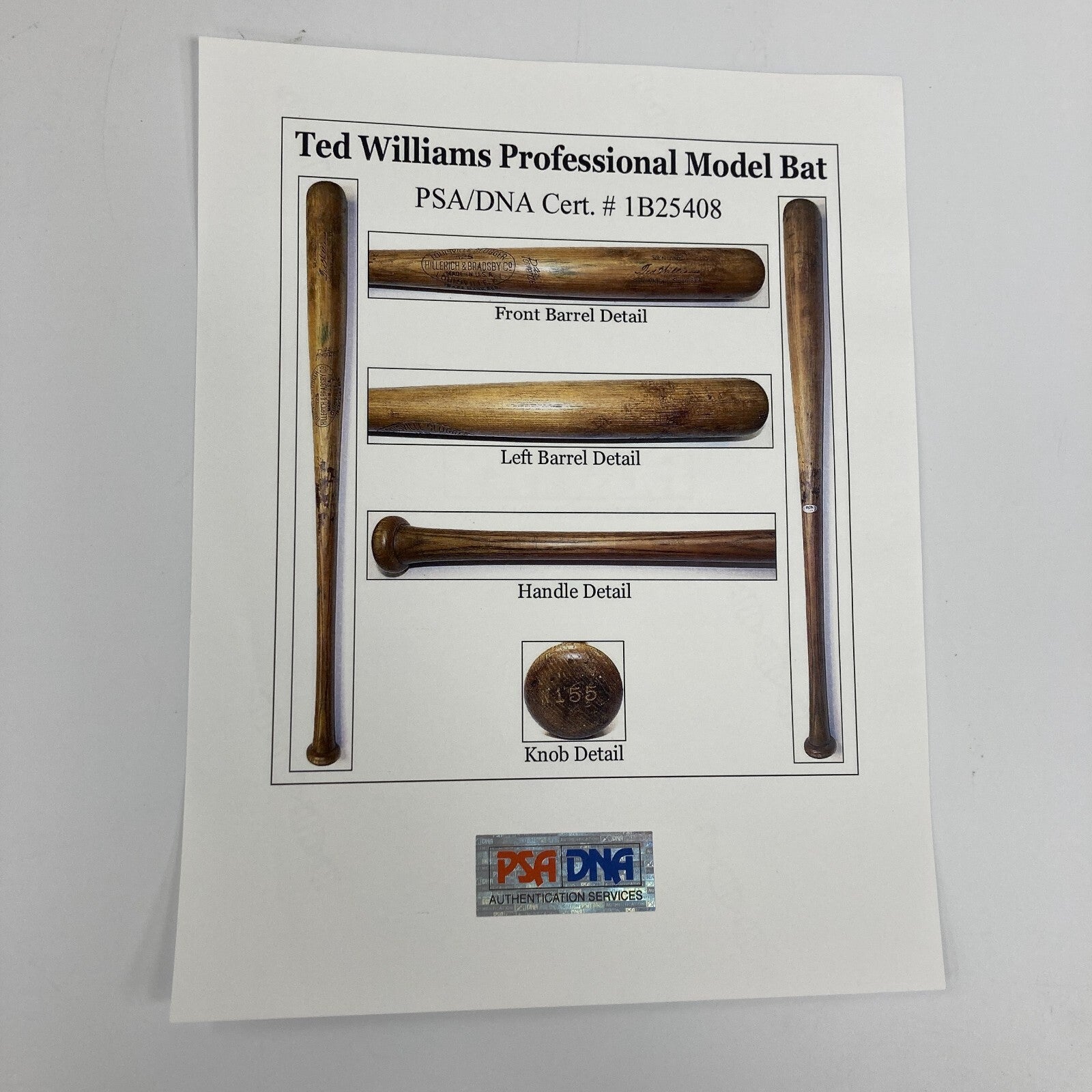 The offered bat is 35 inches in length, weighs 31.8 ounces, and exhibits evidence of outstanding use with a slight handle crack that has been repaired. The barrel is packed with ball marks, stitch impressions, cleat divots and green rack streaks, while the handle demonstrates the scoring and pine tar typical of Williams' meticulous approach to bat preparation. The upper handle displays a moderate coat of pine tar and signs of scraping; PSA/DNA notes, "The use of a grip substance professed to be a mixture of olive oil and rosin was also used by Williams. When the substance would build up on Ted's bats, John Orlando Junior, or his dad John Orlando Sr., Boston Red Sox Clubhouse Manager, would scrape it off, and Ted would continue to use the bat."