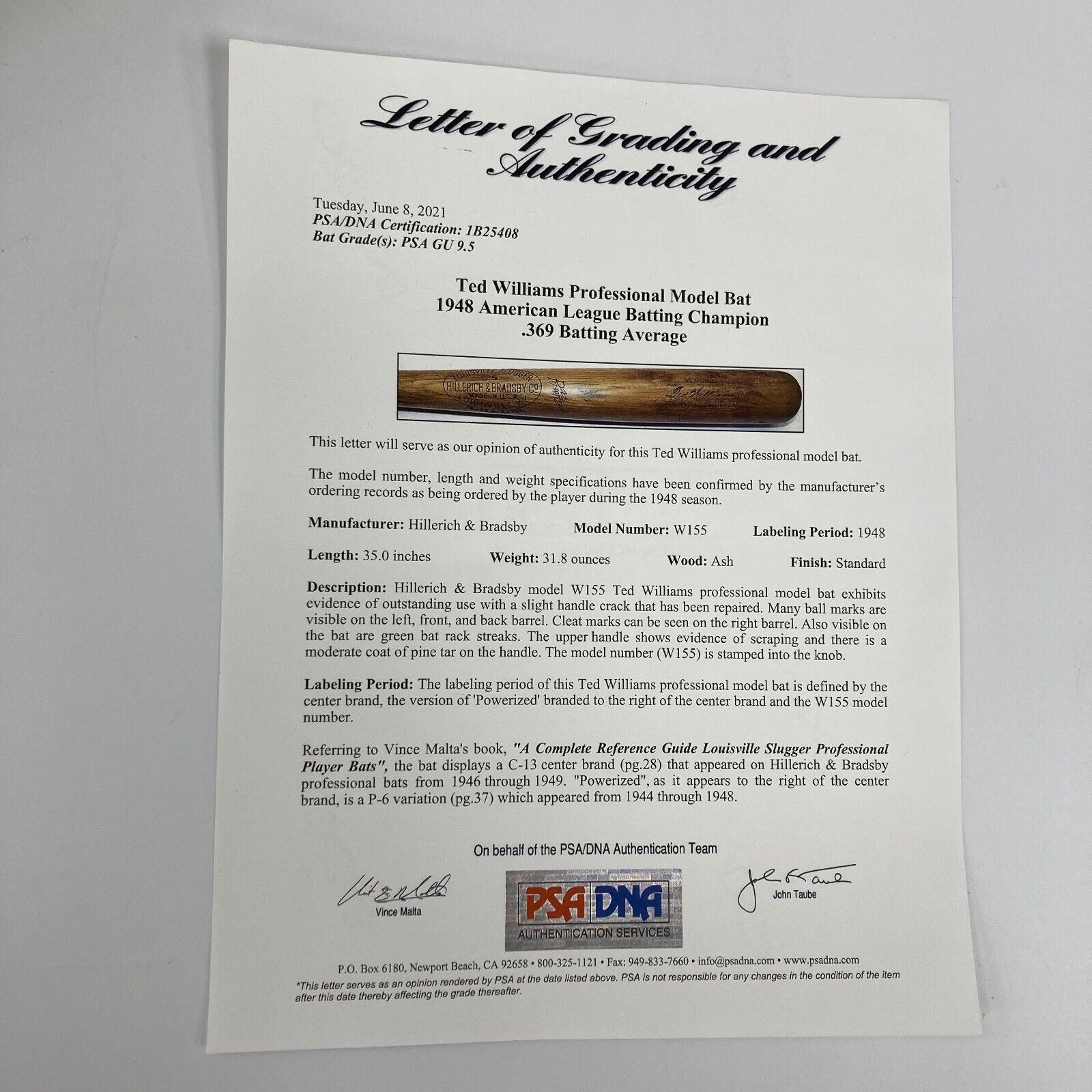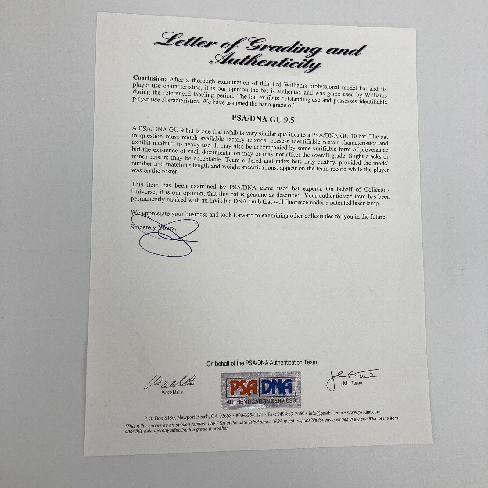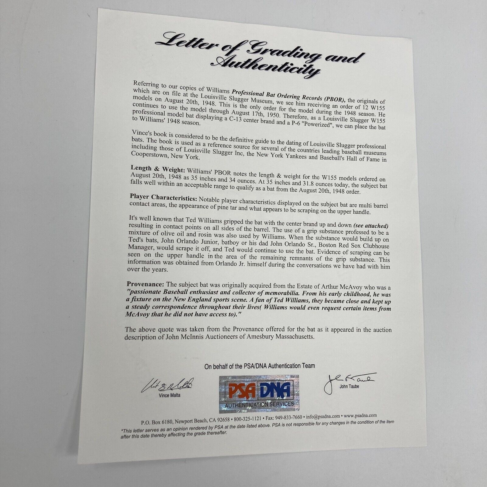 Full letter LOA from PSA/DNA (1B25408), who have awarded the bat the very high grade of GU 9.5 for game use. The letter concludes that the bat derives from the estate of Arthur McAvoy, a passionate Red Sox fan who developed a friendship with Williams that lasted throughout their lives.
