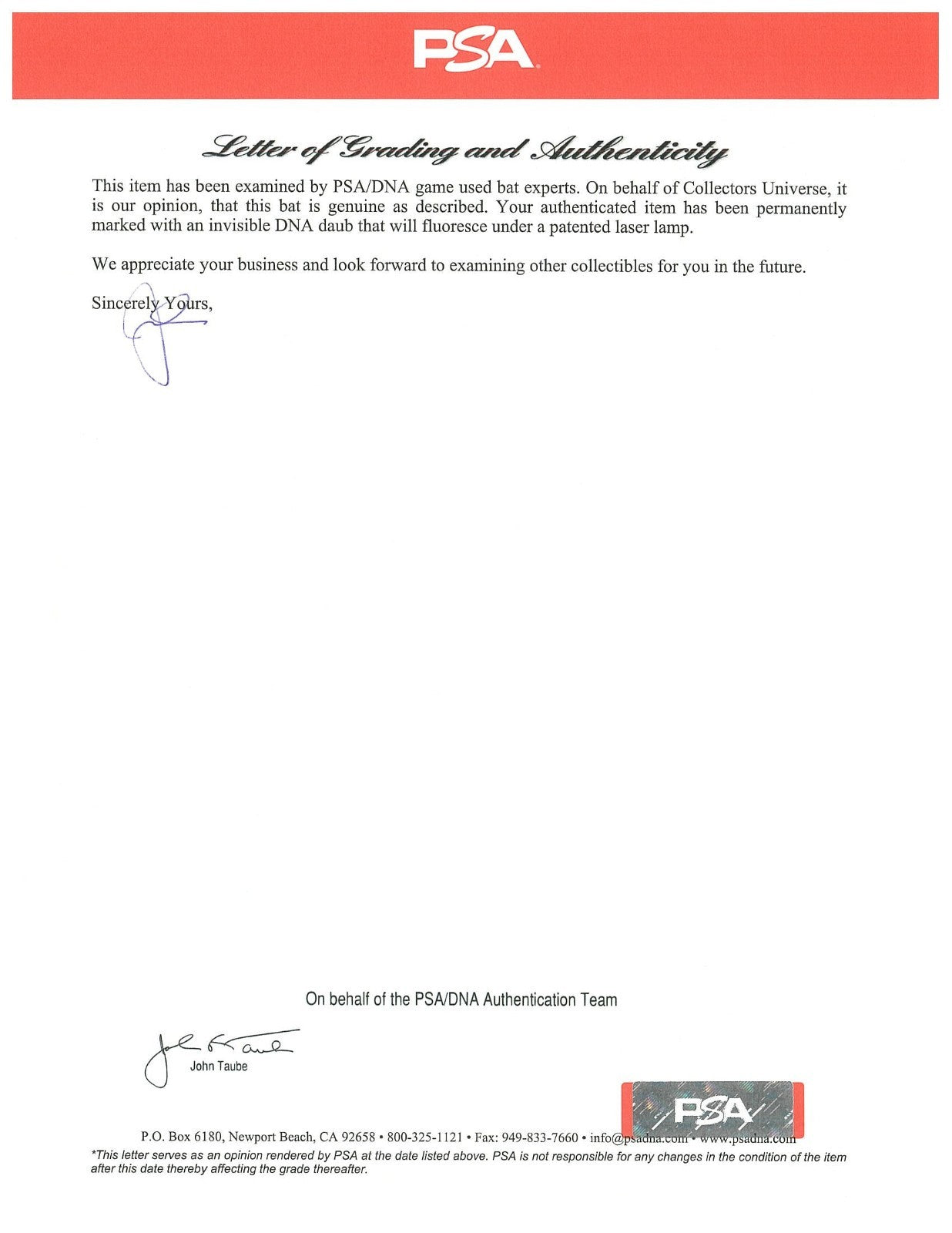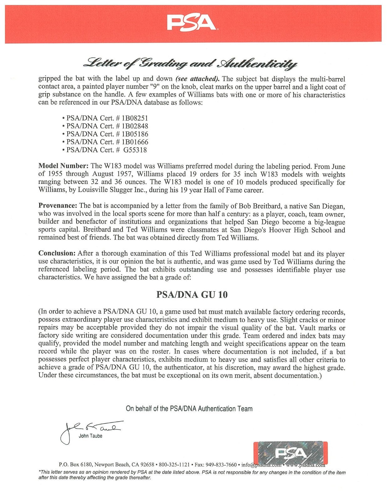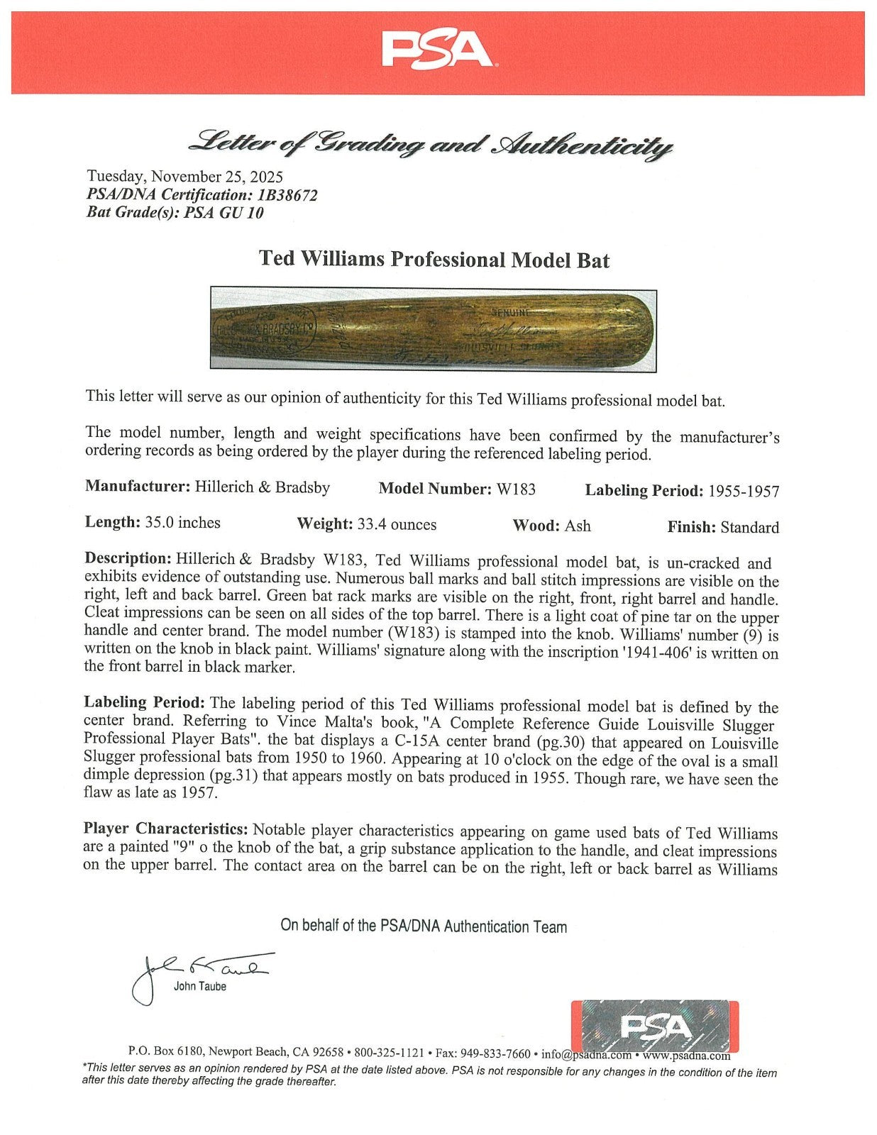 The offered Louisville Slugger Hillerich & Bradsby W183 professional model bat is 35.0 inches in length, weighs 33.4 ounces, and is uncracked with evidence of outstanding use. Numerous ball marks and ball stitch impressions are visible on the right, left, and back of the barrel, which is consistent with Williams alternating between a label-up and label-down batting grip throughout his career. Green bat rack marks are visible on the right, front, right barrel, and handle. The C-15A center brand on the bat consistent is with Louisville Sluggers from 1950 to 1960. Cleat impressions can be seen on all sides of the top barrel. There is a light coat of pine tar on the upper handle and center brand. The model number "W183" is stamped into the knob. Williams' number "9" is handwritten on the knob in black paint. Williams has signed the offered bat, penning his flowing signature in black marker across the barrel, including the inscription "1941-406," an homage to Williams' legendary 1941 season in which he batted .406 and was the last player in history to have hit over .400 in a season. Accompanying the bat is an LOA from PSA/DNA (1B10480), who have assessed the bat with a perfect grade of GU 10 for game use. LOA from JSA for authenticity of signature and inscription.