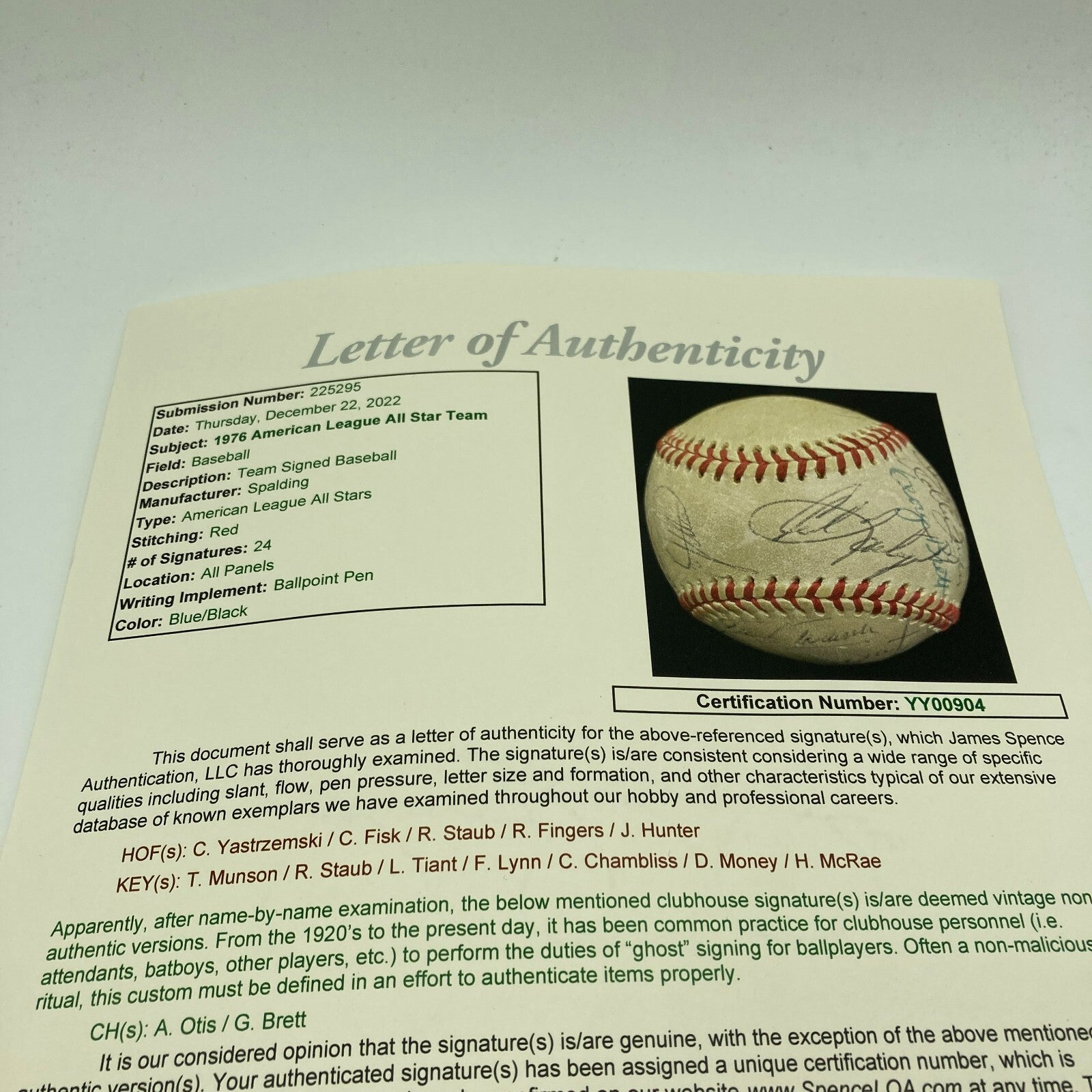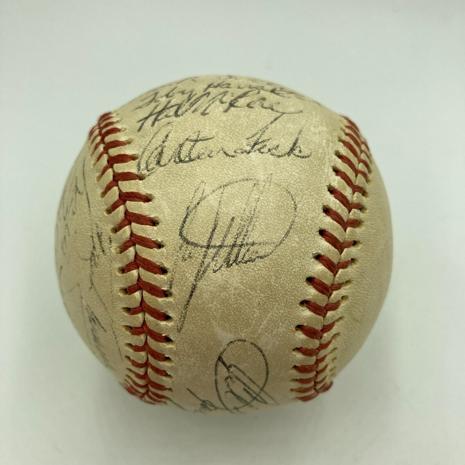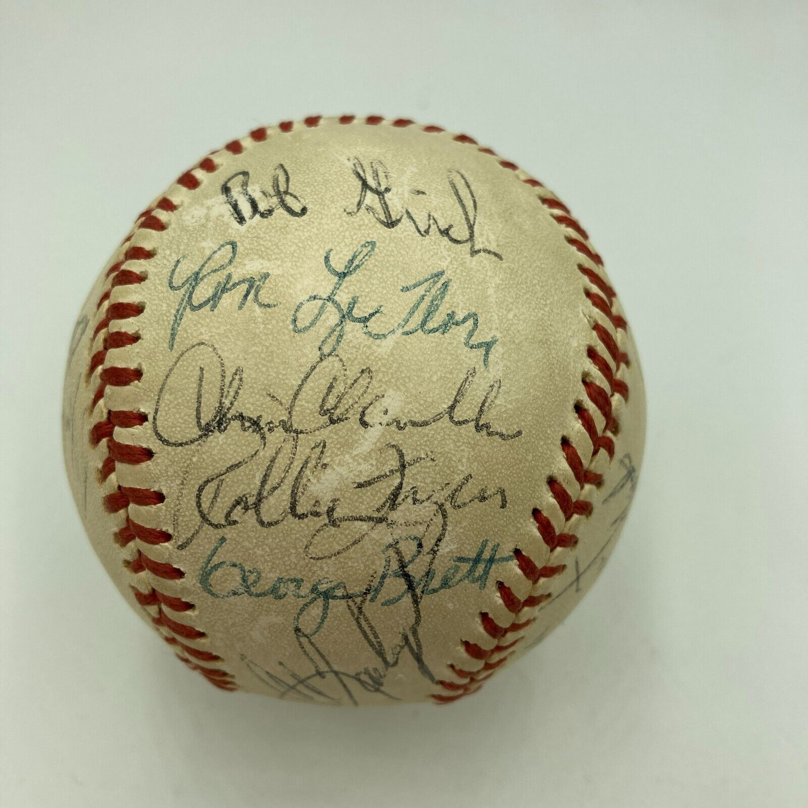 Signed by (24) incl. Munson, Carl Yastrzemski, Carlton Fisk, George Brett, Rollie Fingers, Chris Chambliss, Fred Lynn, Rusty Staub, Catfish Hunter, Sparky Lyle, Luis Tiant, Amos Otis, and others. Brett and Otis are clubhouse.
