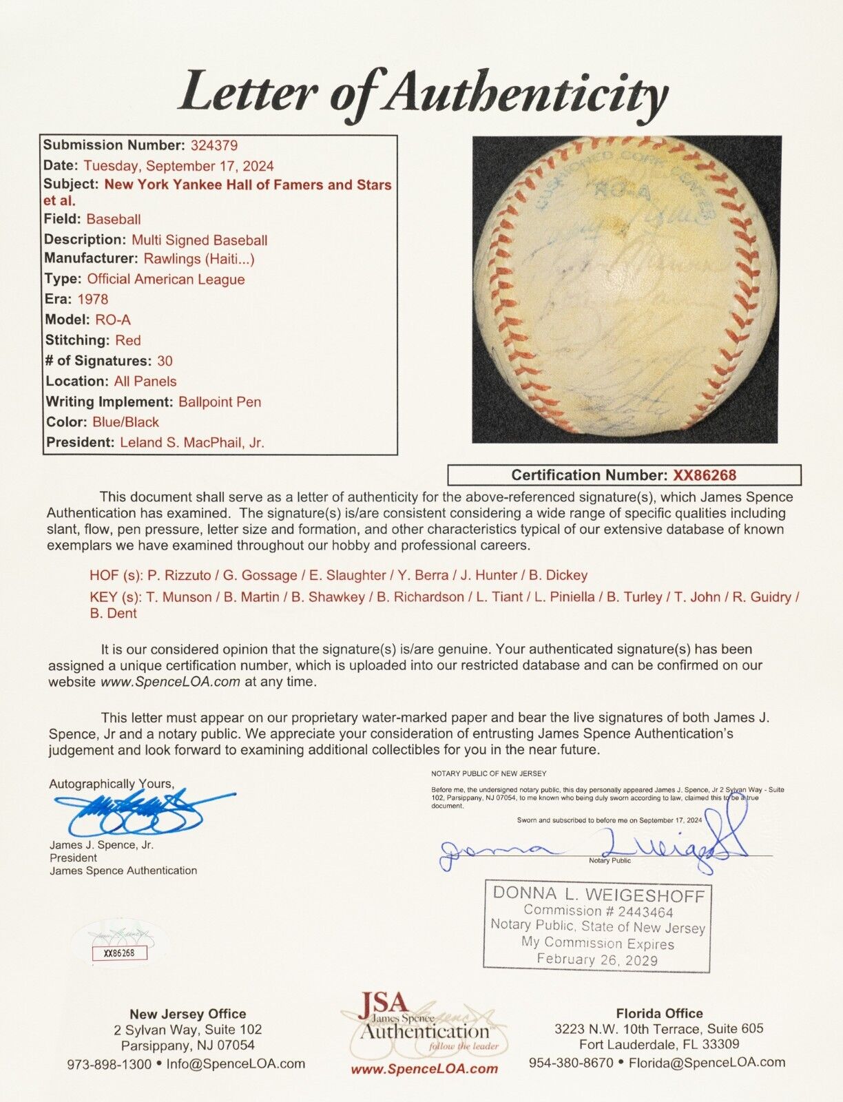 Official American League baseball (MacPhail) signed in either black or blue ink by 30 former members of the New York Yankees, including Munson, Dickey, Berra, Rizzuto, Gossage, Hunter, Slaughter, Martin (sweet spot), Shawkey, Richardson, Tiant, Piniella, Turley, John, Guidry, Dent, and Bauer. This ball was almost certainly signed at a Yankees old timers' day event and features a nice mix of players spanning three decades of franchise history. The ball, which dates from the 1978 era, displays light overall age toning and a few spots of discoloration. In Excellent condition overall. Full LOA from James Spence/JSA.