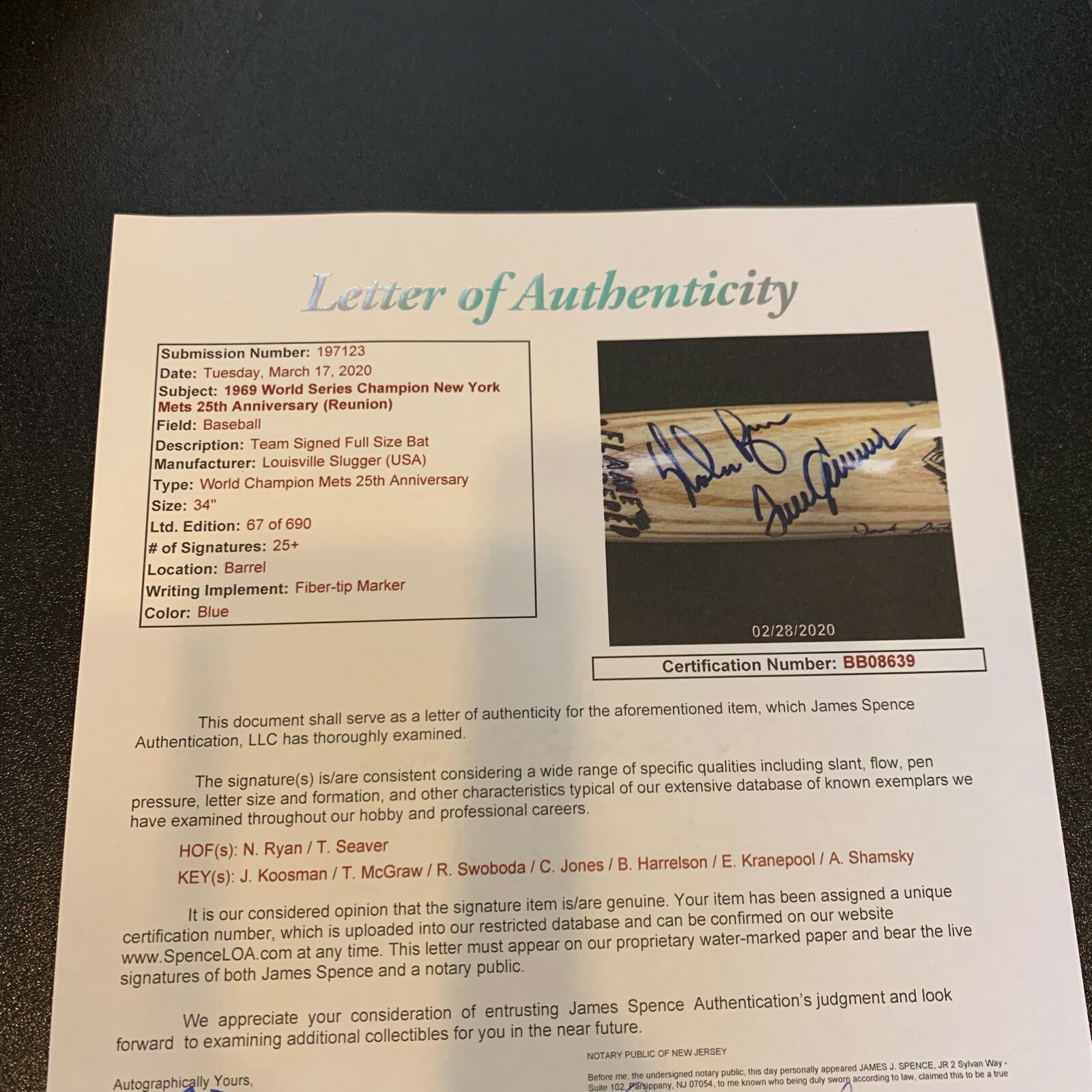 1969 New York Mets World Series Champs Team Signed Bat Nolan Ryan Tom Seaver JSA