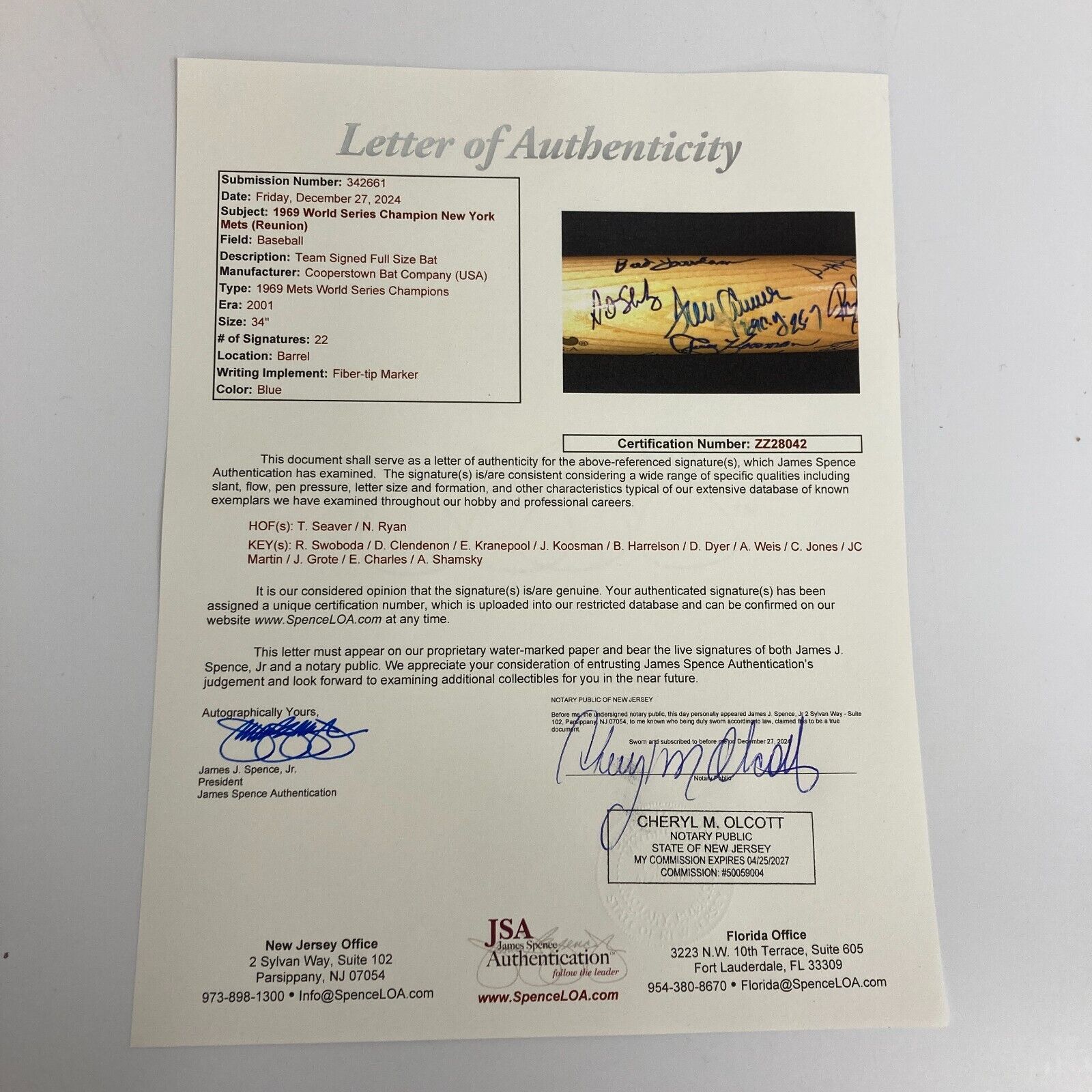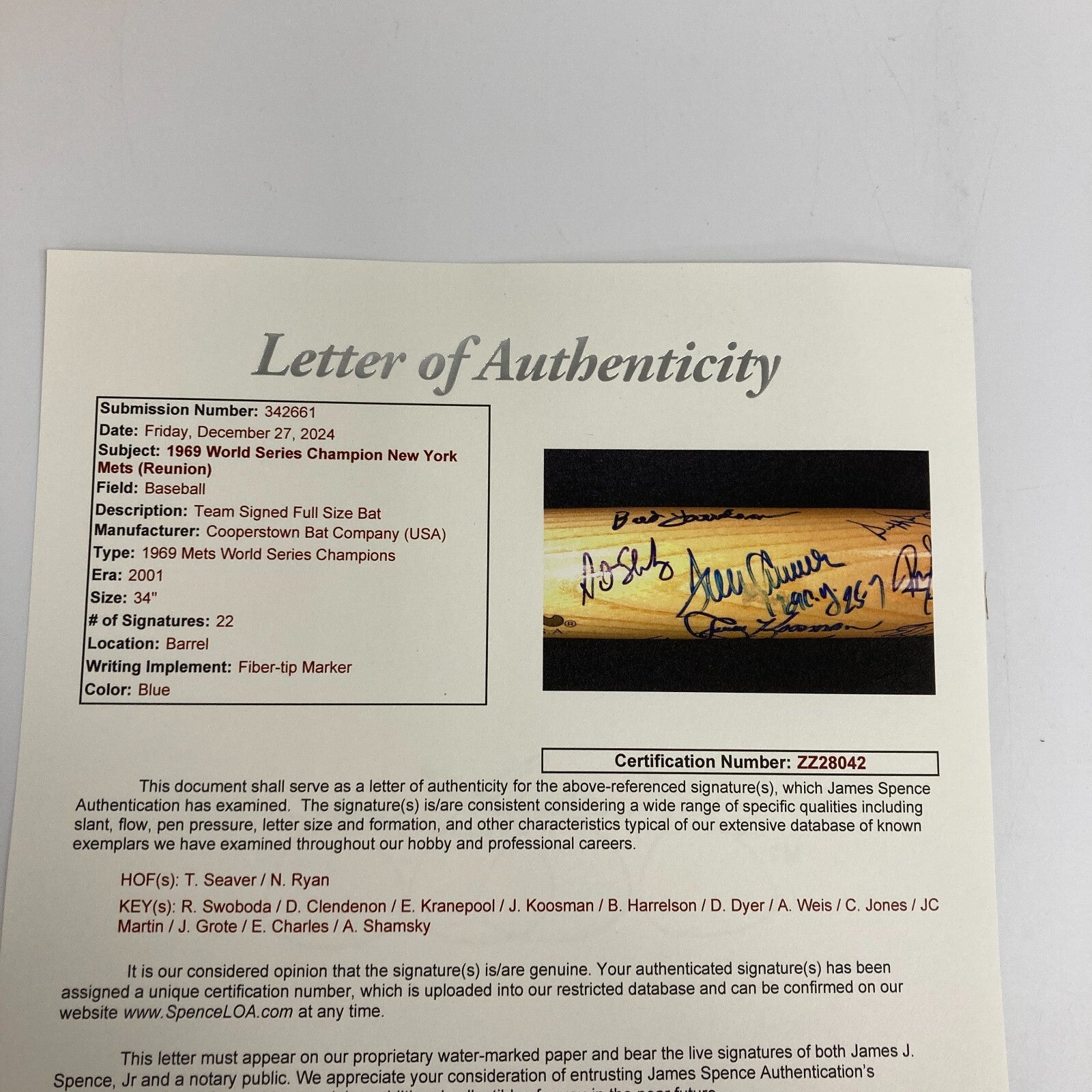 1969 New York Mets World Series Champs Team Signed Cooperstown Bat. 22 Sigs. Nolan Ryan, Tom Seaver and many others.