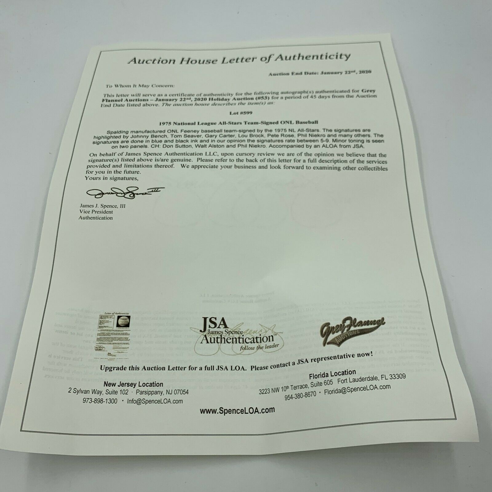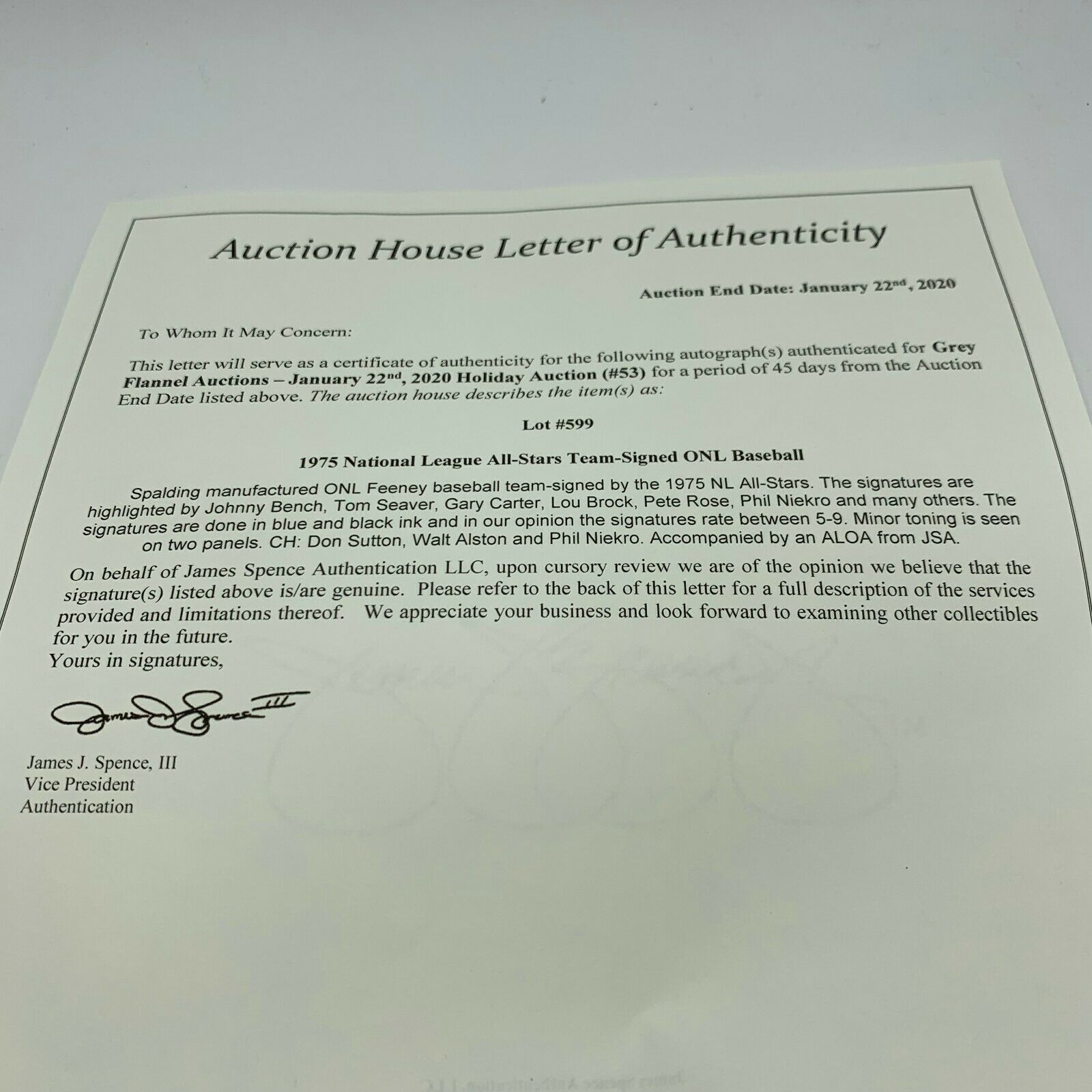 Spalding National League Feeney baseball team-signed by the 1975 NL All-Stars. The signatures are highlighted by Johnny Bench, Tom Seaver, Gary Carter, Lou Brock, Pete Rose, Phil Niekro and many others. CH: Don Sutton, Walt Alston and Phil Niekro.