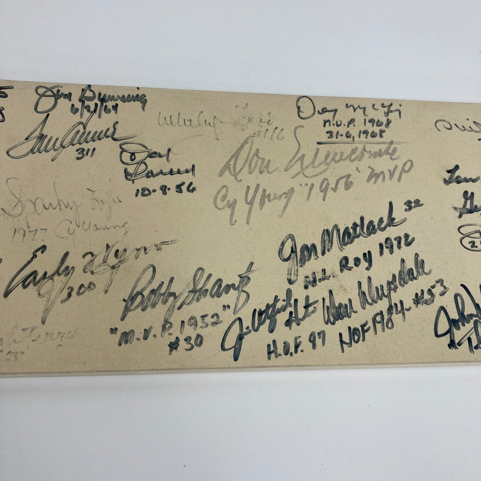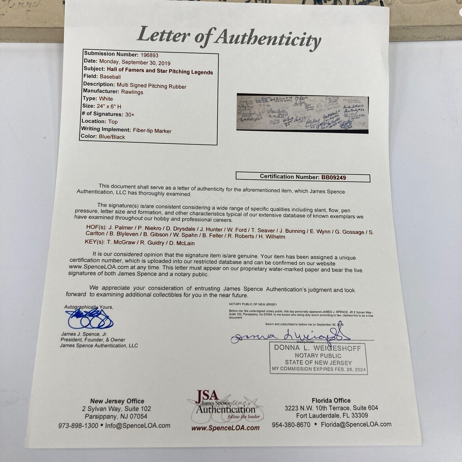 Signed by over (30) Hall of Famer and star pitchers, many of whom have added relevant inscriptions. Notables include Tom Seaver, Bob Gibson, Steve Carlton, Jim Palmer, Phil Niekro, Catfish Hunter, Whitey Ford, Don Drysdale, Jim Bunning, Early Wynn, Goose Gossage, Bert Blyleven, Warren Spahn, Bob Feller, Robin Roberts, Hoyt Wilhelm, Tug McGraw, and Denny McLain. Includes full LOA from JSA.