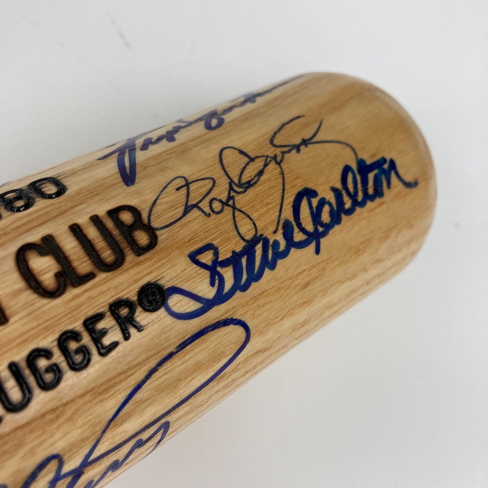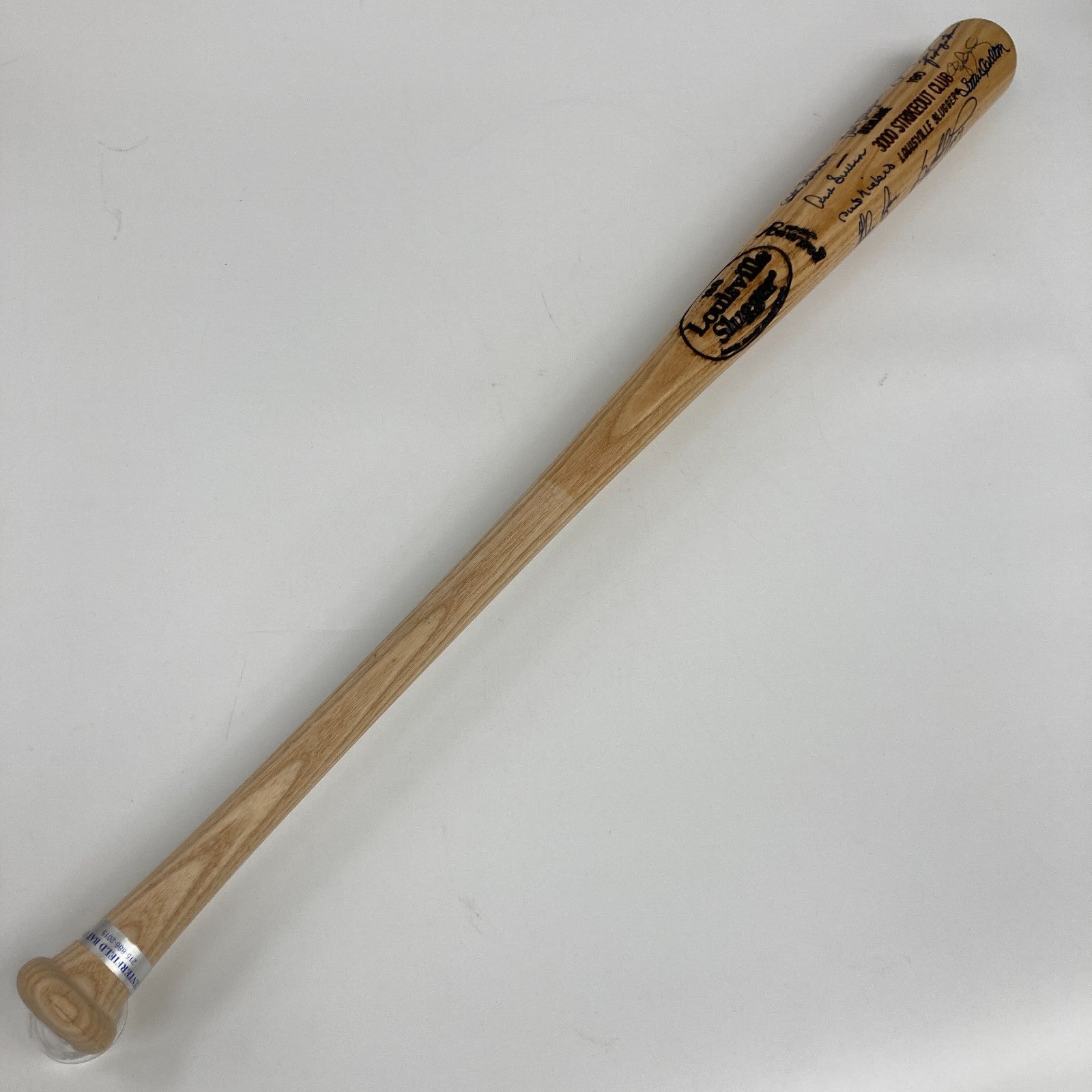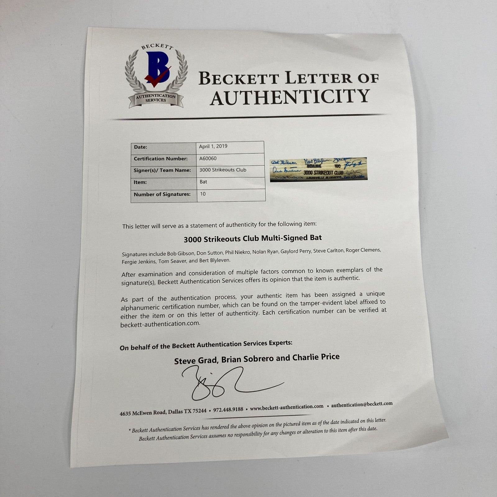 Offered is a 3,000 Strikeouts Louisville Slugger commemorative bat, signed by 10 members of the vaunted 3,000 Strikeout Club with a blue marker. Key signatures include those of Hall of Famers Nolan Ryan, Tom Seaver, Bob Gibson, Steve Carlton, Gaylord Perry, Fergie Jenkins, Bert Blyleven, Phil Niekro, and Don Sutton, along with an additional signature from Roger Clemens. The bat is accompanied by an LOA from Beckett for the signatures.