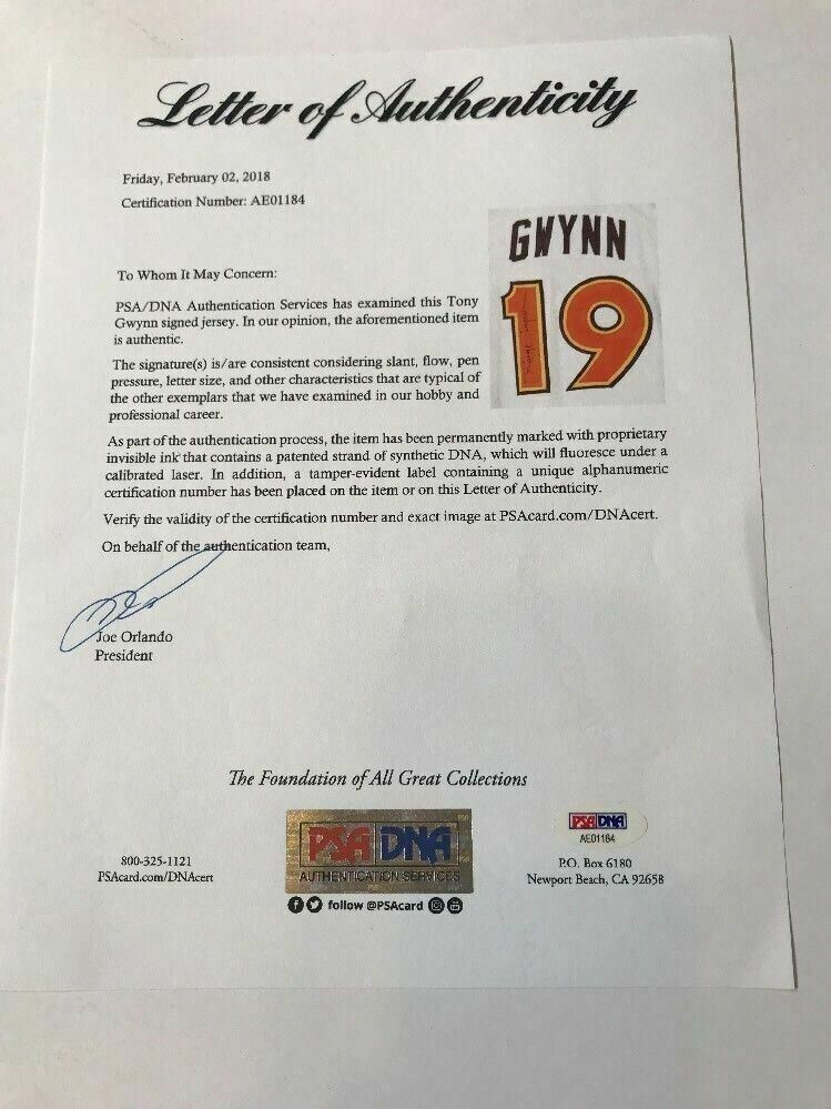 "Padres" is expressed across the chest. Brown/orange/yellow trim surrounds the neck and both arm inserts. A period Wilson size tag resides in the collar while a single "19 84" swatch (player number and year) is located in the tail. Gwynn signed the reverse number in black felt tip. Full LOA from PSA/DNA And Full LOA from SGC Authentic.