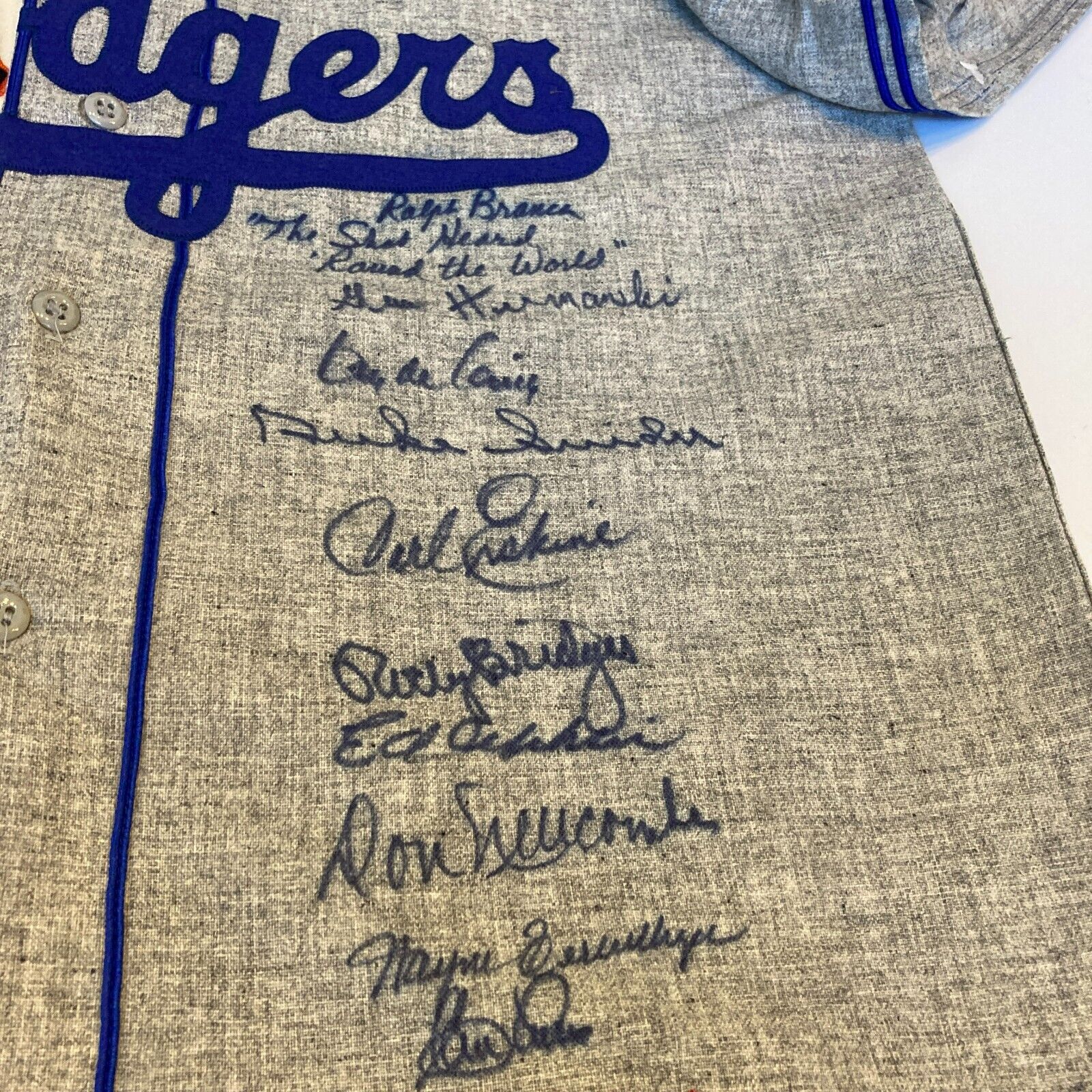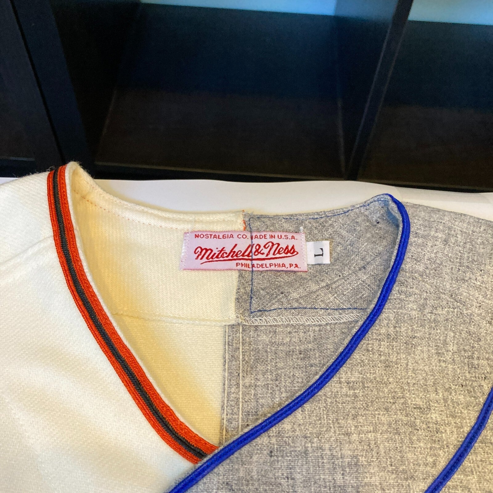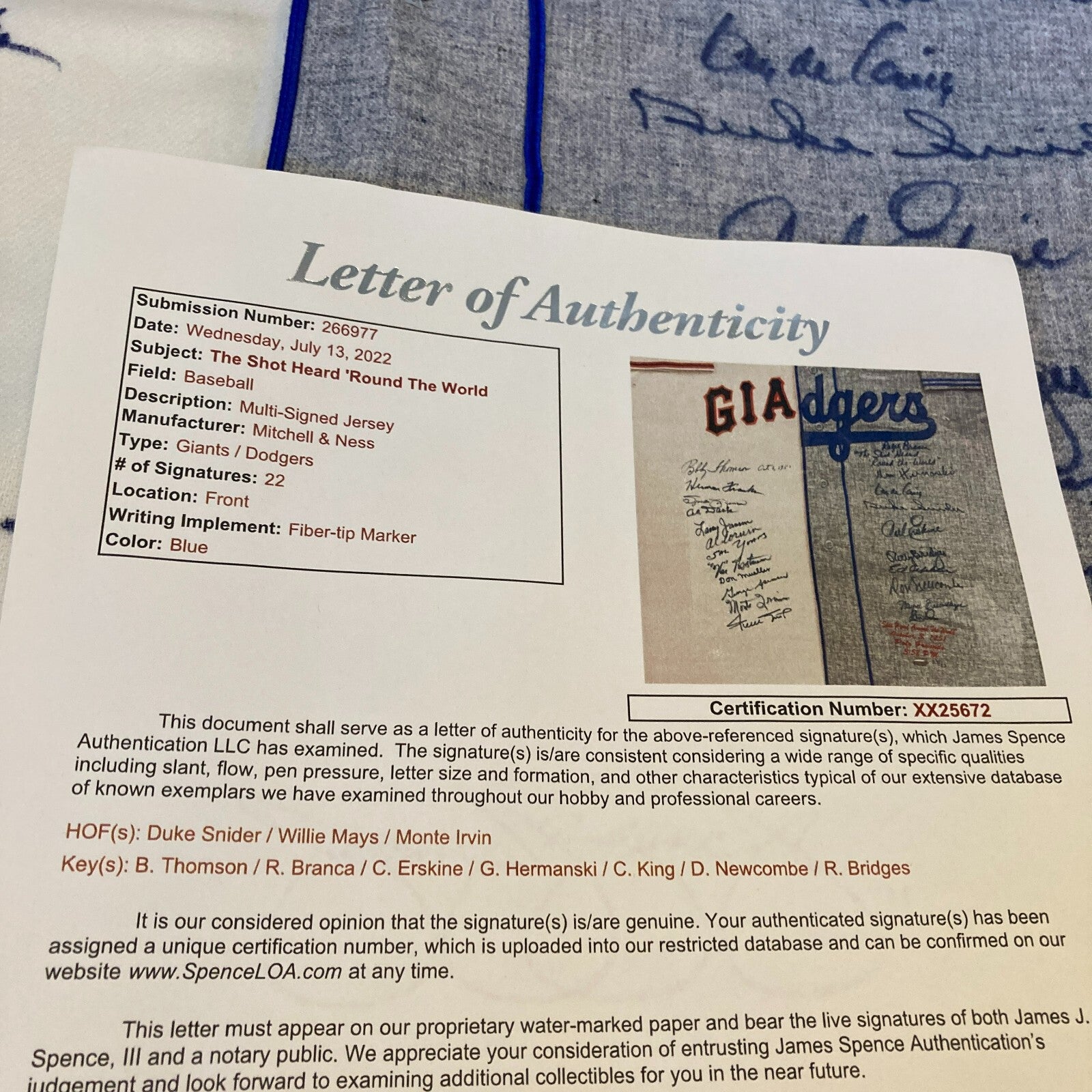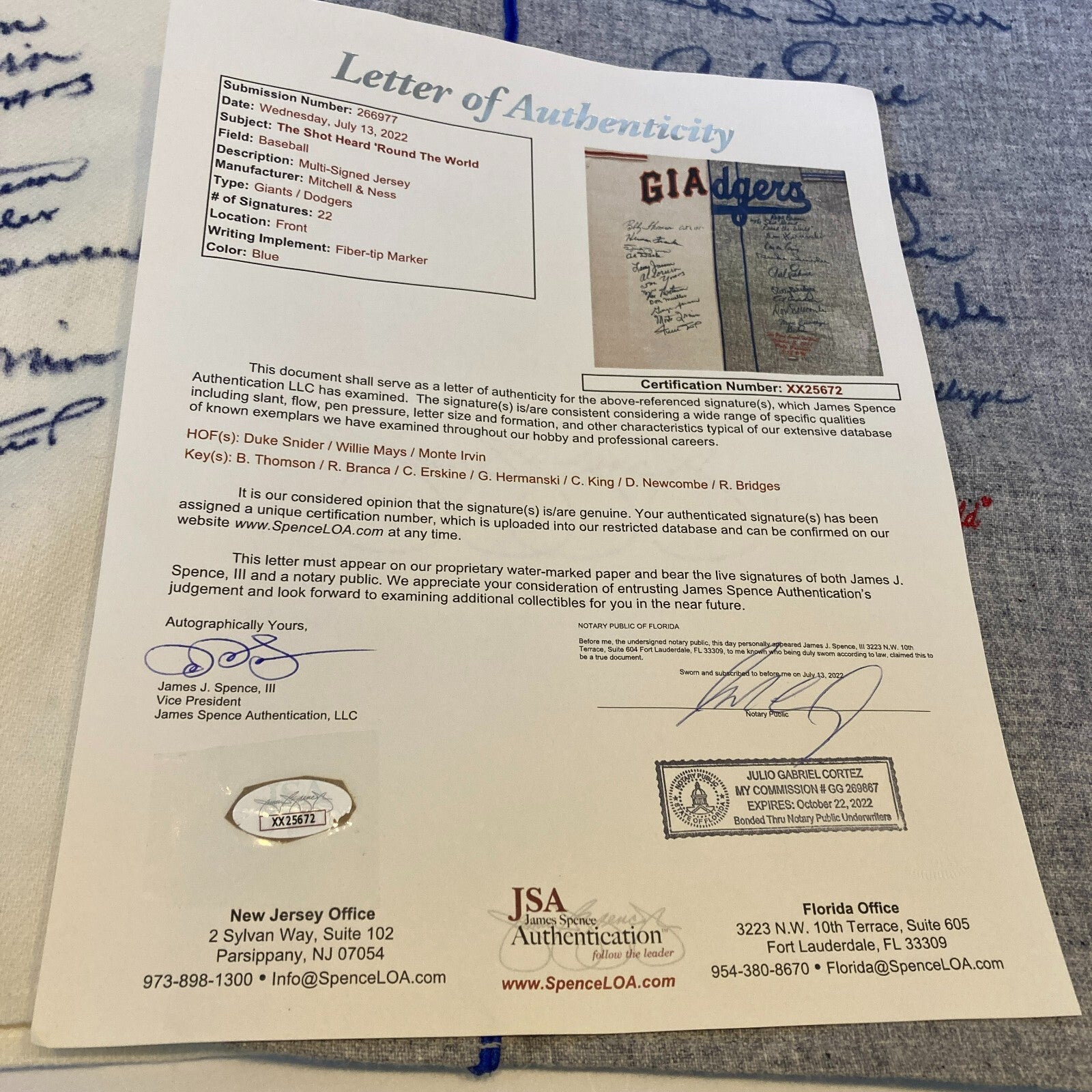 1951 Giants and Dodgers "Shot Heard Round The World" autographed limited edition Mitchell & Ness jersey. Special edition throwback jersey done by Mitchell & Ness to represent the Giants on one side and the Dodgers on the other. It has been signed by (22) participants in the famed 1951 National League playoff "Shot Heard Round The World" game with notables including Willie Mays, Monte Irvin, Duke Snider, Bobby Thomson, Ralph Branca, and Don Newcombe. Marker signatures rate 8 to 9 out of 10. Commemorative text is embroidered on the front tail above "23/23" numbering. Framed to 42"x54" for display. Includes full LOA from JSA and there is Steiner authentication hologram affixed.