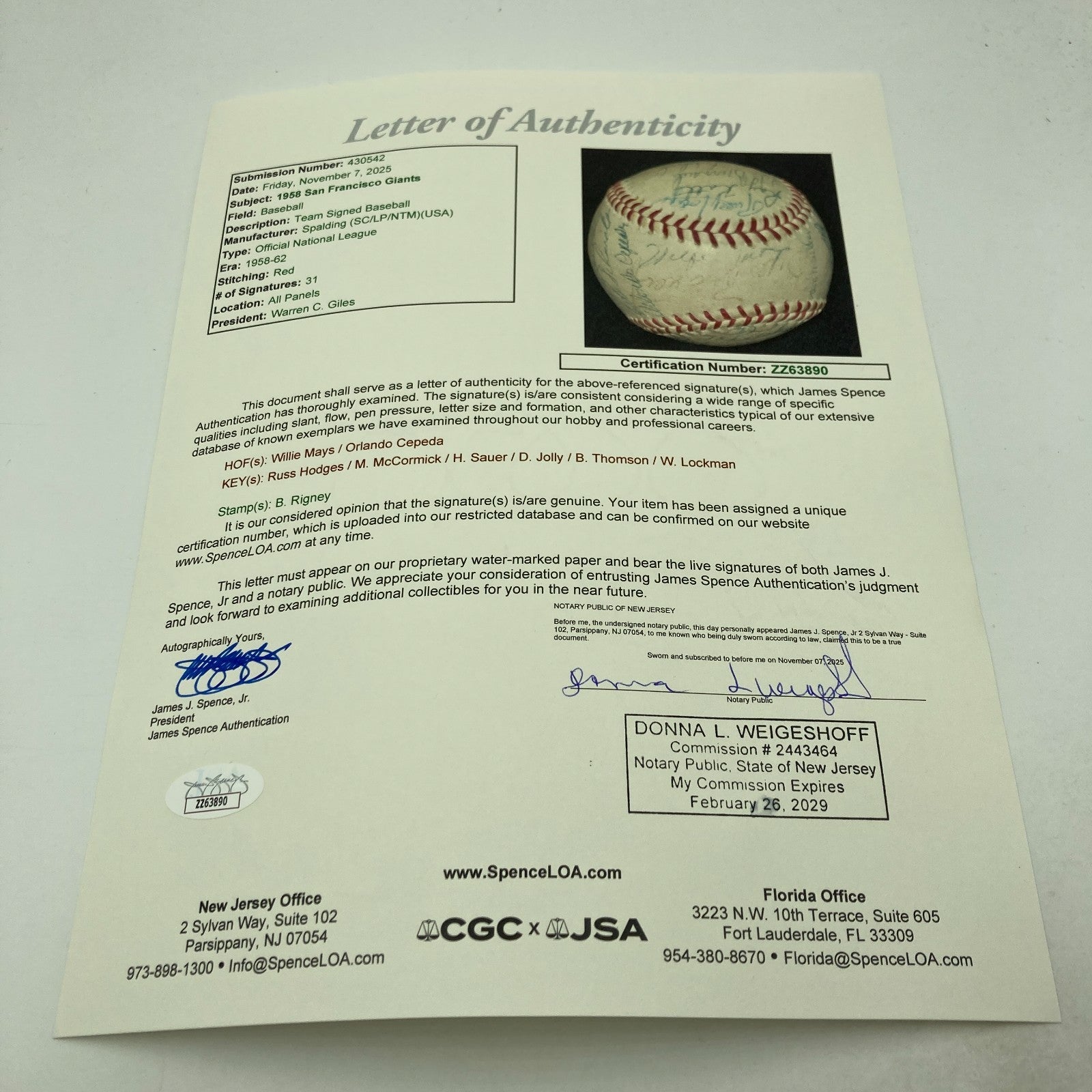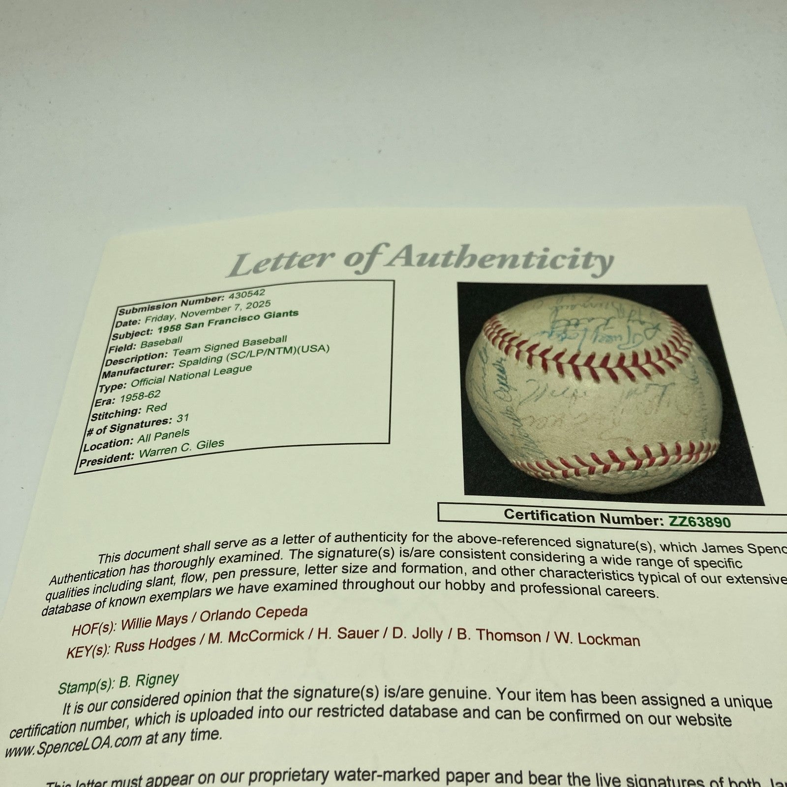 1958 San Francisco Giants Team Signed Official National League Baseball. 31 signatures with: