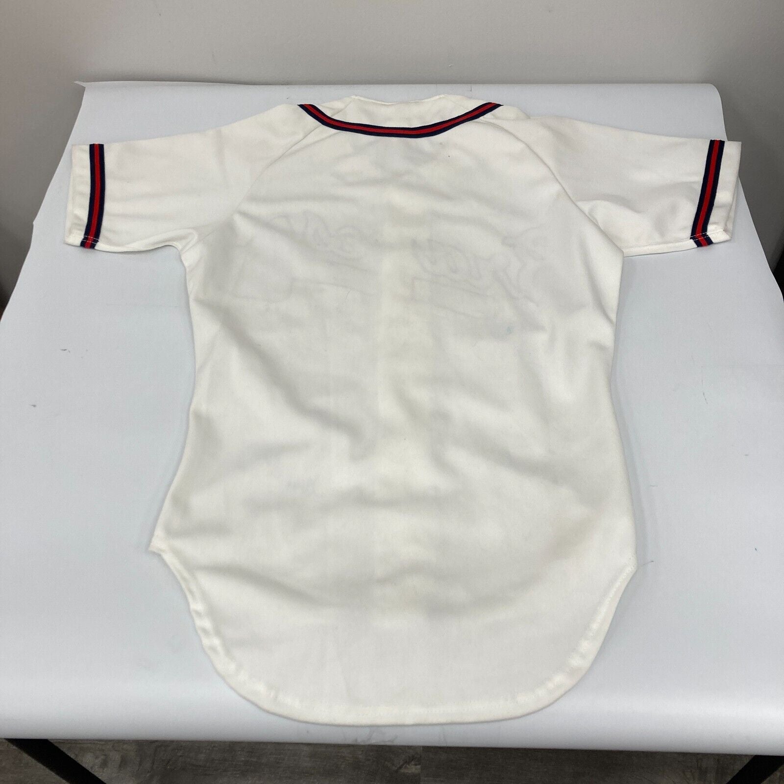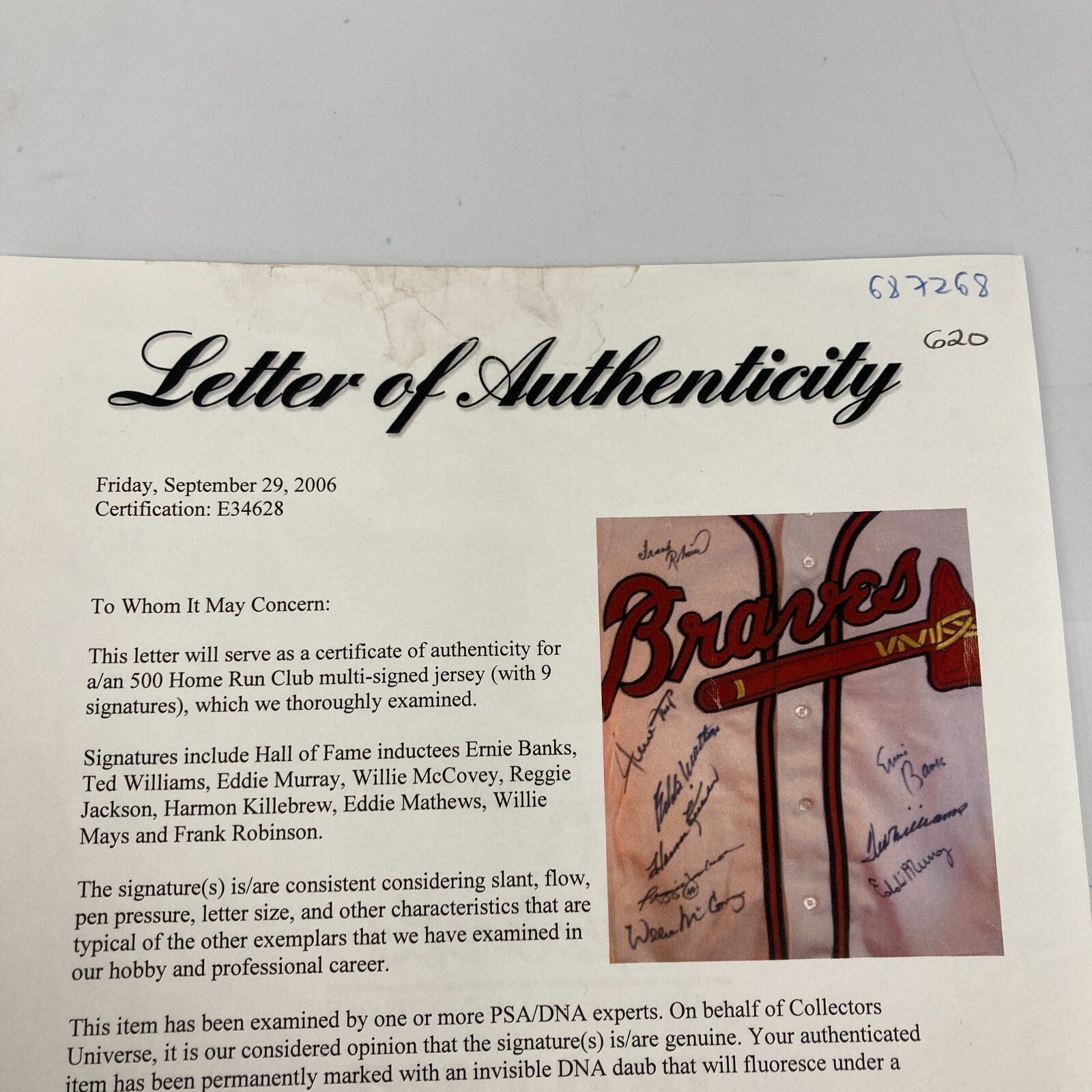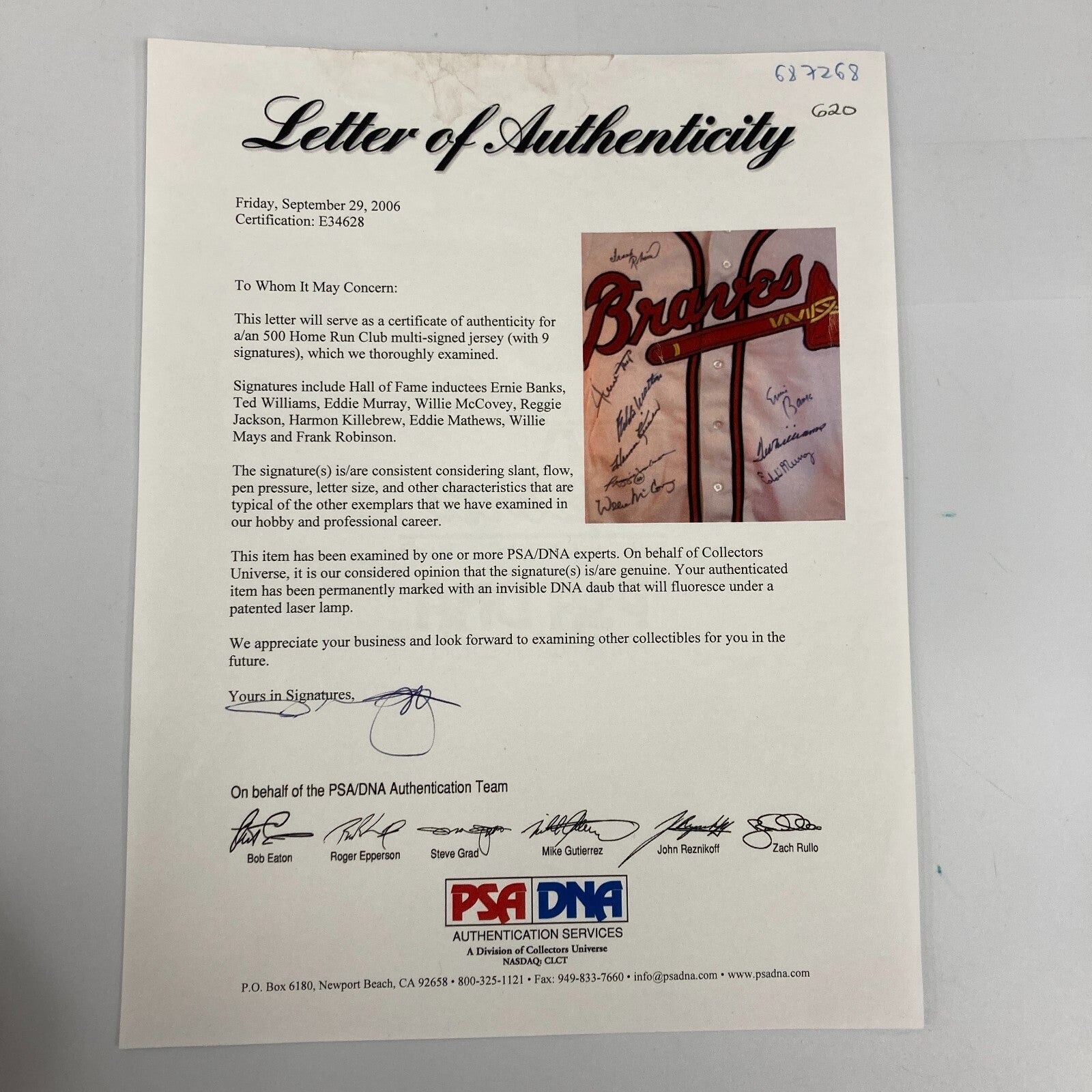 Far more scarce and desirable than posters and lithographs bearing the signatures of the "Original Eleven", this Rawlings Atlanta Braves jersey is blessed with the full contingent of blue sharpie autographs. Ted Williams, capable of bringing four figures on a jersey solo, is joined by Hank Aaron, Harmon Killebrew, Willie Mays, Frank Robinson, Mike Schmidt, Reggie Jackson, Willie McCovey, Eddie Mathews and Ernie Banks. The result is a gorgeous display piece from this exclusive club.