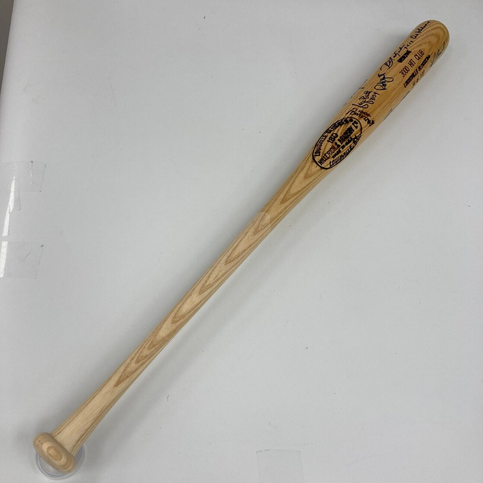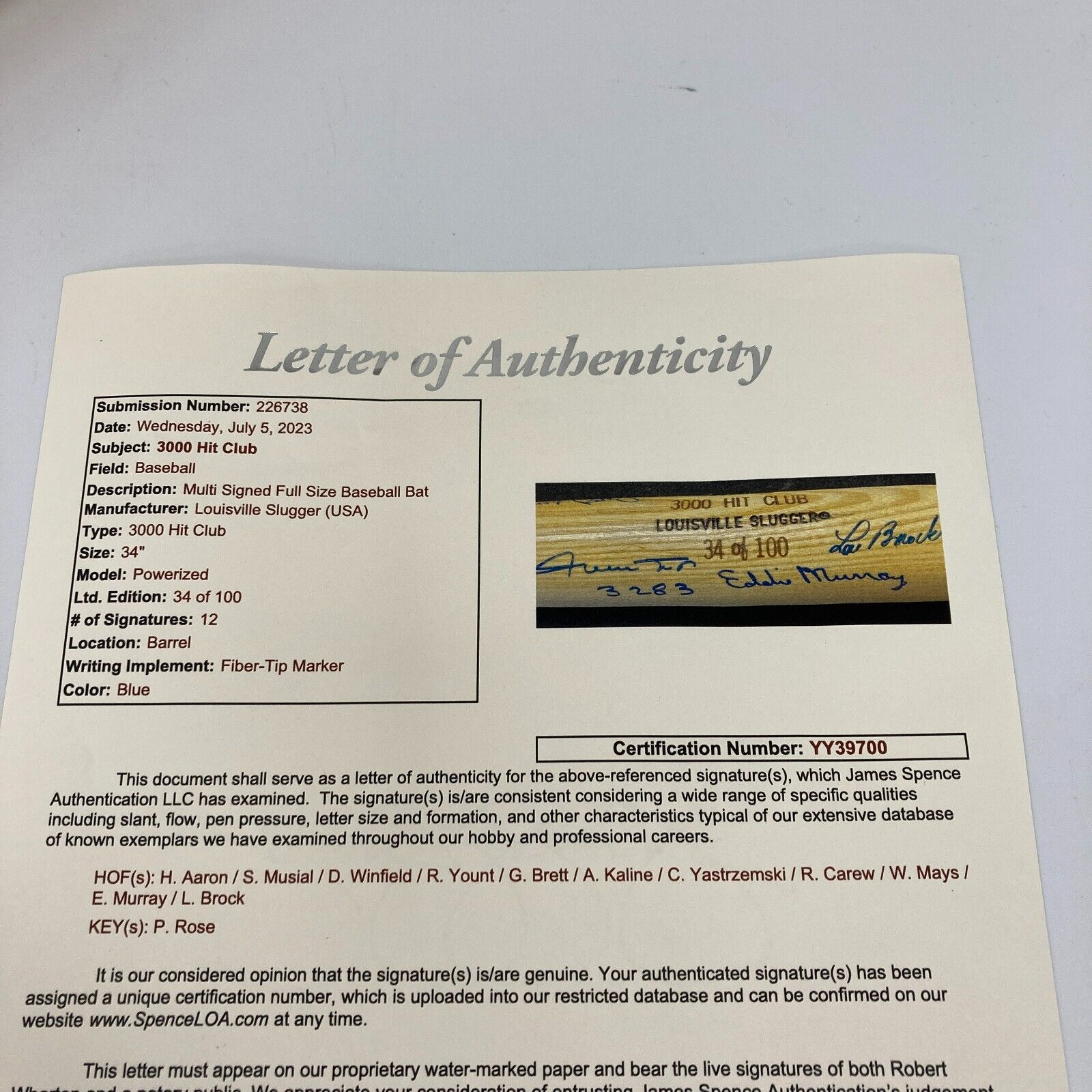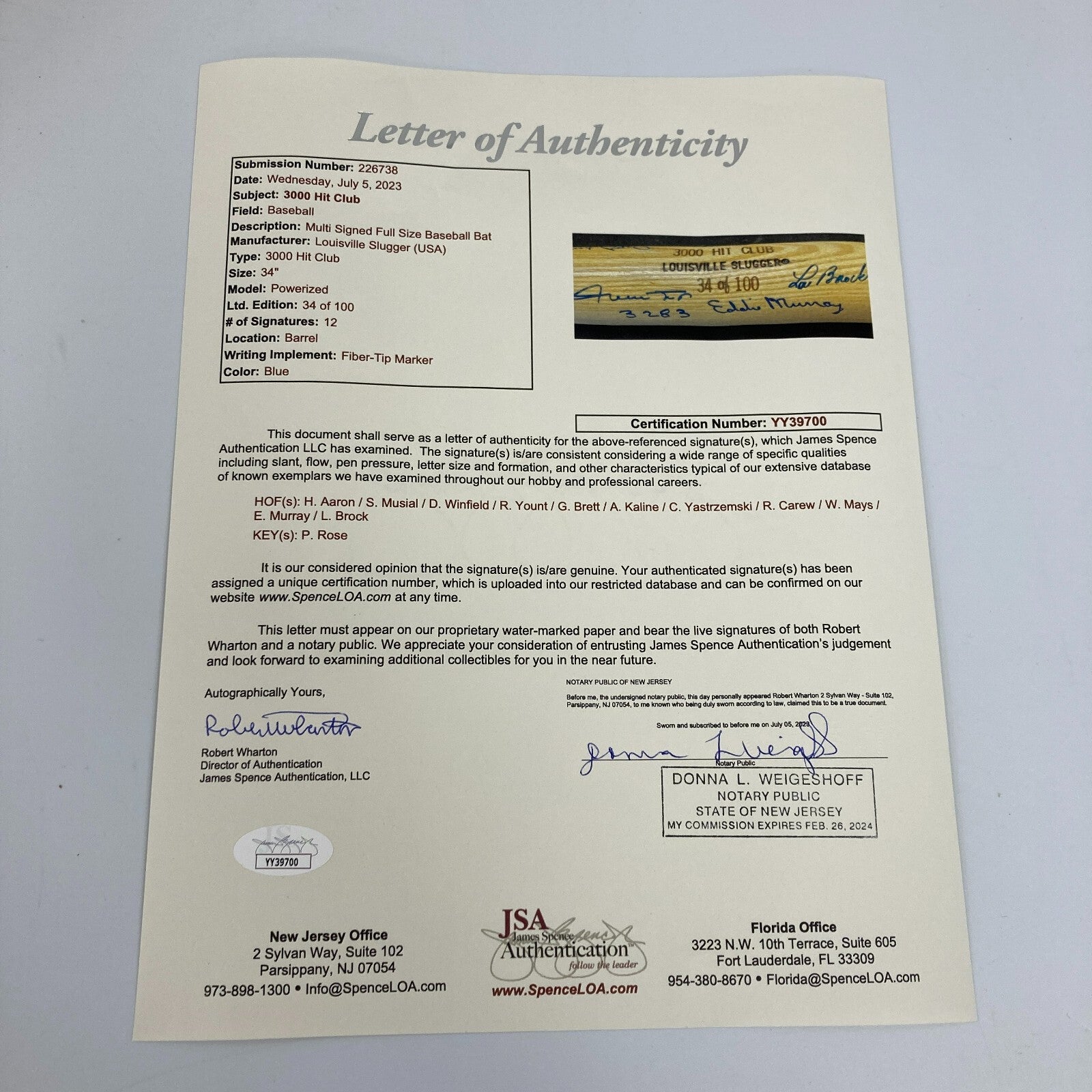 Beautiful H&B "3000 Hit Club" commemorative bat signed in blue marker by the following 12 members: Pete Rose, Stan Musial, Hank Aaron, Willie Mays, Dave Winfield, Robin Yount, Carl Yastrzemski, George Brett, Al Kaline, Lou Brock, Eddie Murray, and Rod Carew. The bat is stamped "34 of 100" along the barrel. Full LOA from James Spence/JSA.