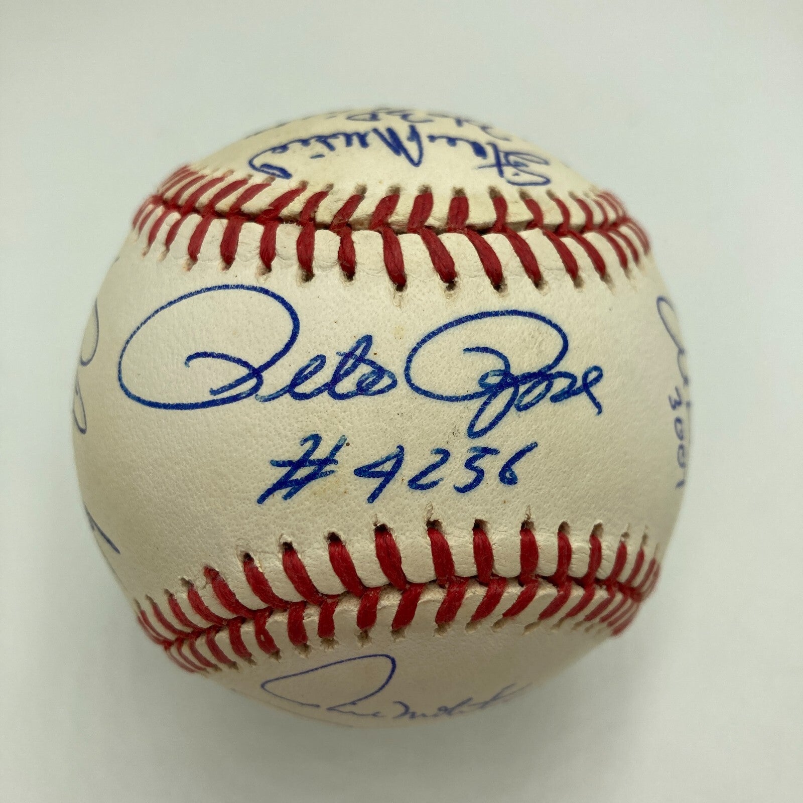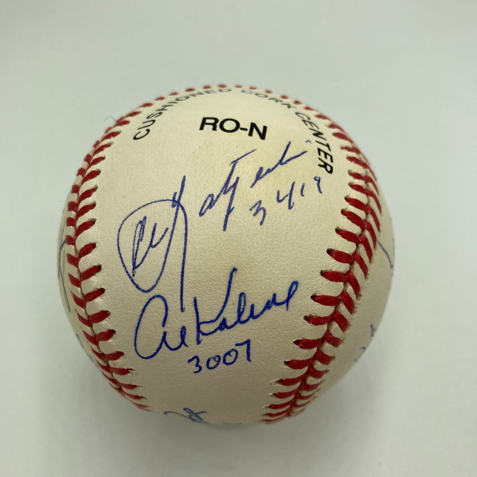 Rawlings W.White Official National League ball has been signed by Willie Mays, Hank Aaron, Pete Rose, Al Kaline, Carl Yastrzemski, Paul Molitor, Stan Musial, Robin Yount, Lou Brock, Rod Carew, and George Brett. Each player except Molitor has inscribed their hit total.