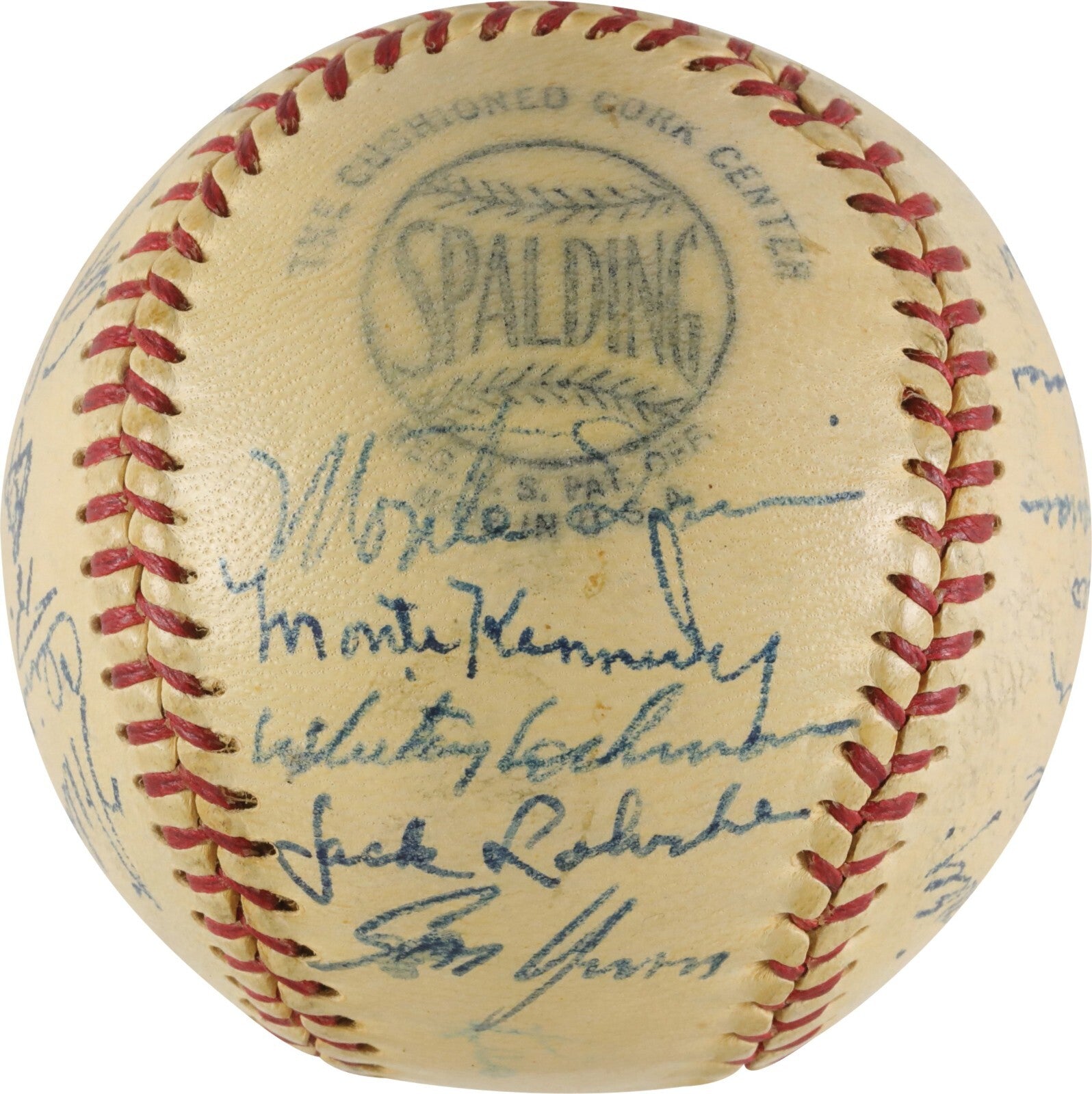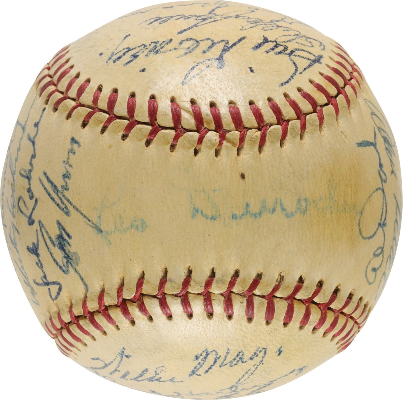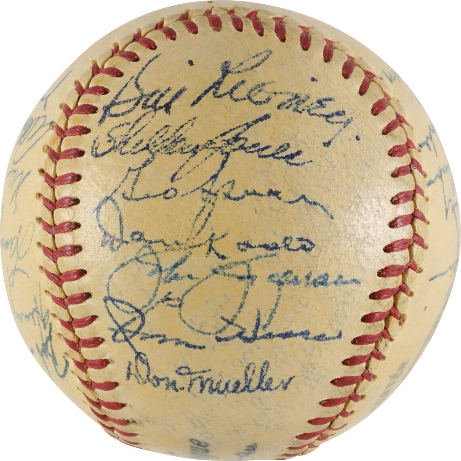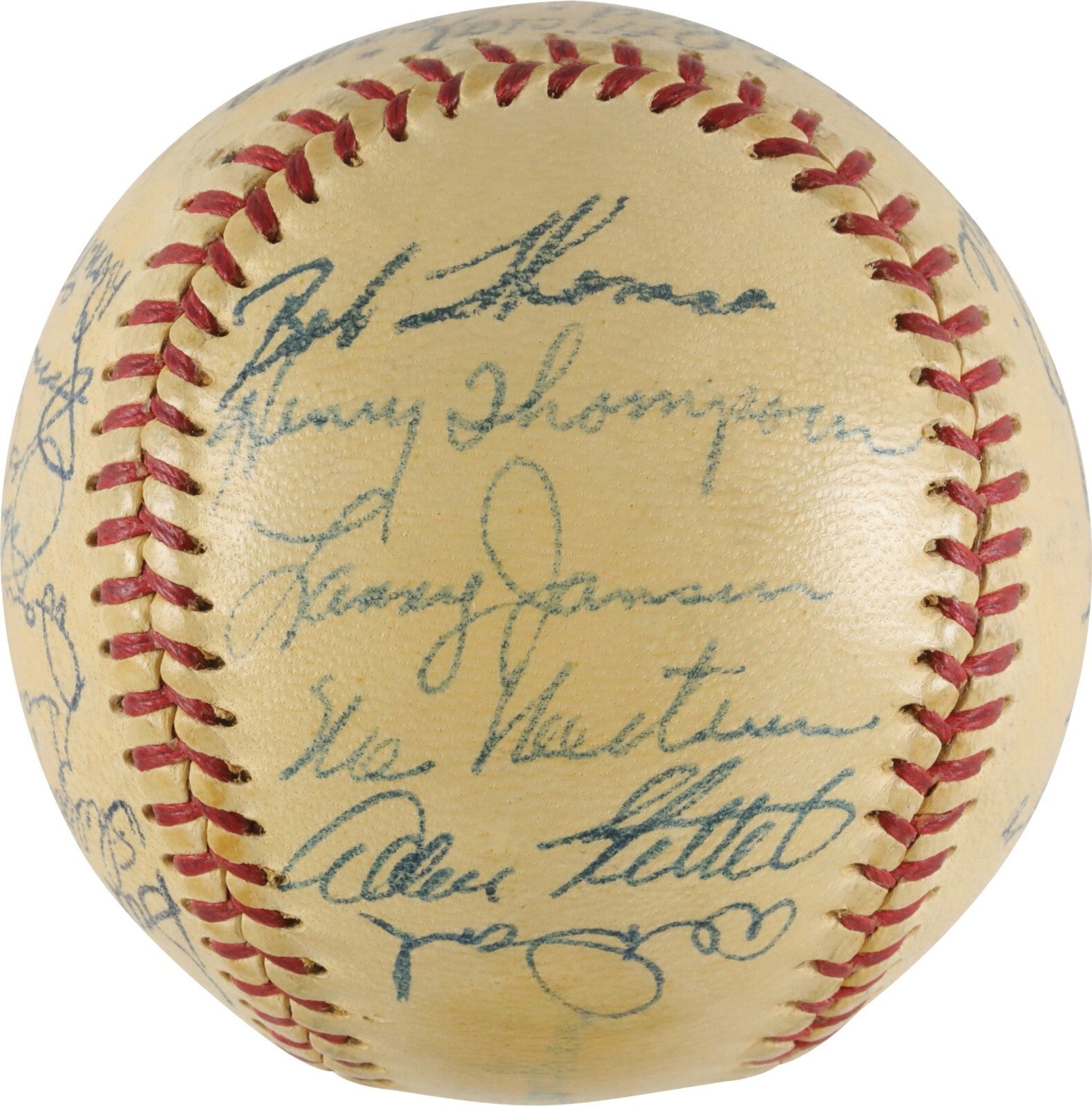 Presented is the opportunity to possess a 1951 New York Giants team-signed ball with twenty-five (25) autographs. This '51 Giants team accomplished the legendary "Miracle of Coogan's Bluff," when the team trailed the rival Brooklyn Dodgers by 13.5 games in mid-August, were tied with the Dodgers at the end of the regular season, and then won the final game of a three-game playoff for the National League pennant on a ninth-inning three-run walk-off home run by Bobby Thomson. The Thomson home run in this game has been rated by many experts as the most exciting moment in baseball history. Signatures: Hall of Famer Willie Mays (rookie), Bobby Thomson, Hall of Fame manager Leo Durocher, Hall of Famer Monte Irvin (the Giants' first African American player), Sal Maglie, Eddie Stanky, Don Mueller, Bill Rigney, Al Dark, Henry Thompson, Wes Westrum, Whitey Lockman, Larry Jansen, and more. The Official National League (Frick) ball is in excellent condition with bold blue signatures.  Full LOA from PSA.
