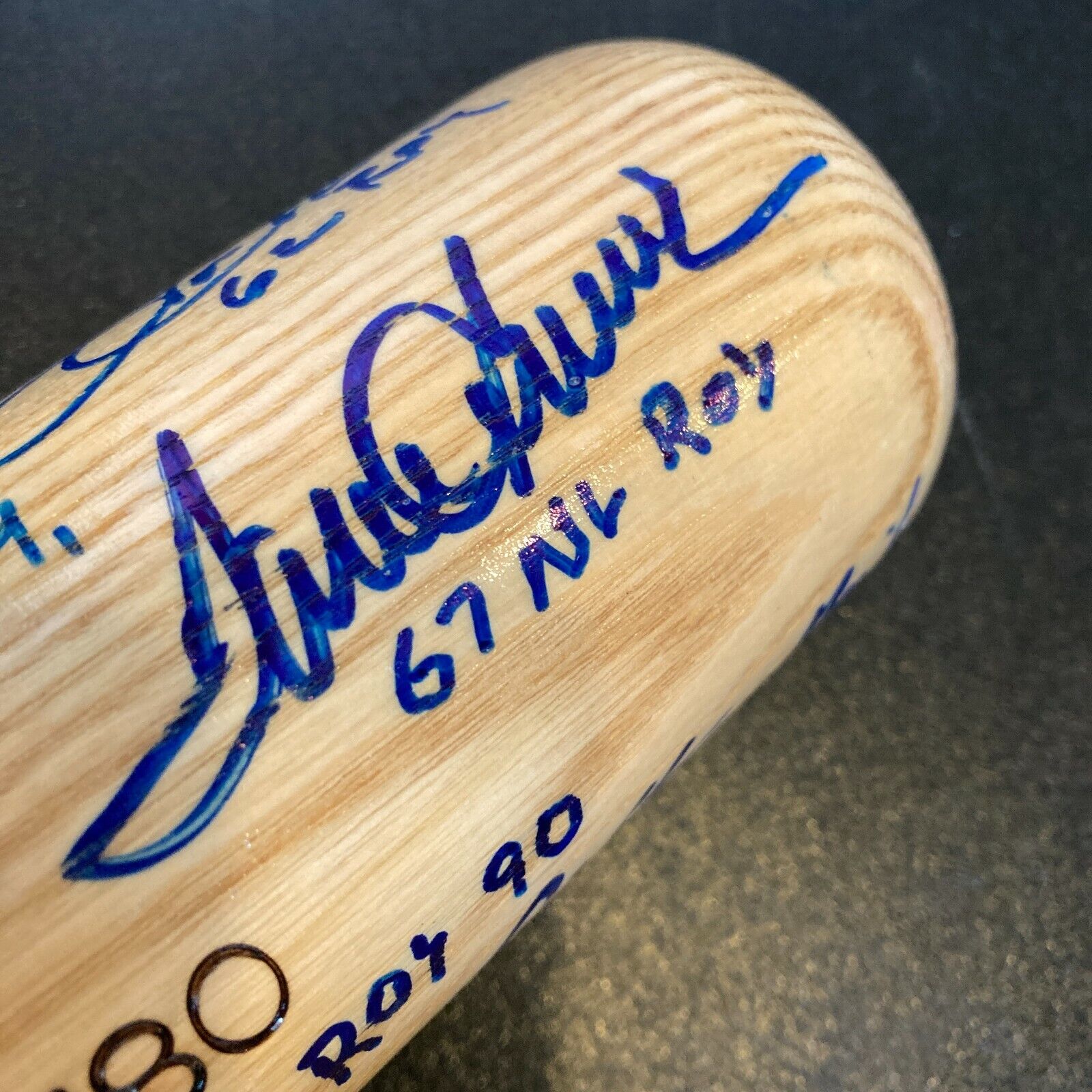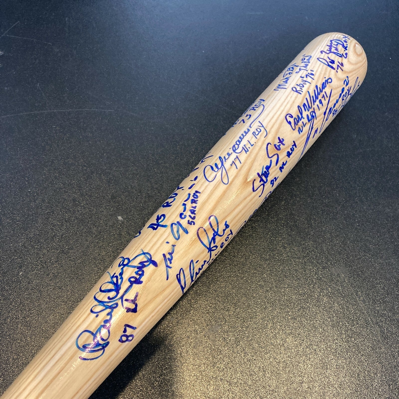Louisville Slugger bat signed by 24 Rookie of the Year winners in Major League Baseball. The signatures on this bat include the Hall of Famers Willie Mays, Carlton Fisk, Tom Seaver, Luis Aparicio, Billy Williams, and Andre Dawson, while the remaining signatures include Doc Gooden, Don Newcombe, Darryl Strawberry, David Justice, Fred Lynn, John Montefusco, Gil McDougald, Mark Fidrych, Benito Santiago, Steve Sax, Earl Williams, Pat Zachry, Pete Rose, Chris Sabo, Jose Canseco, Frank Howard, Tom Tresh, and John Castino. The signatures have been written in blue marker. The signers added an inscription of their Rookie of the Year season. This lot comes with a LOA from JSA (Z75097).