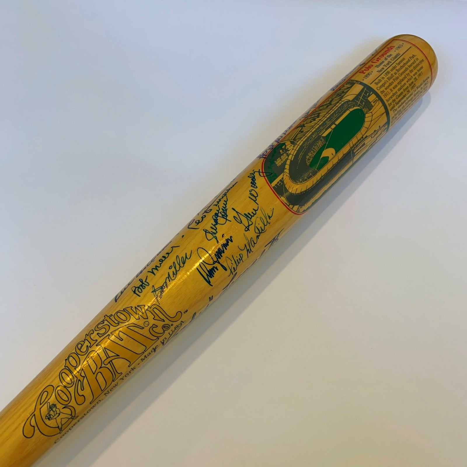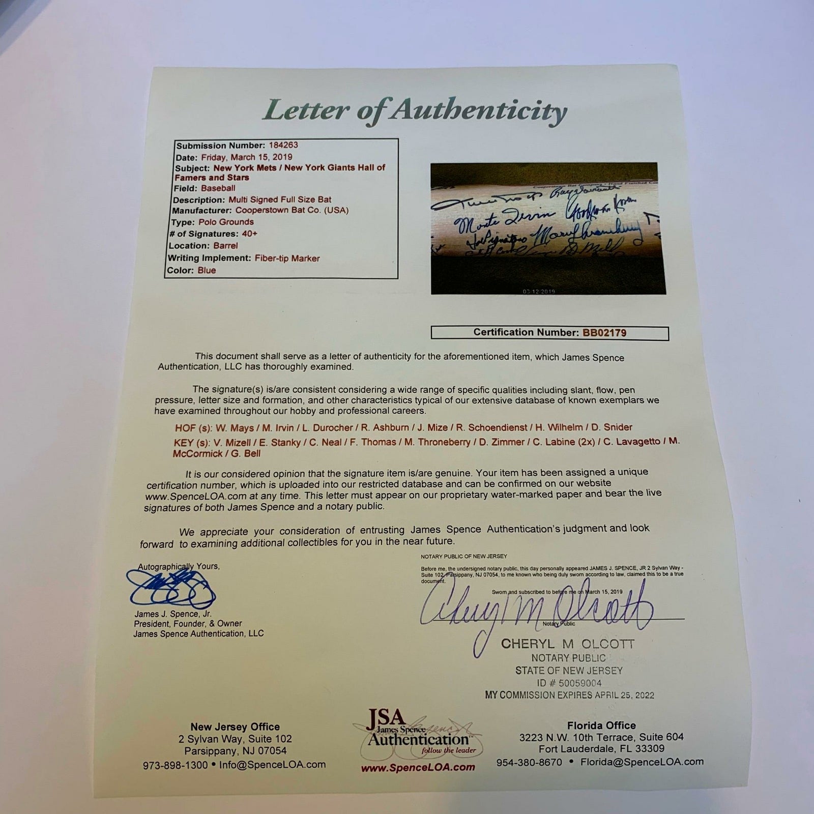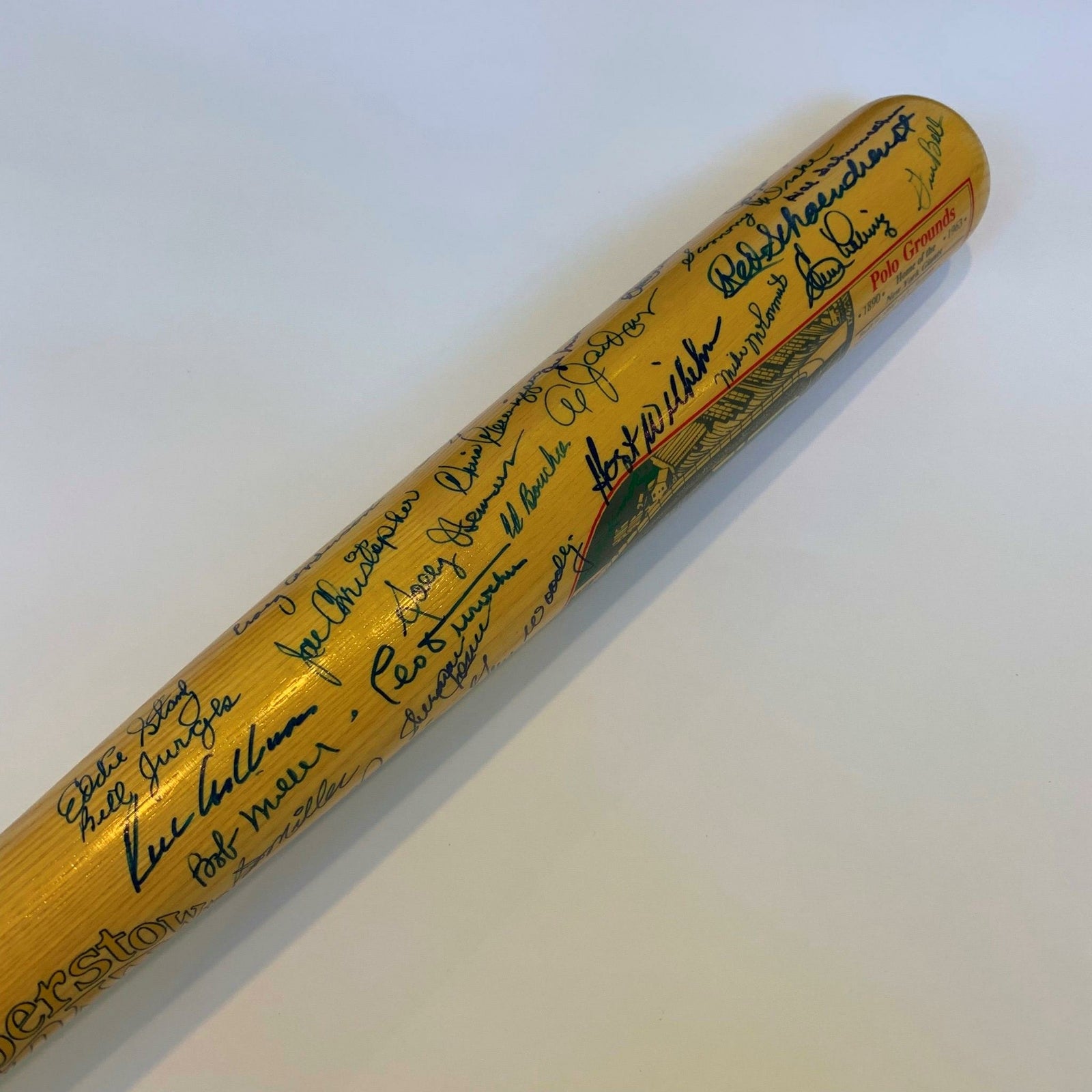 The Finest New York Giants & New York Mets multi signed Cooperstown Polo Grounds bat. 50 signatures with Willie Mays, Monte Irvin, Leo Durocher, Richie Ashburn, Johnny Mize, Red Schoendienst, Hoyt Wilhelm, Duke Snider, Minzell, Stanky, Neal, Frank Thomas, Throneberry, Zimmer, Labine, Lavagetto, Mccormick, Bell and many others. Full letter JSA COA.