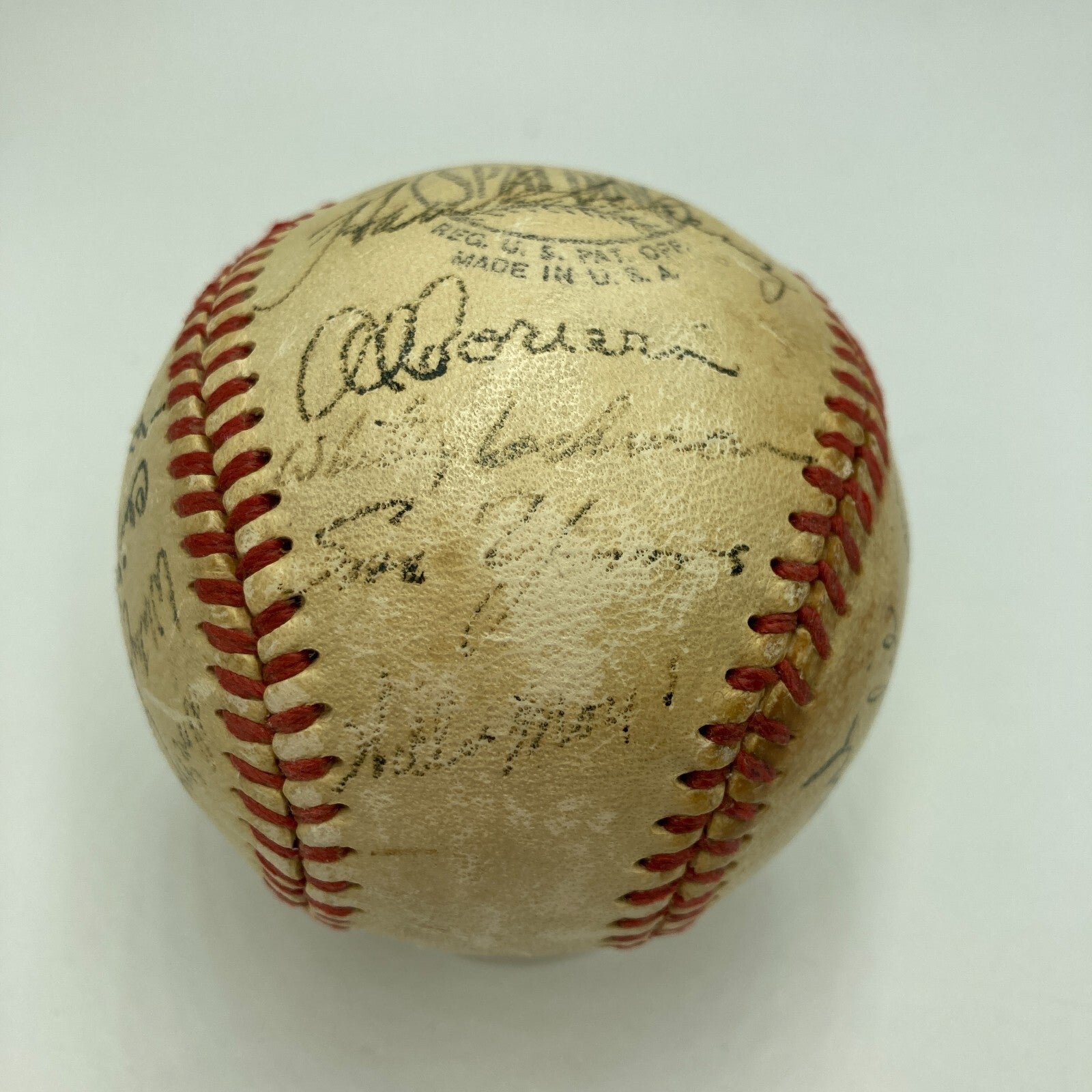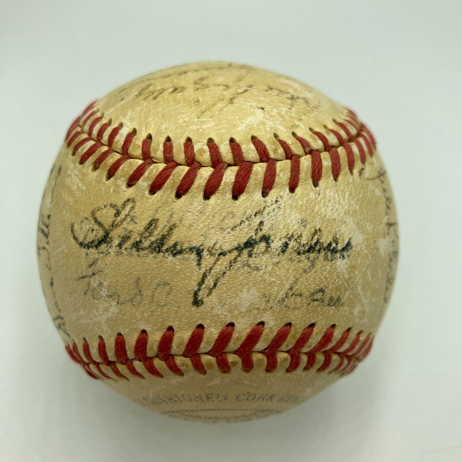 The 1951 New York Giants came up short in the World Series, but a talented 20-year-old rookie named Willie Mays ensured that the team would be contenders for decades. The featured baseball has the rookie signature of Willie Mays (faint but visible), along with 24 other signatures from the squad, including Corwin, Jansen, Jones, Kennedy, Koslo, Maglie, Noble, Yvers, Dark, Lockman, Lohrke, Rigney, Stanky, Thompson, Williams, Hartung, Irvin, Muller, Thomson, Schenz, and others.