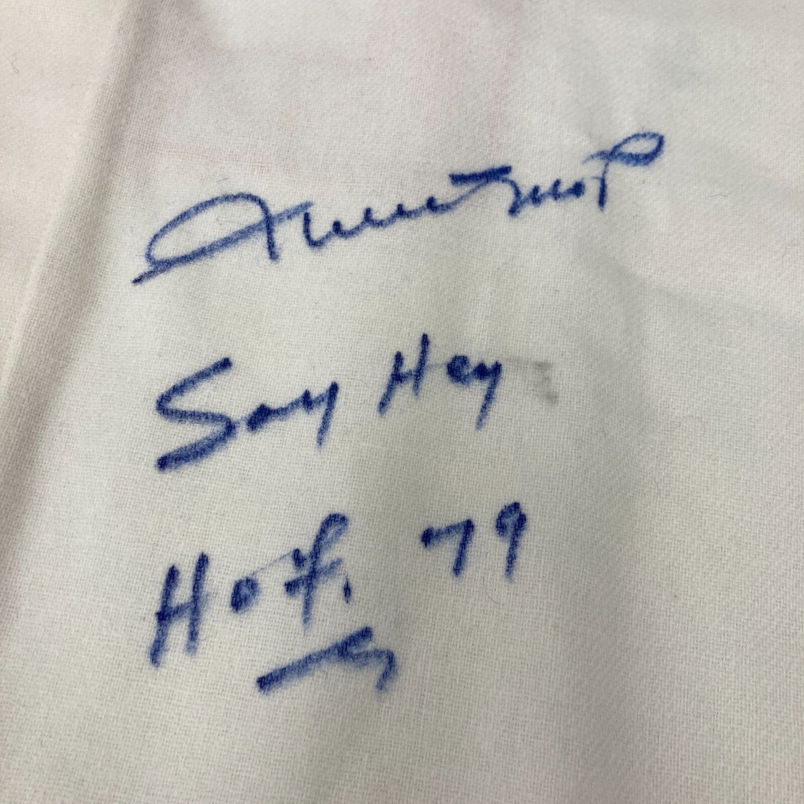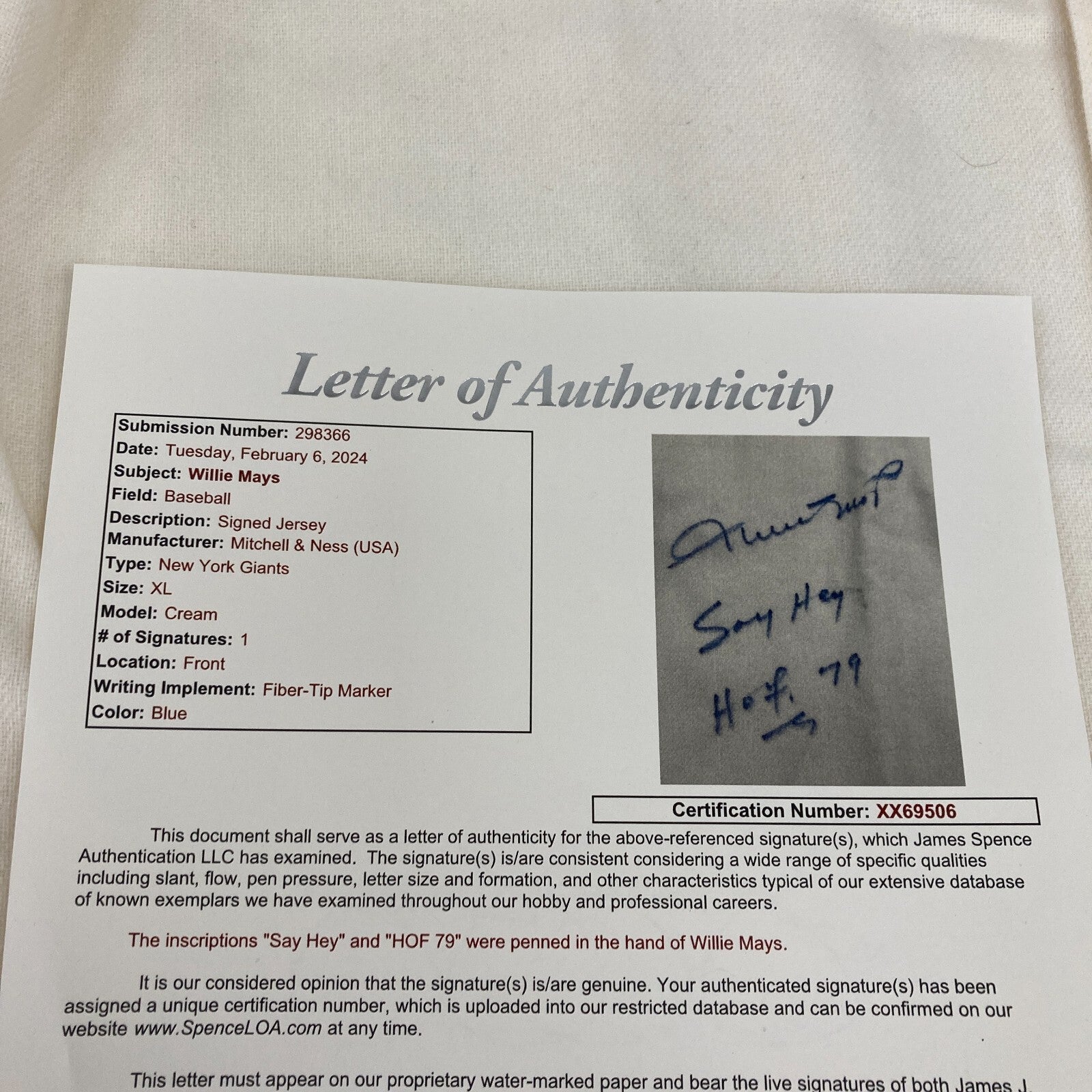Willie Mays autographed stat inscribed San Francisco Giants jersey. Top of the line throwback jersey by Mitchell & Ness has been signed on the front in marker. In addition, Mays has added "Say Hey" and "HOF 79" inscriptions. Size (XL) with original retail tags attached.