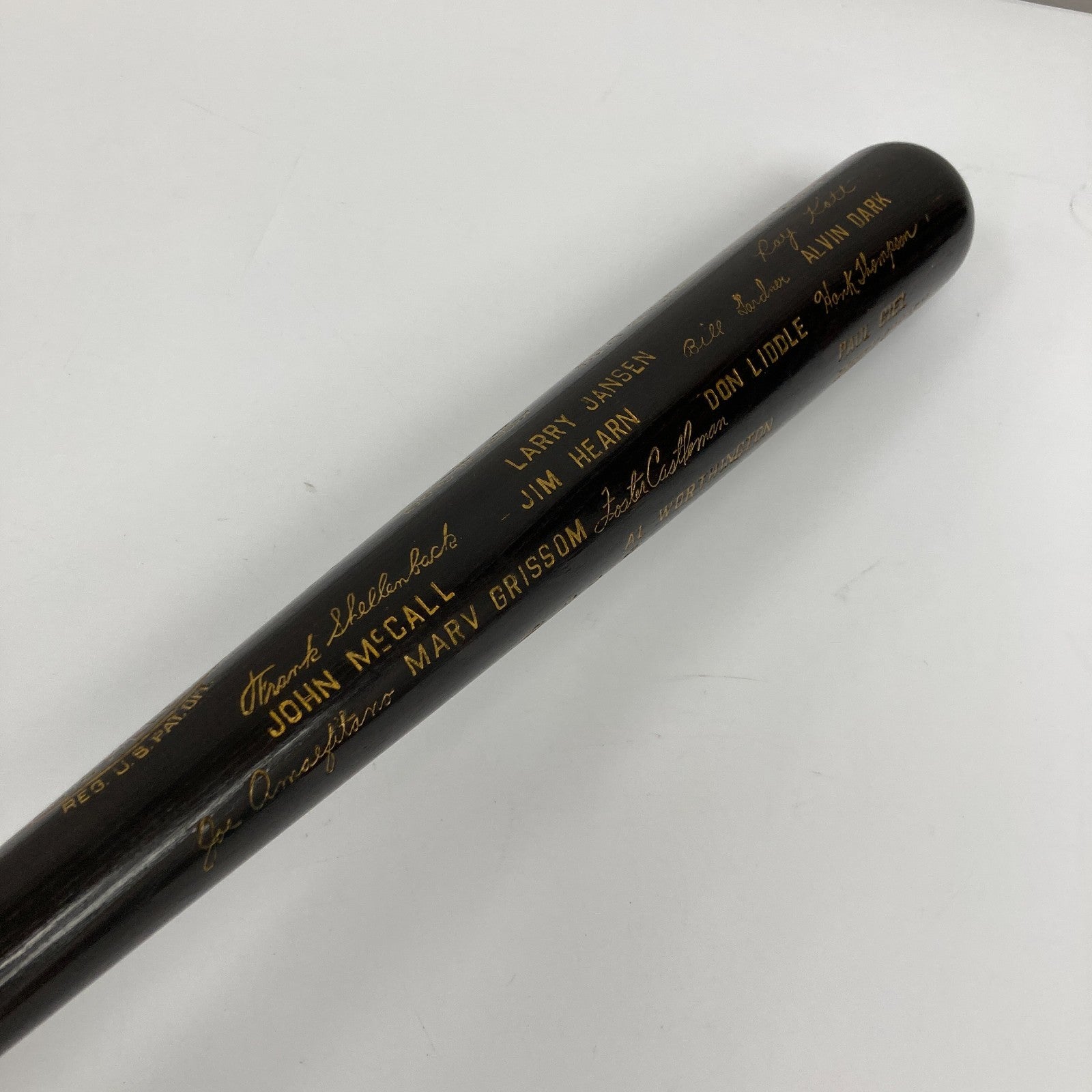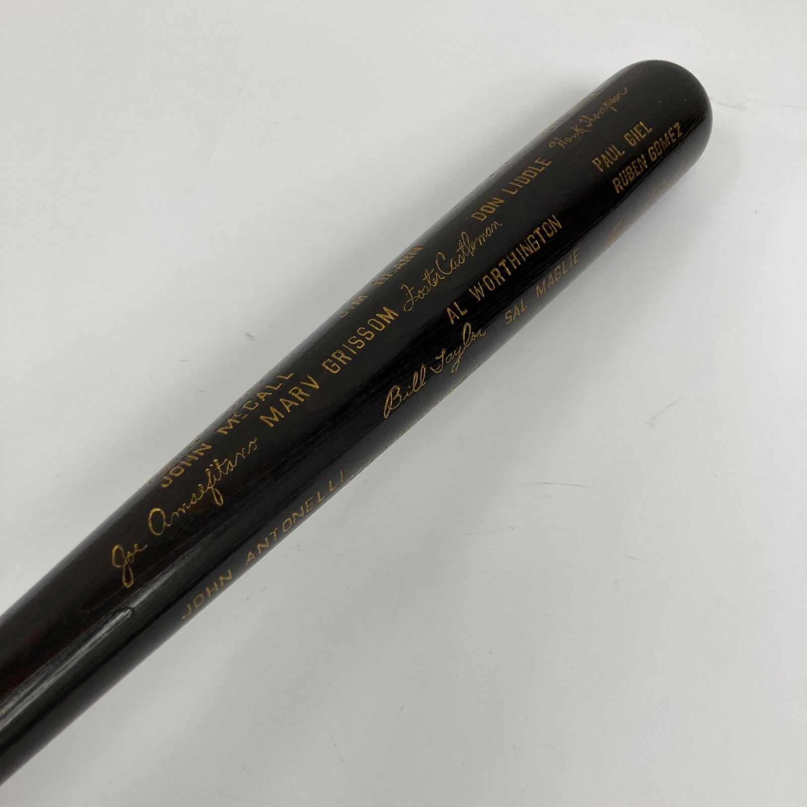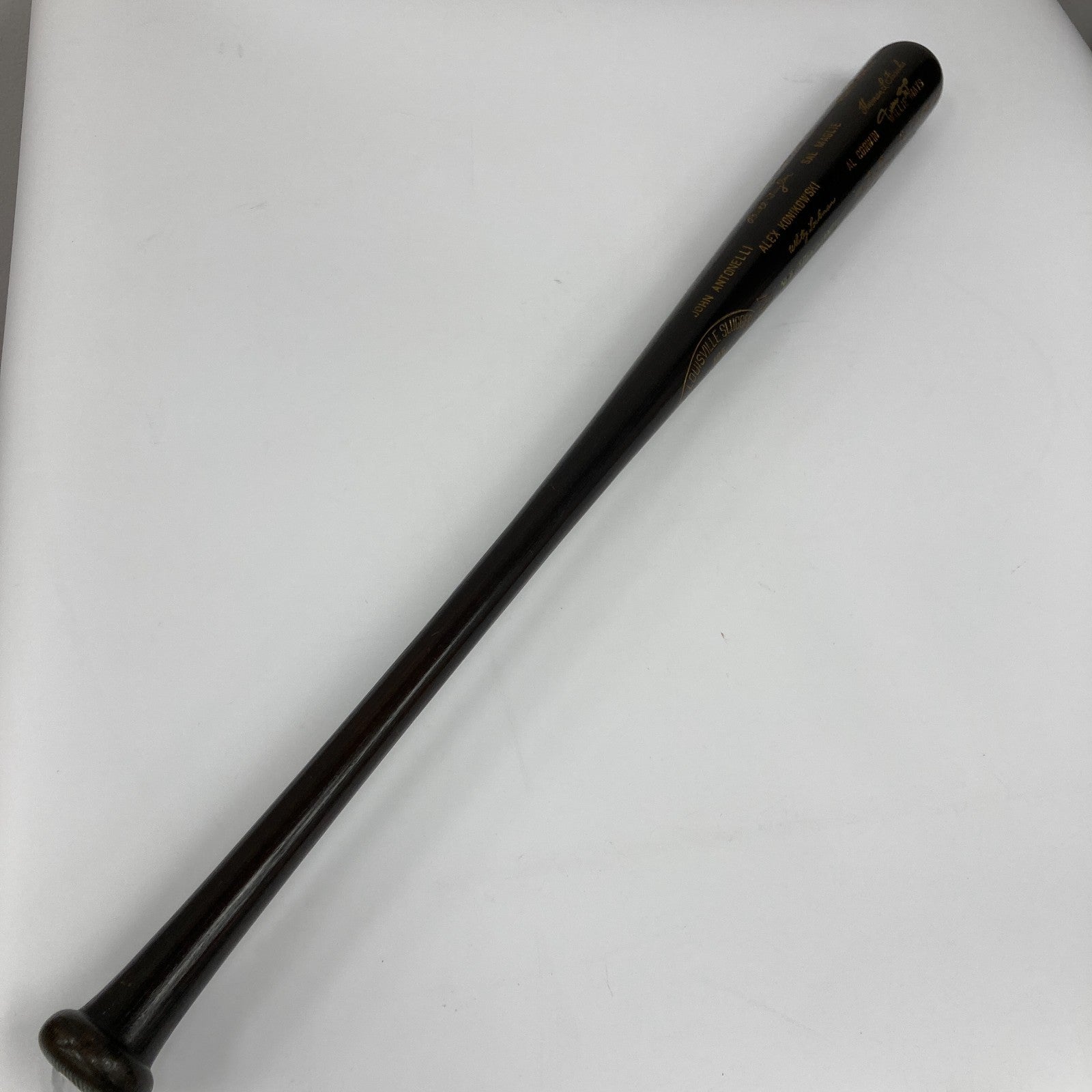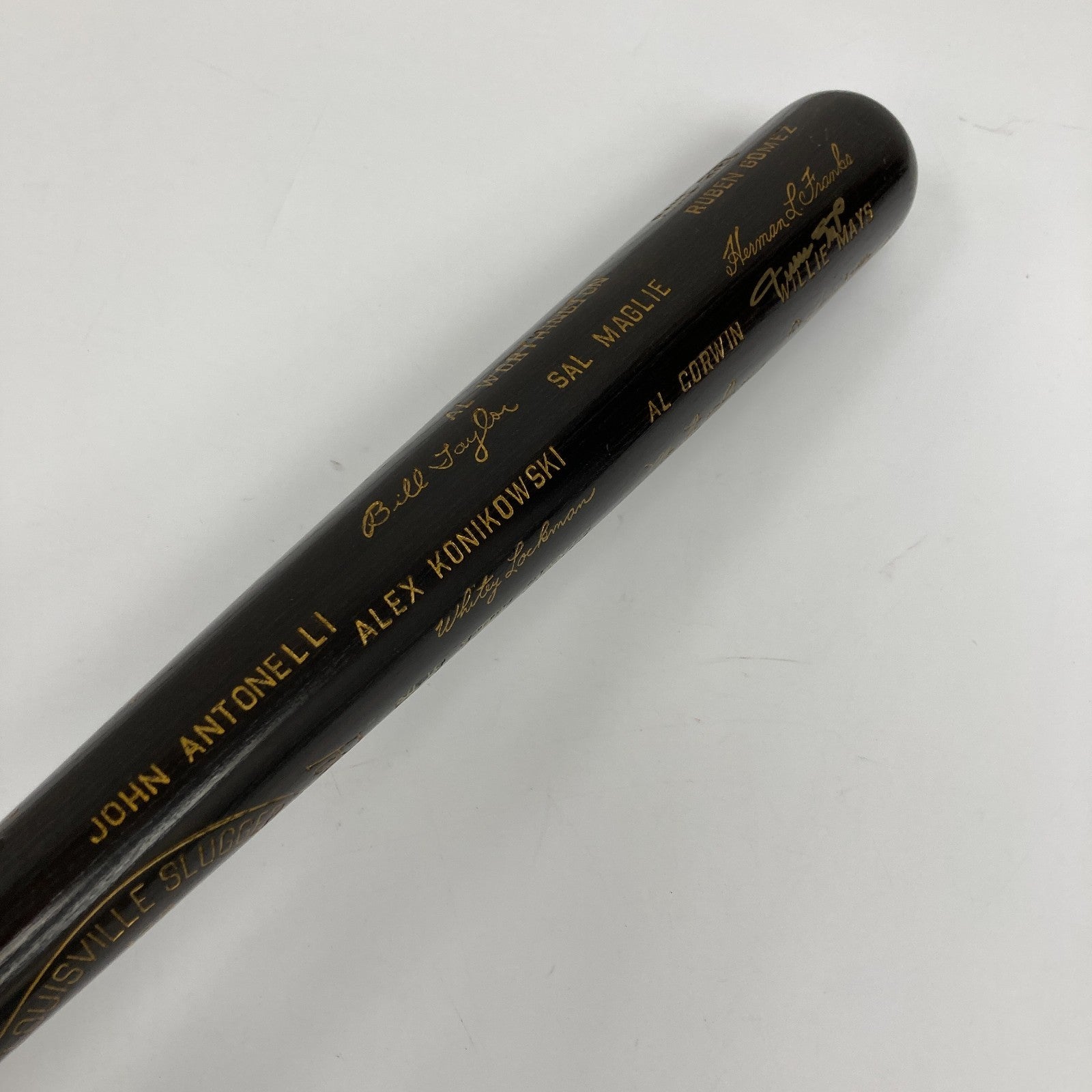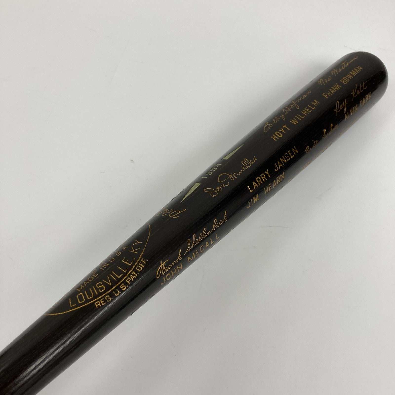 "Say Hey" to one of baseball's true elites, with this Willie Mays signed 1954 New York Giants World Champions black bat. Produced by Hillerich & Bradsby in limited numbers, World Series black bats are highly prized by collectors. This one recalls the Giants sweep of the 111-win Cleveland Indians in the 1954 World Series. The most memorable moment of this long-ago Fall Classic was a Mays play in deep center, known reverently as "The Catch", so it's fitting Mays is the only one to have signed this splendid treasure. Following suit with the gold facsimile signatures and block letter names decorating the barrel, Mays has signed boldly in gold, directly above the factory rendered version of his name.