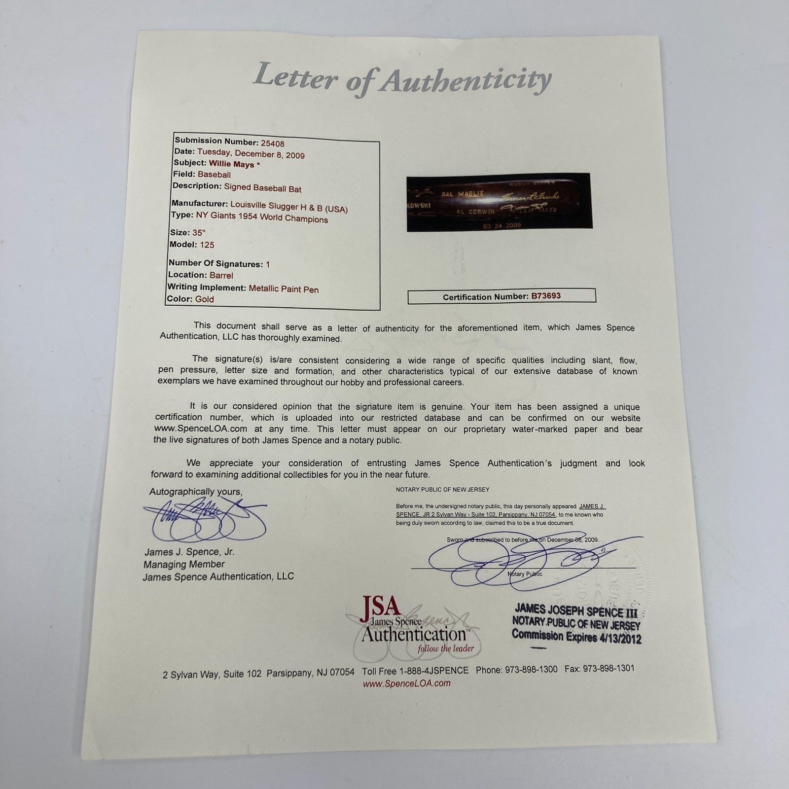 Full LOA from James Spence/JSA.