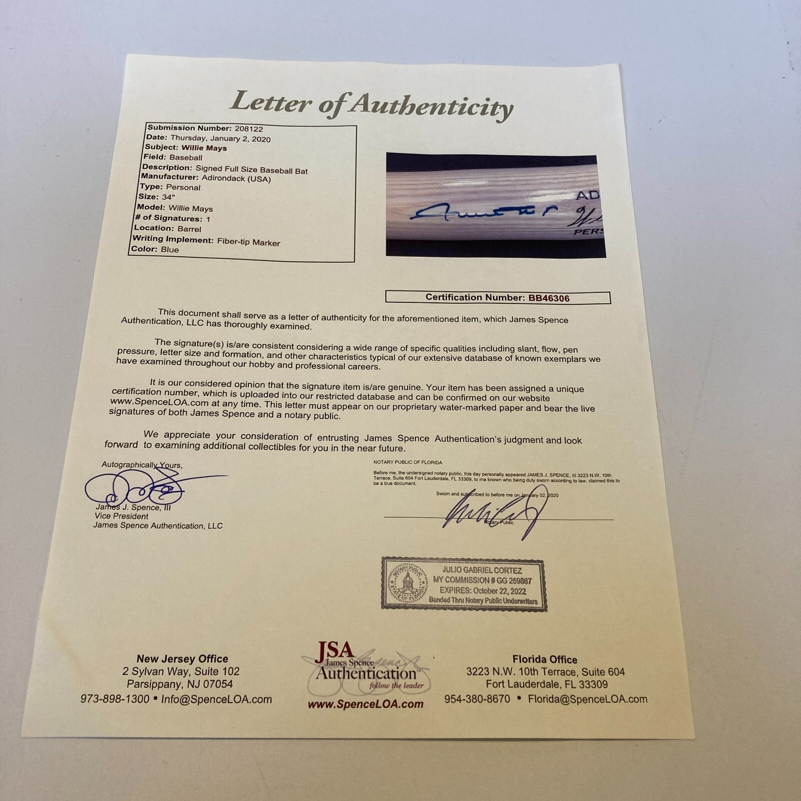 Willie Mays Signed Adirondack Game Model Baseball Bat JSA COA