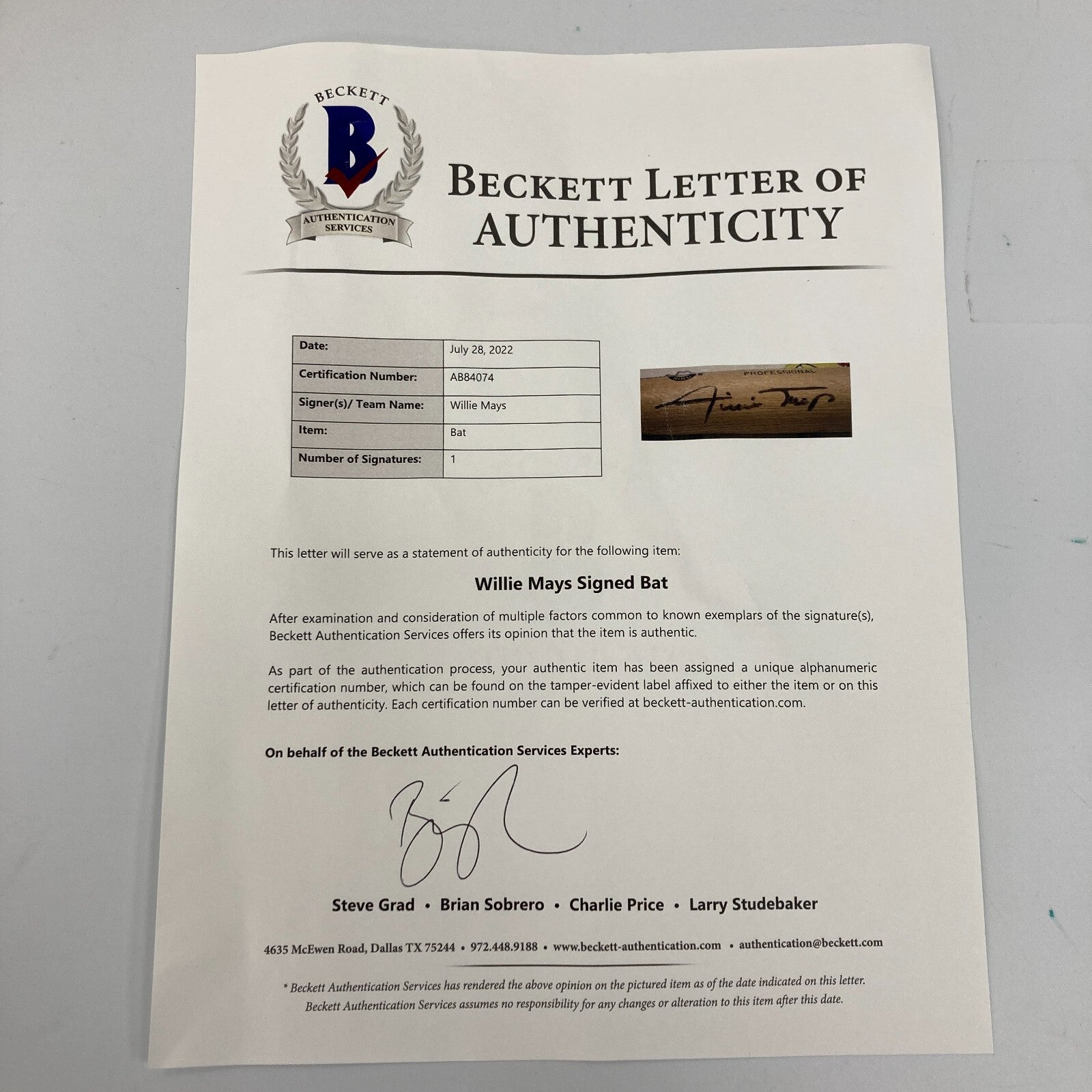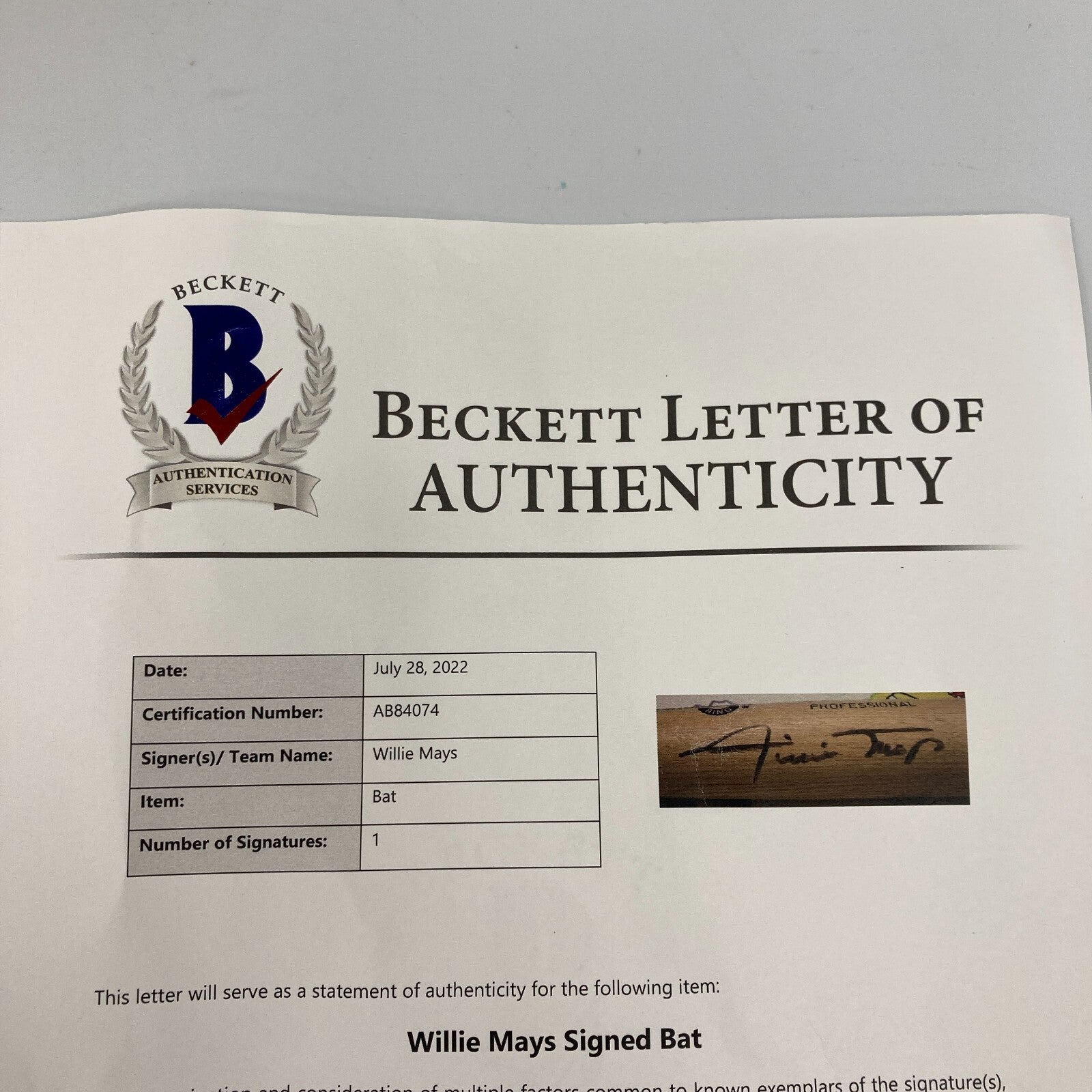 Willie Mays Signed Adirondack Game Model Baseball Bat With Beckett COA