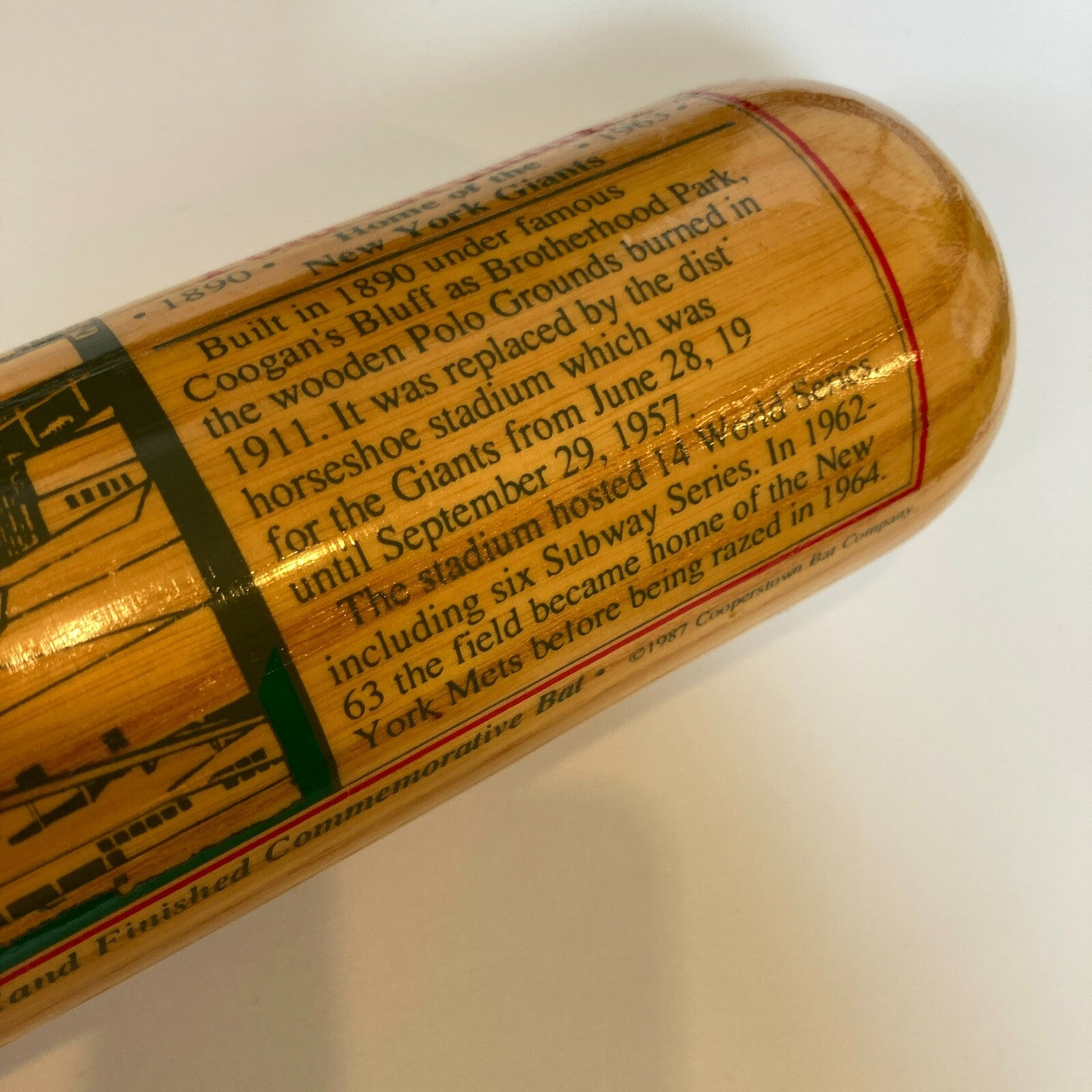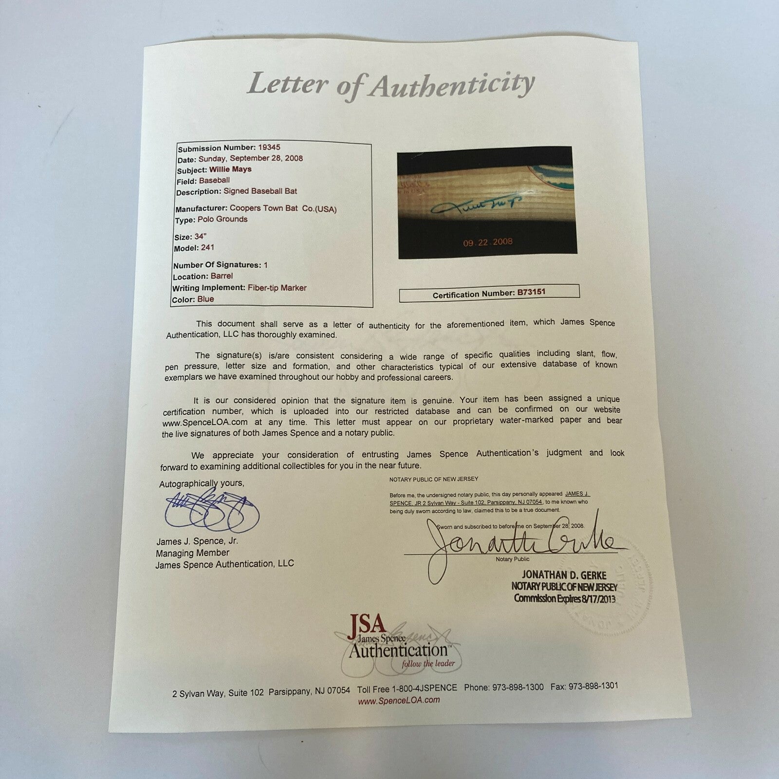 Commemorative bat manufactured by the Cooperstown Bat Company signed by Willie Mays, who has written his signature in blue Sharpie on the barrel. The barrel also features a decal that pays tribute to the Polo Grounds, where Mays patrolled center field for the early part of his career. The model number "241" is carved into the knob. The bat measures 34 inches long and is in Near Mint condition. Full LOA from JSA.
