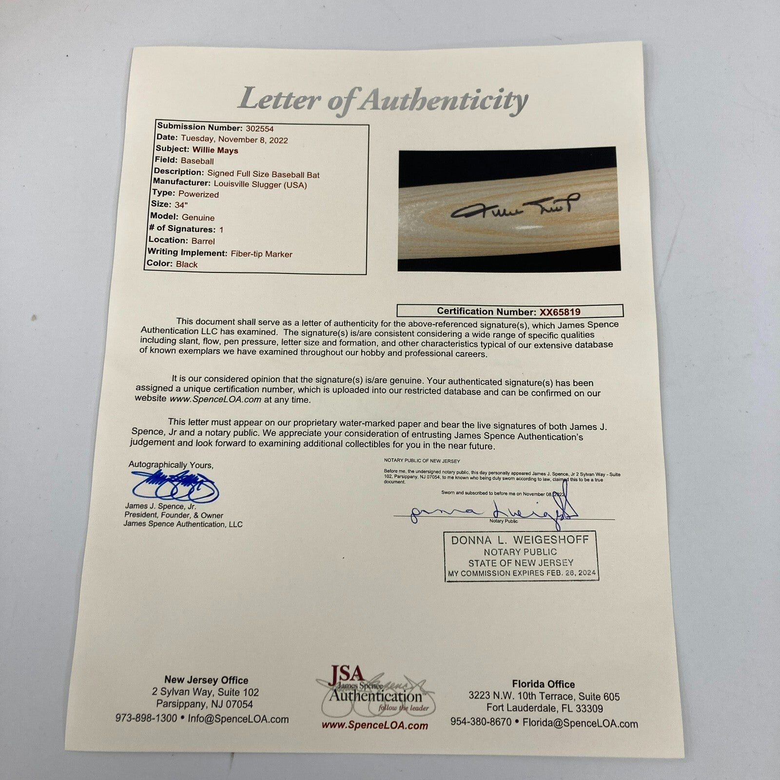 Willie Mays Signed Louisville Slugger Baseball Bat With JSA COA