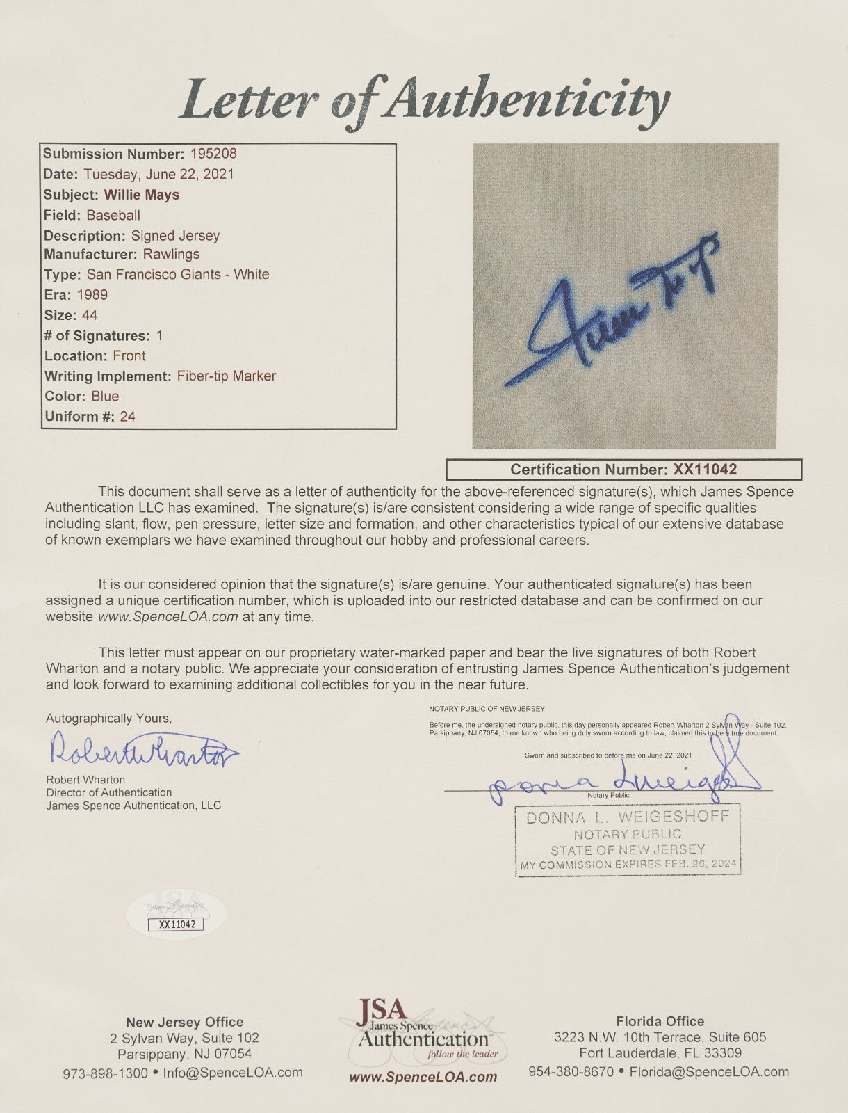 Willie Mays San Francisco Giants authentic 1989 jersey signed by him on the front in blue marker. Produced by Rawlings, the jersey (size 44) is in Near Mint condition overall. Full LOA from James Spence/JSA.
