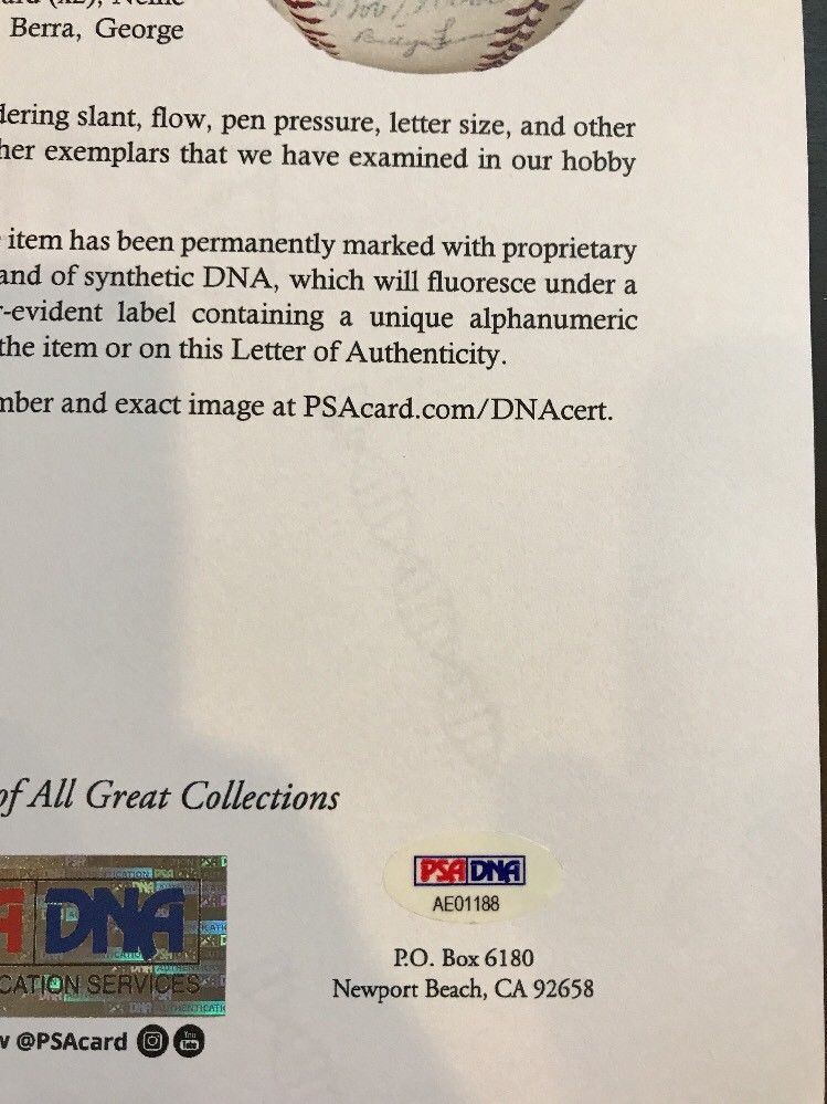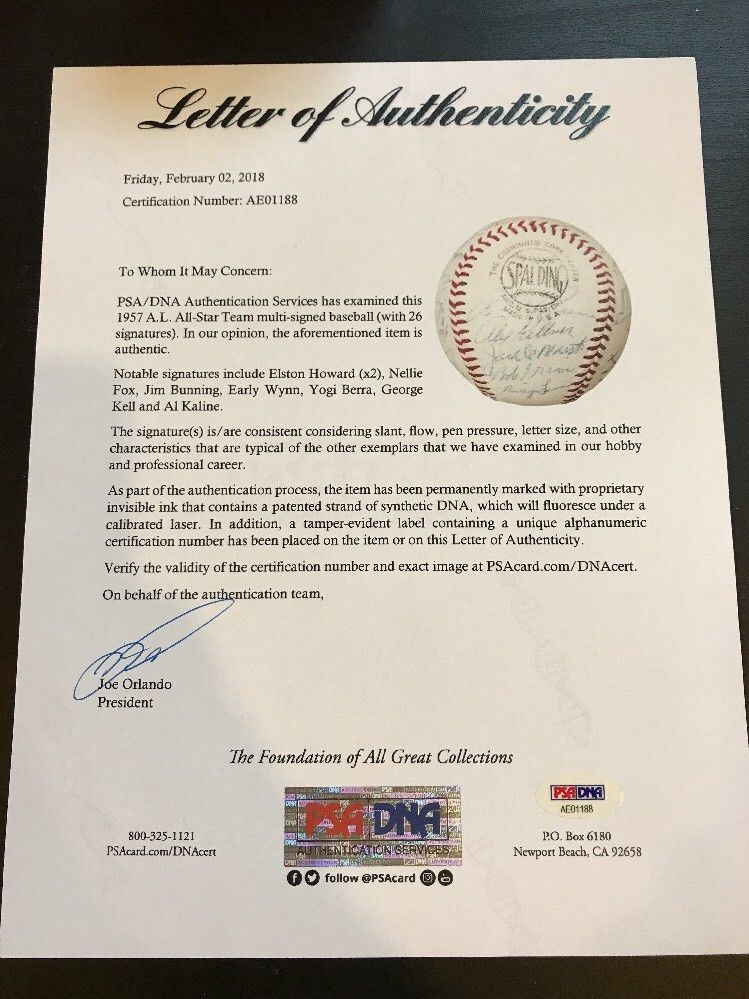 1957 American League All-Star Team Signed Baseball. The 1957 Midsummer Classic at Sportsman's Park changed the way All-Star voting is done when it was discovered that the Cincinnati Enquirer printed up pre-marked ballots for fans to use. The result was that seven Reds were voted in as starters, with Stan Musial as the only outsider. Commissioner Ford Frick overrode the fans and substituted Hank Aaron and Willie Mays into the starting lineup for two of the Reds. Fans regained their voting 1970 but only after certain safeguards were installed. This Official National League (Giles) baseball is signed by twenty-six in ballpoint ink. Included are: Mossi, Triandos, Minoso, (2) Jim Bunning, Al Kaline, Shantz, (2) Elston Howard, Loes, Grim, DeMaestri, Pierce, Sievers, Nellie Fox, Skowron, Maxwell, Gil McDougald, Early Wynn, George Kell, Harvey Kuenn, Malzone, Yogi Berra, Bobby Richardson and two more. Full LOA from PSA/DNA.