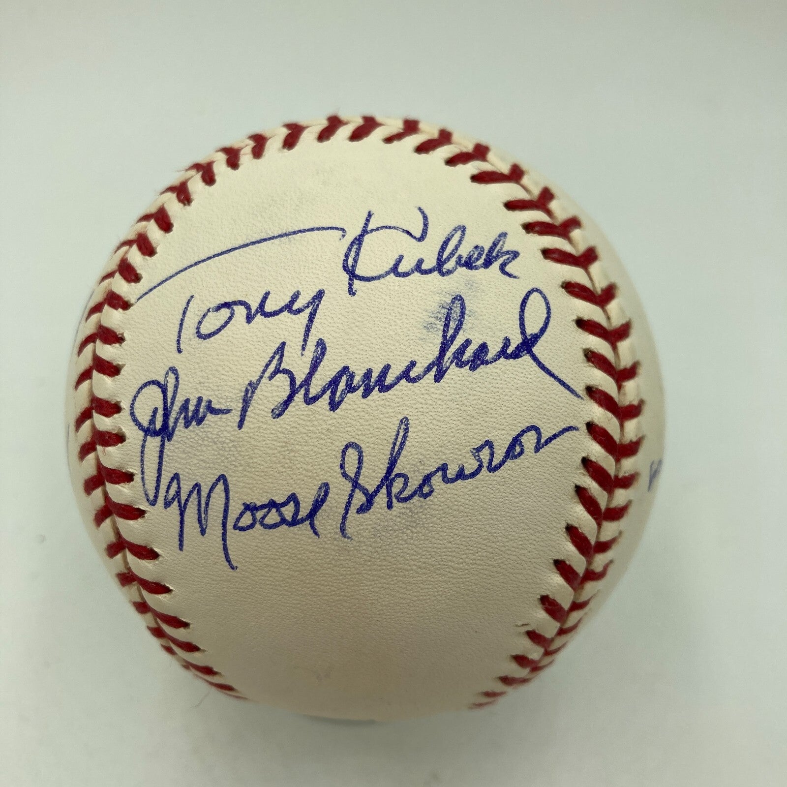 Yogi Berra (HOF), Don Larsen, Goose Gossage (HOF), Hank Bauer, Moose Skowron, Johnny Blanchard, Mickey Rivers, Bobby Richardson, Tony Kubek, Bucky Dent, Bob Turley and Jake Gibbs. Guaranteed to pass PSA or JSA or your money back.