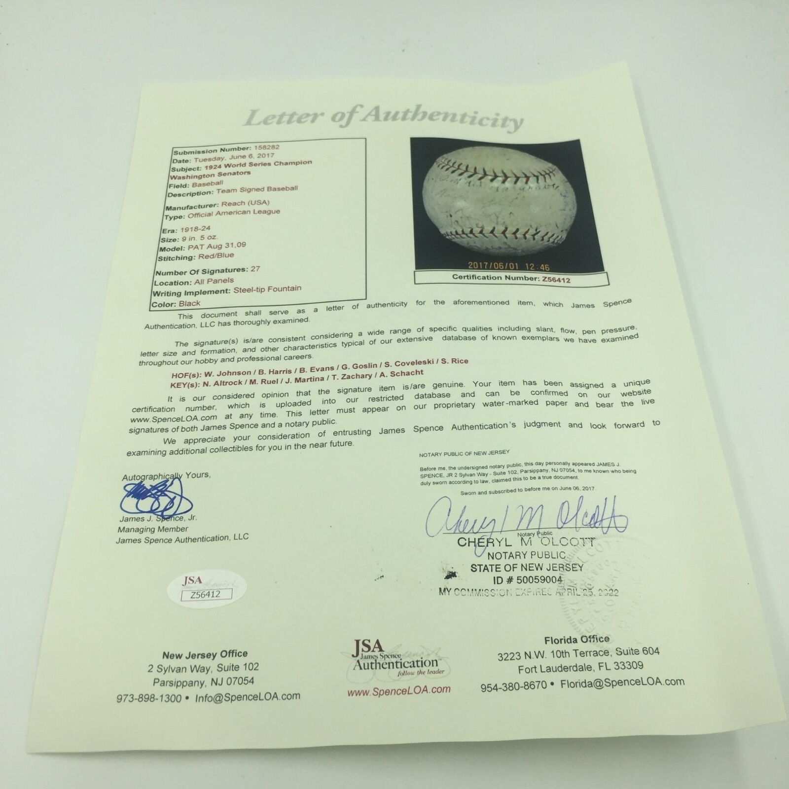RARE 1924 Washington Senators World Series Champions Team Signed Official American League Baseball. 27 signatures including Hall Of Famer's Walter Johnson, Goose Goslin, Bucky Harris, Sam Rice, Billy Evans, Stanley Coveleski as well as Nick Altrock, Muddy Ruel, Al Schacht and many others. Comes with full letter COA from JSA.