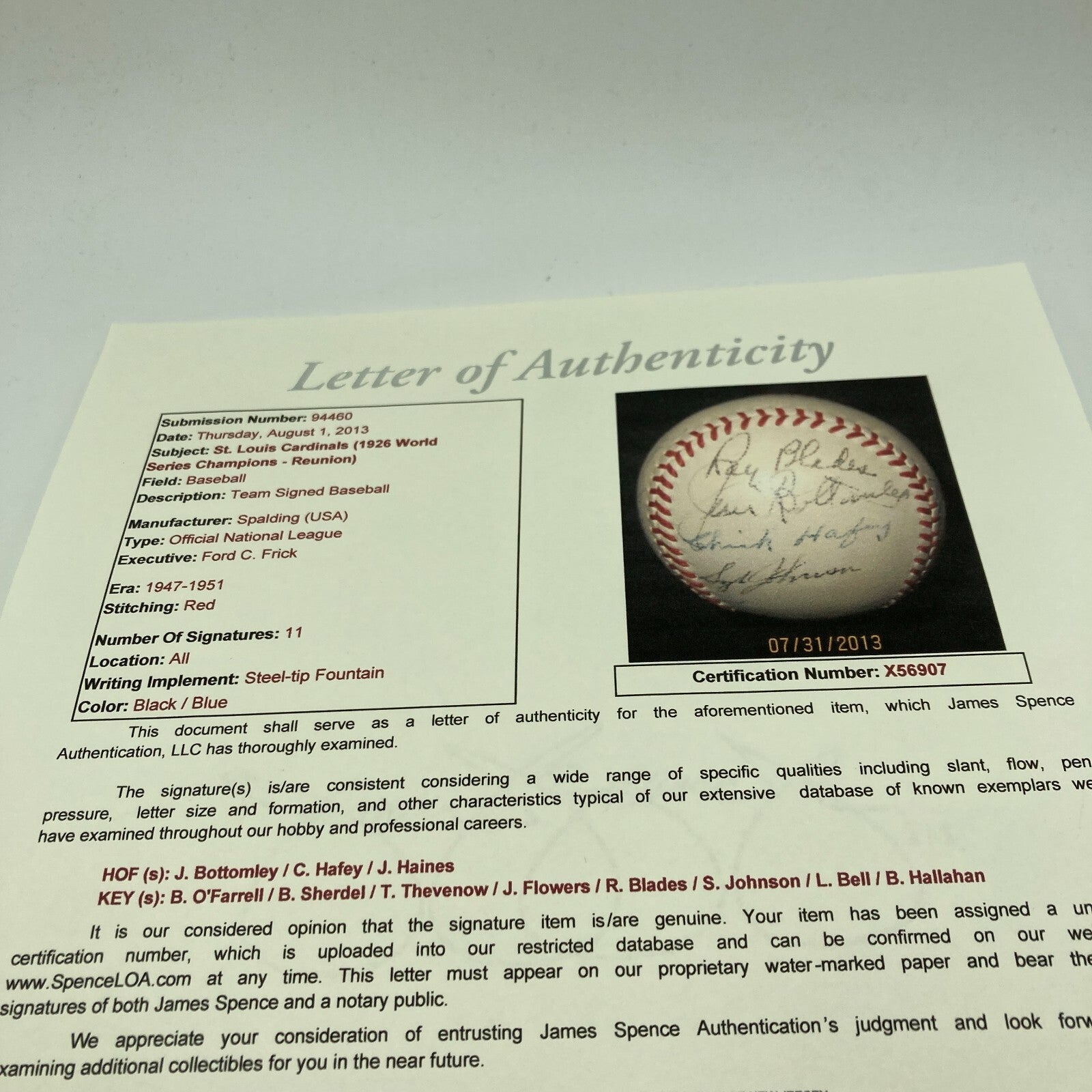 Beautiful 1926 St. Louis Cardinals World Series Champs Team Signed Official National League (Ford Frick) Baseball. 11 signatures with Jim Bottomley, Chick Hafey, Jesse Haines and many others.