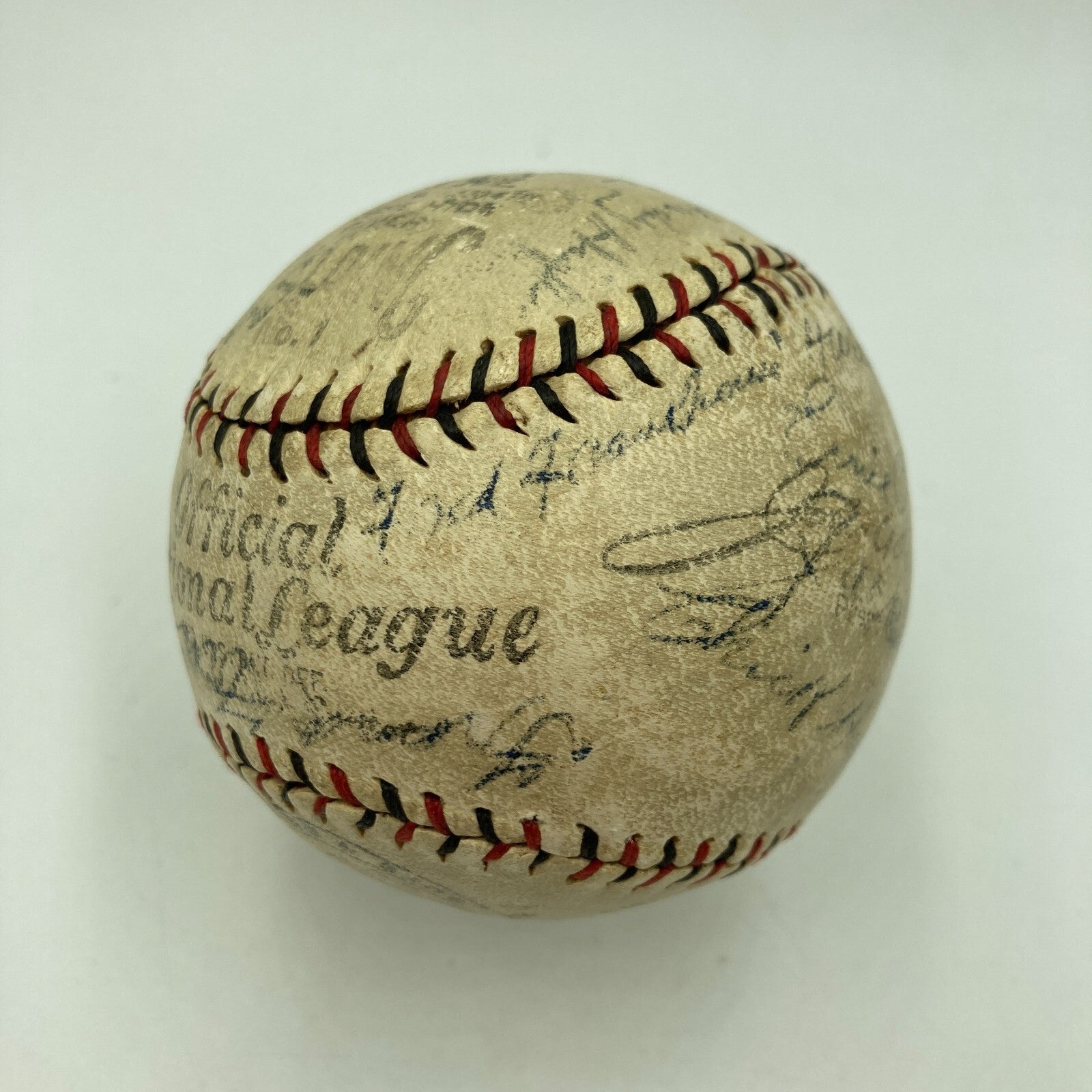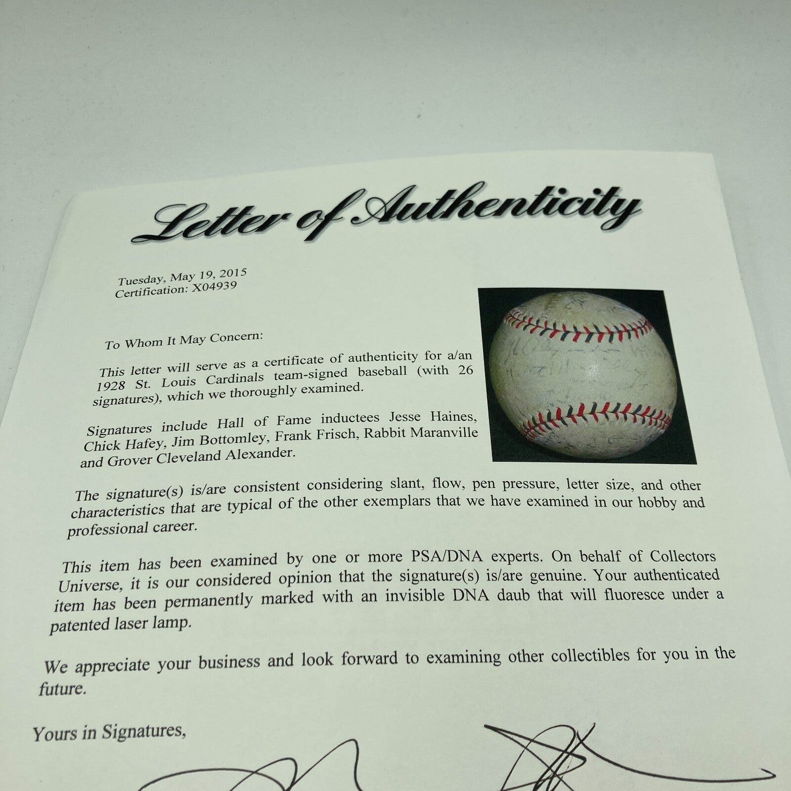 1928 St. Louis Cardinals Team Signed Autographed Official National League Baseball Featuring Jesse Haines, Chick Hafey, Frank Frisch, Rabbit Maranville and Grover Cleveland Alexander comprising 26 total signatures.
