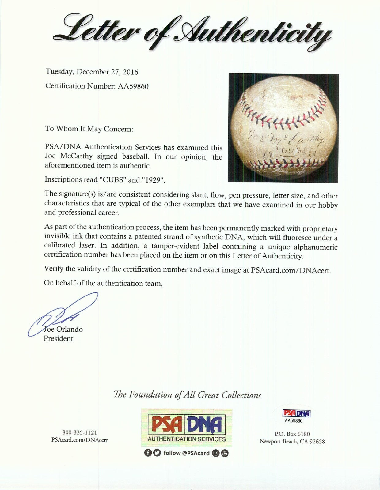 Rare Joe Mccarthy Single Signed Game Used Official National League Baseball Inscribed by Joe "1929 Cubs". This was signed during his historic National League Pennant Year. Comes with Full Letter COA from PSA DNA.