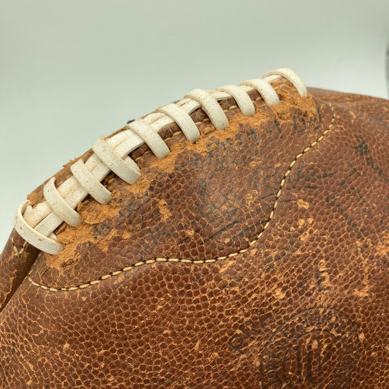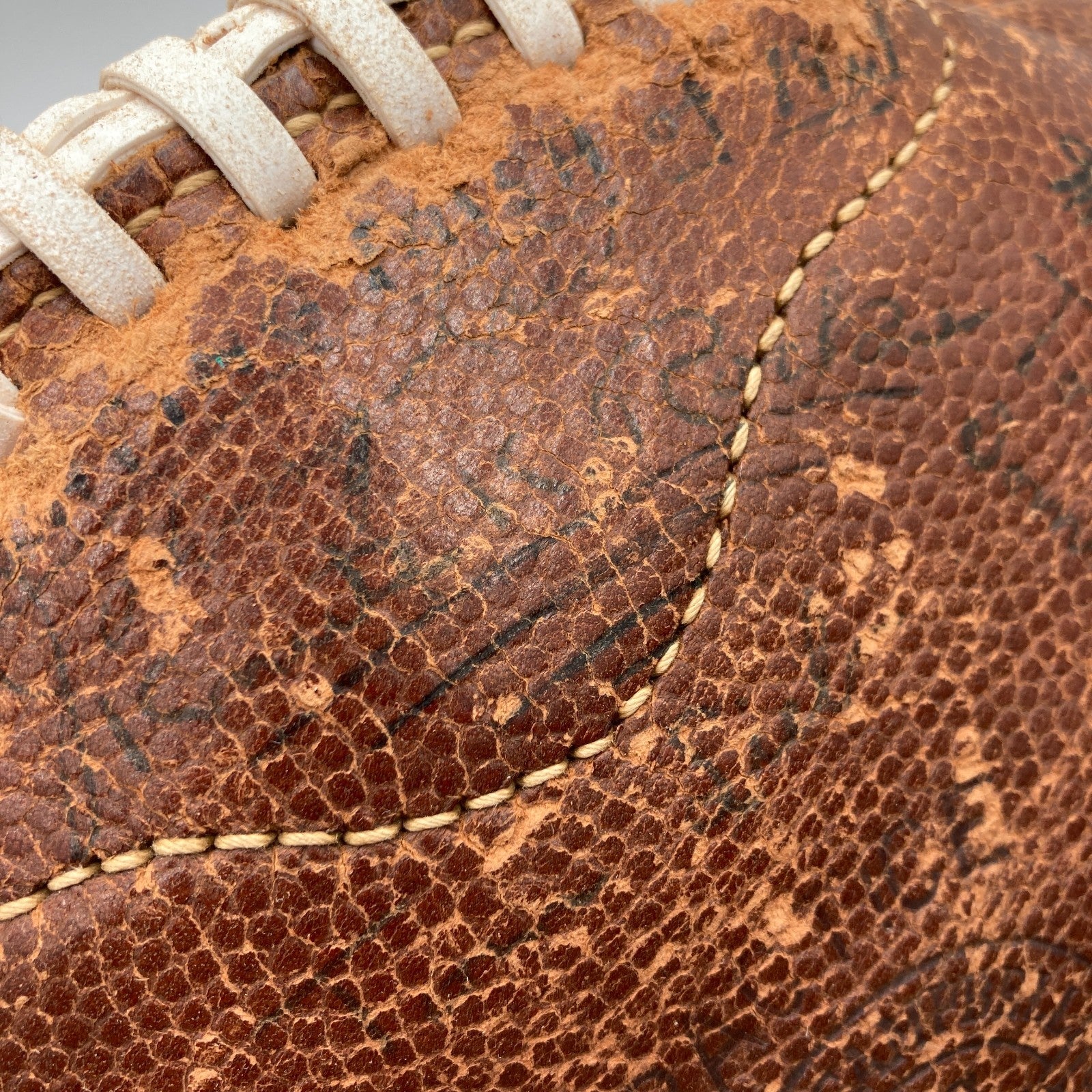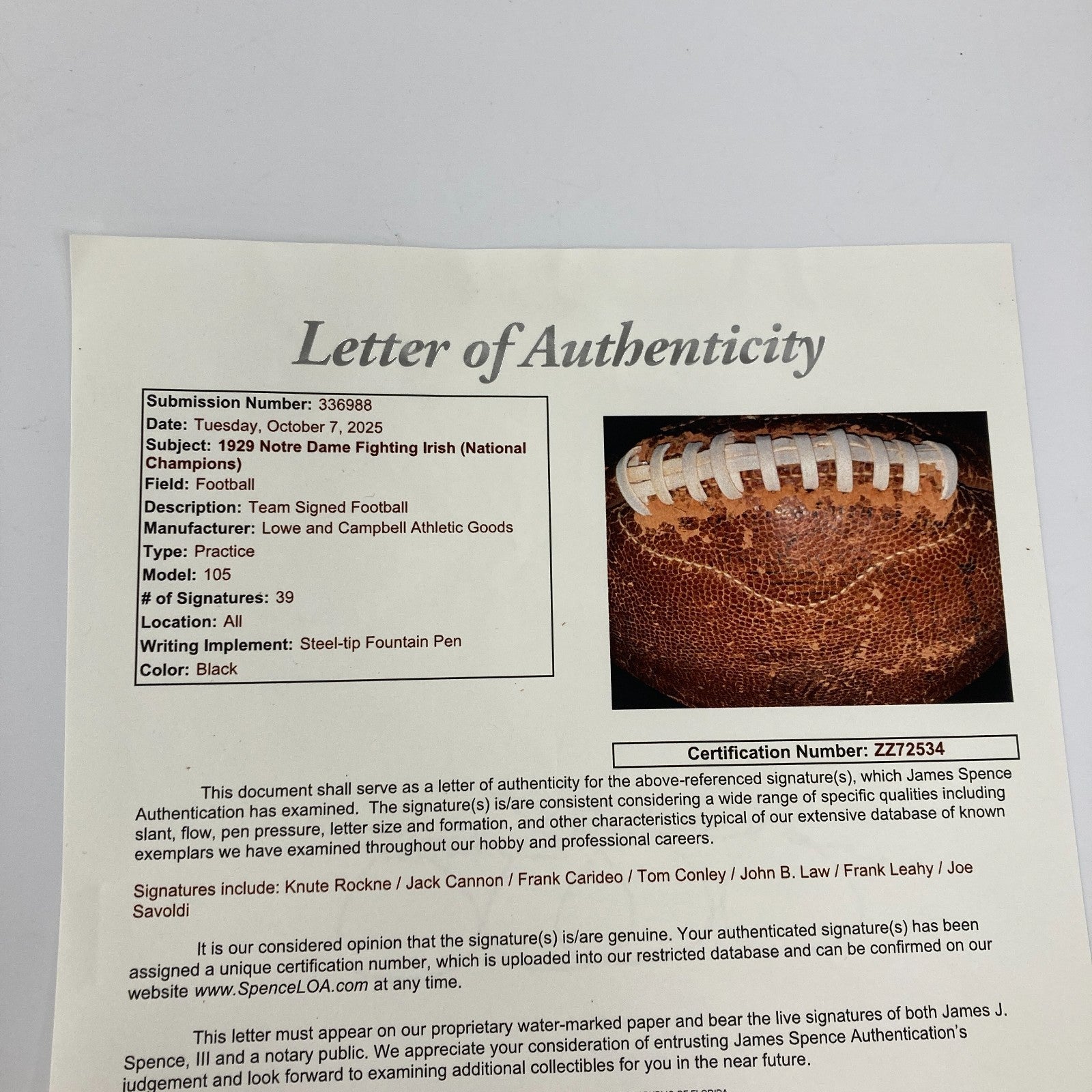 Offered is a Lowe & Campbell Athletic Goods football with 39 signatures from members of the 1929 National Champion Notre Dame Fighting Irish football team including legendary head coach Knute Rockne,Jack Cannon, Frank Carideo, Tom Conley, John B. Law, Frank Leahy, Joe Savoldi and many others. "Notre Dame Champions 1929" also handwritten along the laces. Football is inflated and holds air.