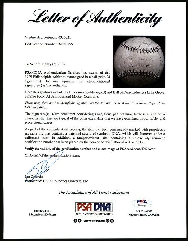Bright ball signed by the 1929 World Champion Philadelphia Athletics. Official American League (Barnard) baseball is in Very Good condition with 25 signatures. Signatures include: Lefty Grove, Kid Gleason, Jimmie Foxx, Al Simmons, and Mickey Cochrane, and the ball itself came from the collection of Hall of Famer Harry Heilmann. Connie Mack's 1929 A's dominated the American League with a 104-46 record before proceeding to take the World Series from the Chicago Cubs in five games. Comes with PSA DNA LOA.