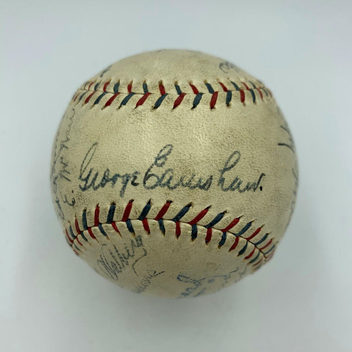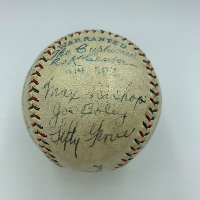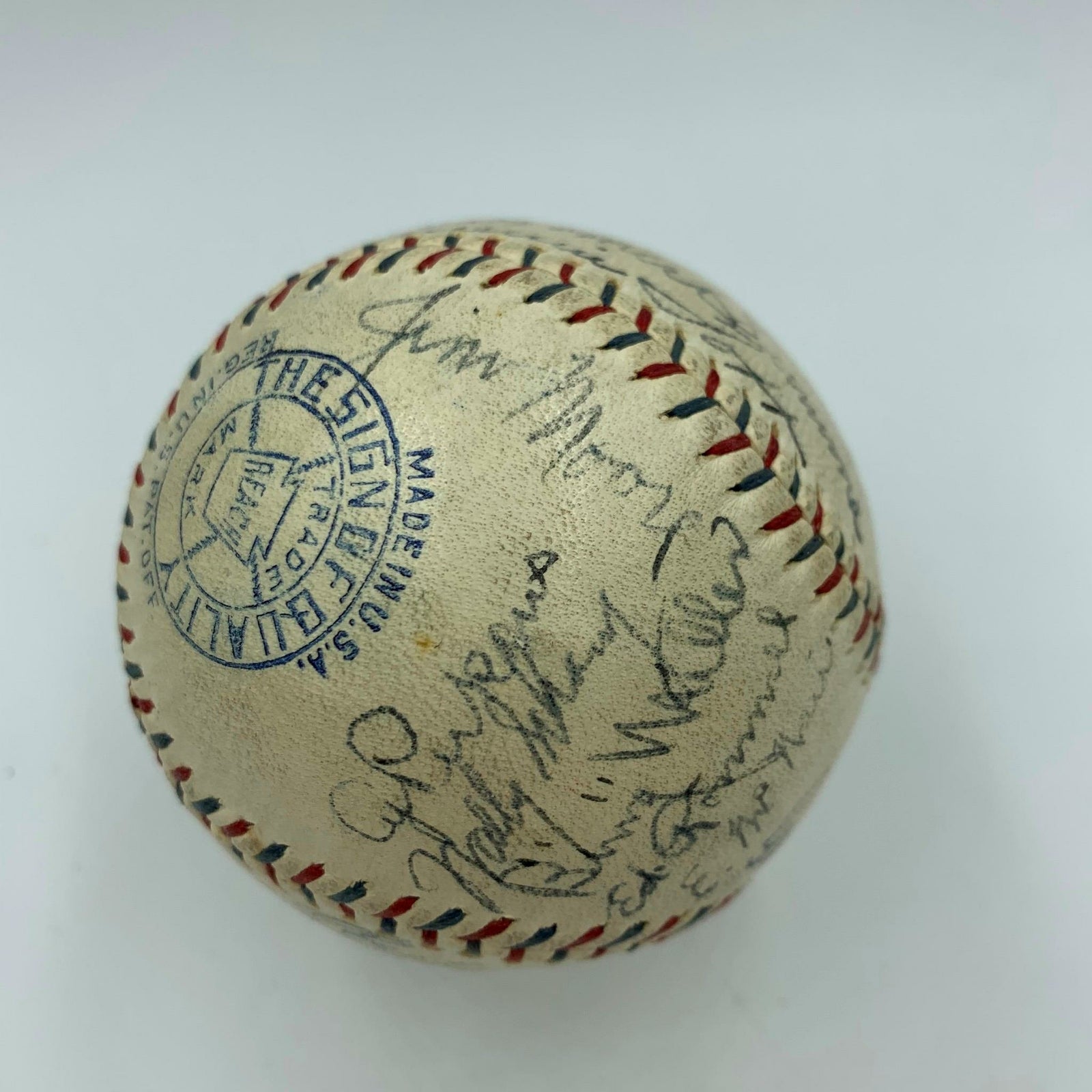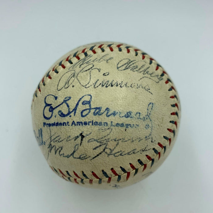 The featured Official American League (Barnard) ball contains 20 signatures from that powerful squad, including clean signatures of Hall Of Famers Jimmie Foxx, Mickey Cochrane and Al Simmons. Also signed by Earnshaw is on the sweet spot, with Dykes, Mahaffey, Shores, Summa, Walberg, Quinn, Haas, Bishop, Boley, Moore, Perkins, Schang, Miller, Rommel and McNair. Lefty Grove is CH. Full letter LOA from JSA.