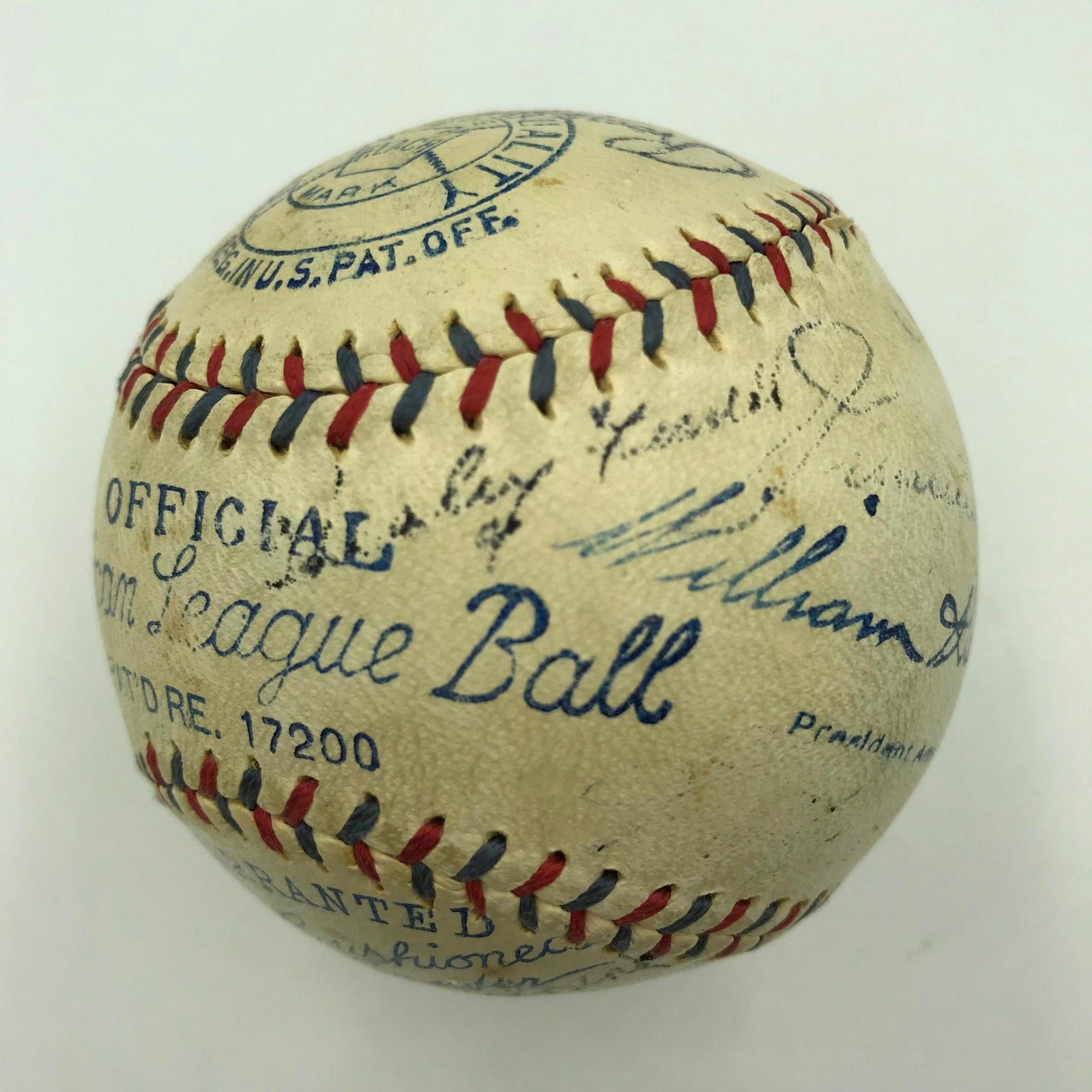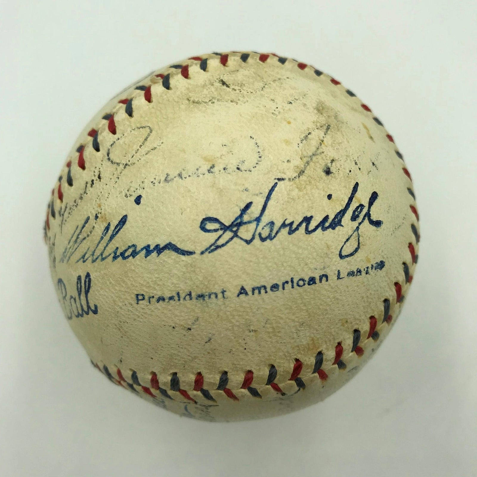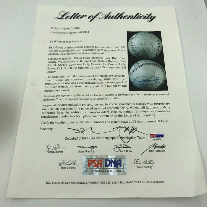 Extraordinary Official William Harridge American League baseball signed by 21 members of the 1933 AL All-Star team. This ball has special significance because it was the very first All-Star game ever played. Signatures include: Babe Ruth, Lou Gehrig, Walter Johnson, Jimmie Foxx, Al Simmons, Rogers Hornsby, Mickey Cochrane, Lefty Grove, Charles Gehringer, Bill Dickey, Rick Ferrell, Lefty Gomez, Joe Cronin and Earl Averill among others. This is, undoubtedly, one of the greatest All-Star teams ever assembled. Very unique opportunity to acquire an All-Star baseball in which legends Ruth, Gehrig, Foxx, Johnson and Hornsby all played on the same team. This was the first official playing of the midseason exhibition baseball game between Major League Baseball's (MLB's) National League (NL) and American (AL) All-Star teams. The game was held on July 6, 1933, at Comiskey Park in Chicago, Illinois, the home of the AL's Chicago White Sox. The game resulted in the AL defeating the NL 4–2, in two hours and five minutes. PSA/DNA Letter of Authenticity detailing the signatures included on this historic baseball.