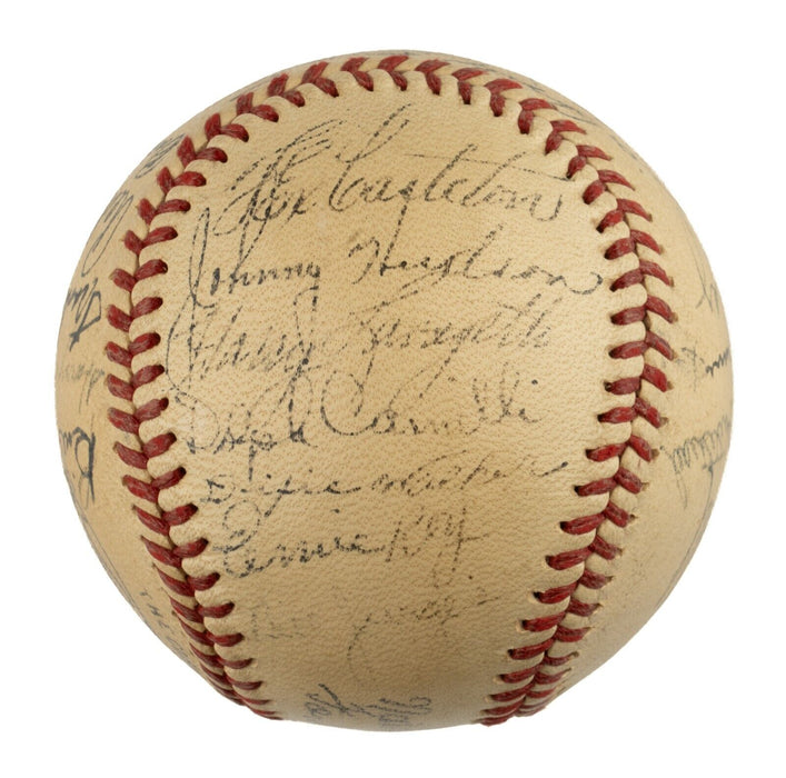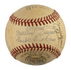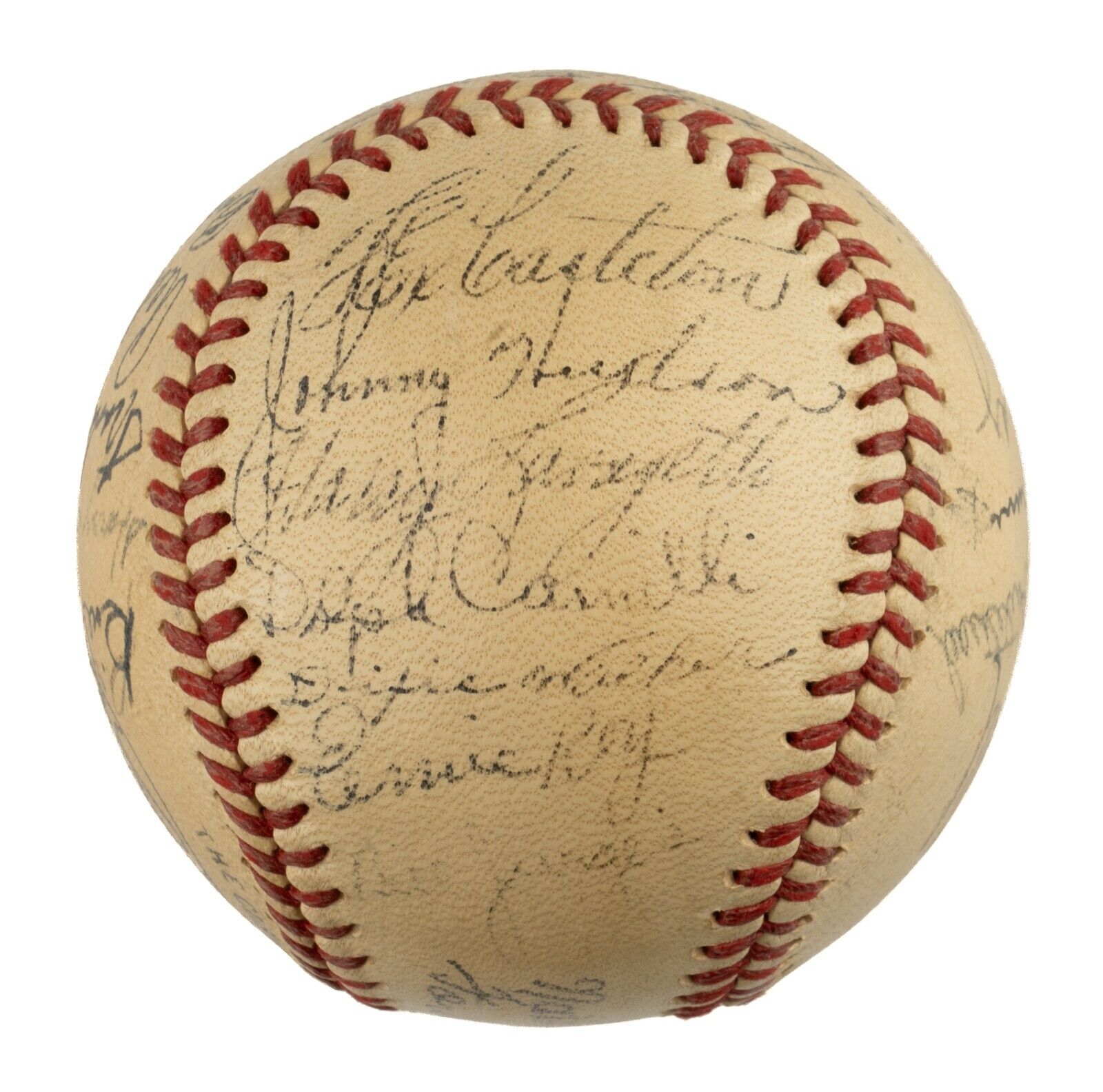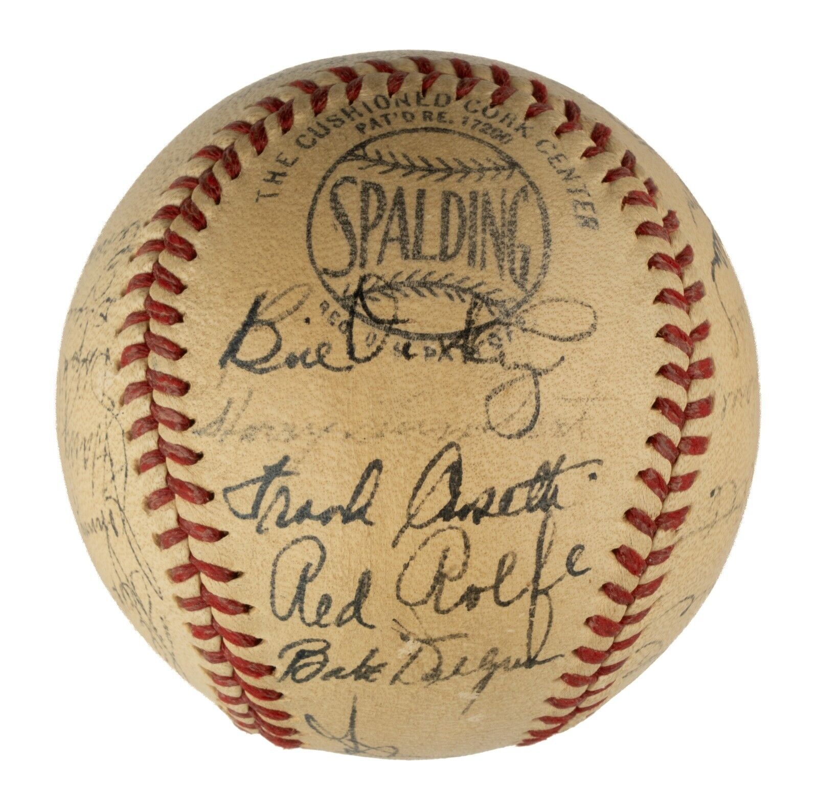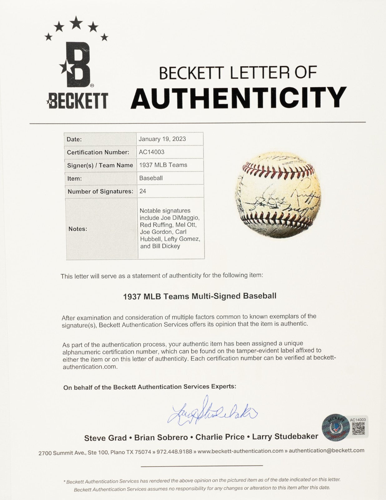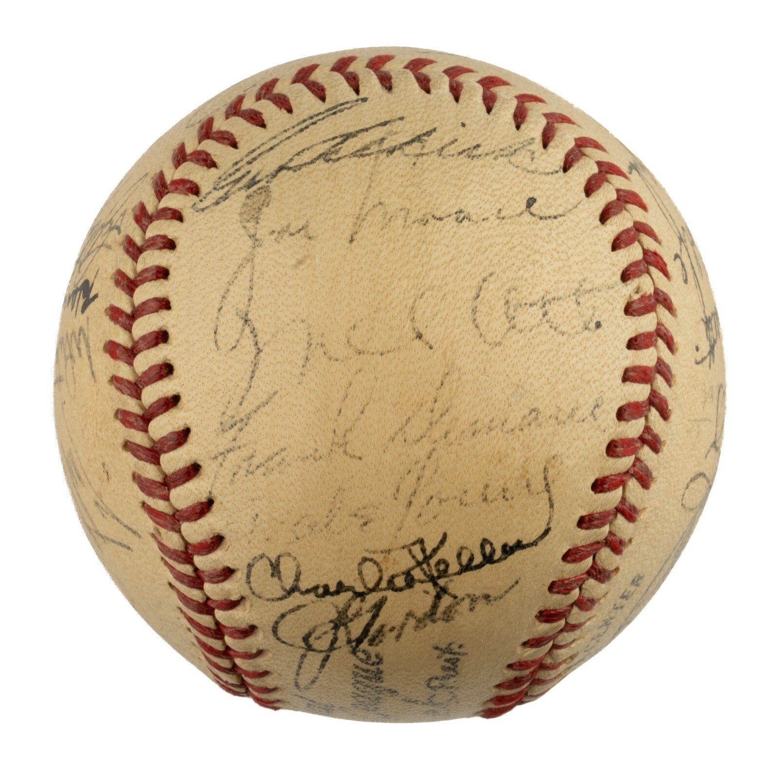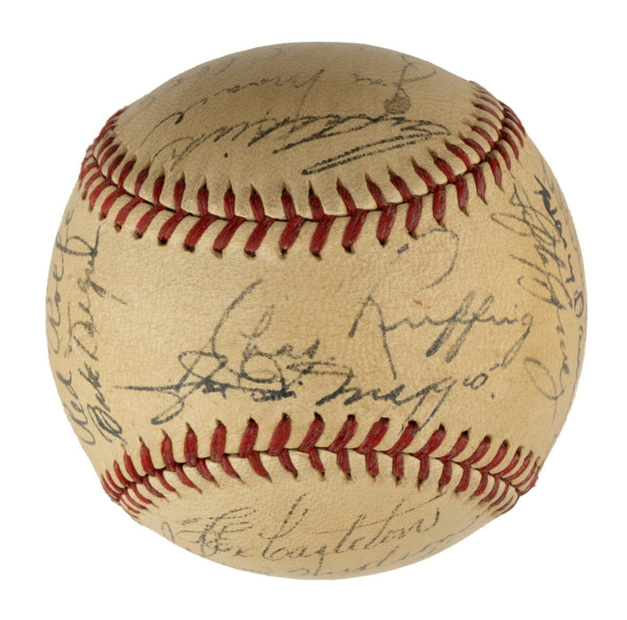 Official National League baseball (Frick) signed in black ink by 25 legendary Hall of Famers and stars in 1937, including Mel Ott, Joe DiMaggio (sweet spot early career signature), Carl Hubbell, Bill Dickey, Lefty Gomez, Joe Gordon, Red Ruffing (sweet spot), Charlie Keller, Jo-Jo Moore, Frank Demaree, Tex Carleton, Cookie Lavagetto, Dolph Camilli, Dixie Walker, Bill Jurges, Harry Danning, Frank Crosetti, Red Rolfe, Babe Dahlgren, and Burgess Whitehead. The ball is in Excellent condition overall. Full LOA from PSA/DNA. Full LOA from Steve Grad and Brian Sobrero/Beckett Authentication Services.