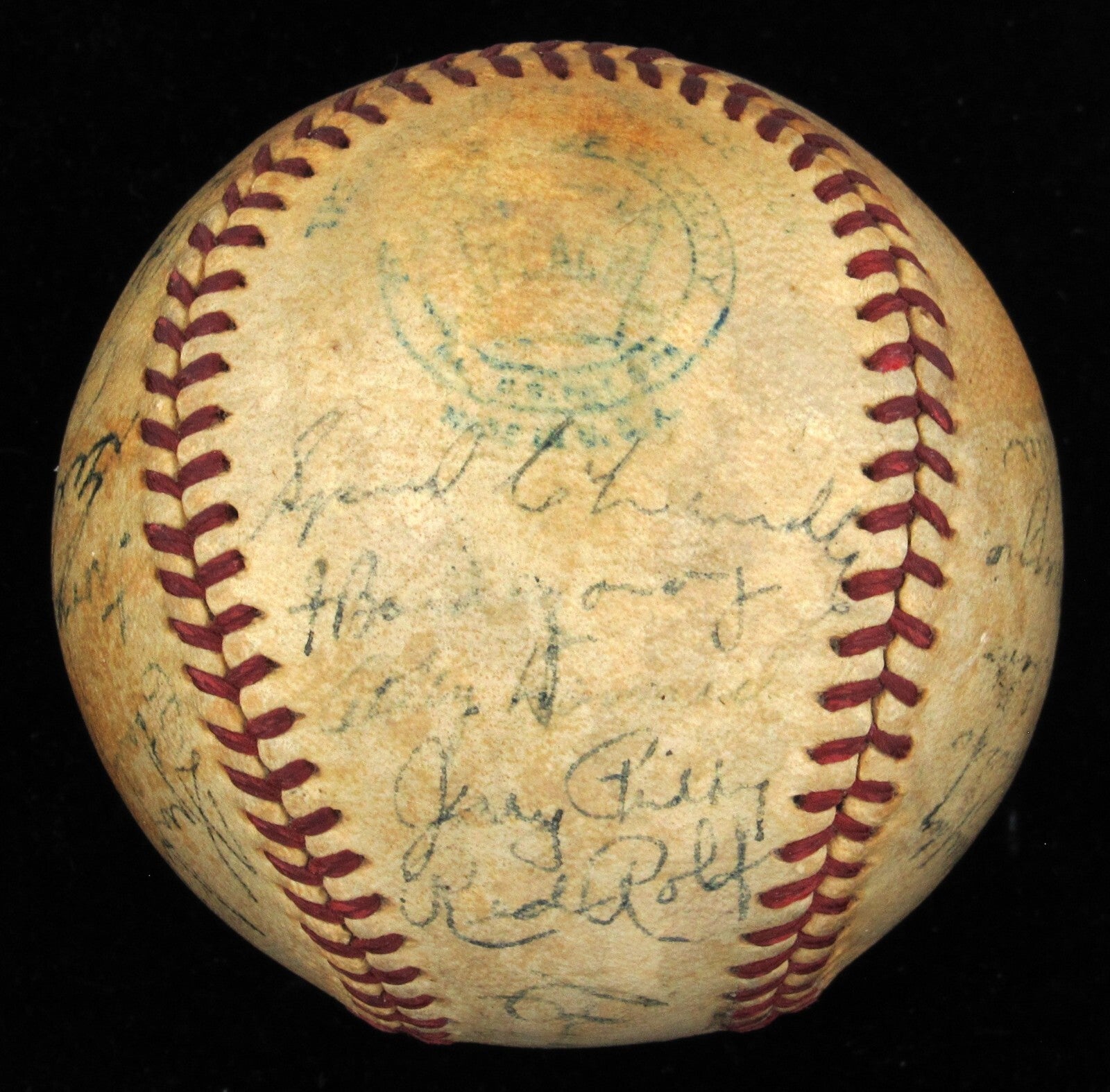 Celebrate this marvelous season, with this 1941 New York Yankees team-signed baseball. While most of the factory labeling stamps are well-faded, the ball is identified as a Reach OAL model, and the date "1943" is faintly written to the left of the reverse sweet spot. Of the (25) total autographs, (6) are Hall of Famers, and (10) are prominent stars, and/or long-deceased players. Keep reminding yourself, that Joe DiMaggio signed this ball during the season of his 56-game hitting streak, making a truly sacred historic relic.