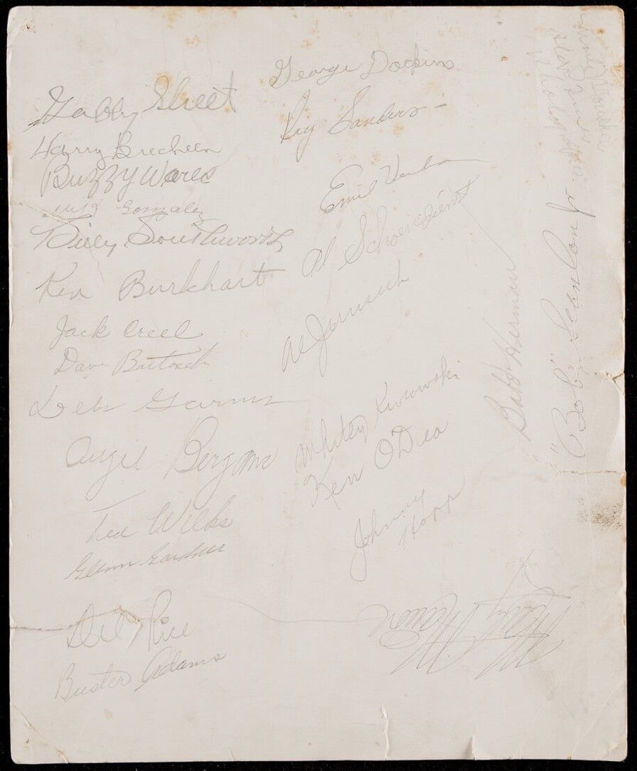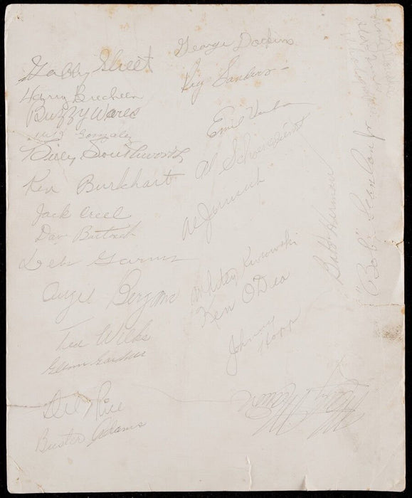 1944 St. Louis Cardinals Team Signed Photograph. Original 1944 St. Louis Cardinals team signed 8 1/2" x 11" photograph with 25 signatures. Signed on the reverse side. Notables include: Red Schoendienst, Marty Marion, Rice, Billy Southworth, Burkhart, Gabby Street, Hopp and many others. Guaranteed for life to pass PSA DNA or JSA.