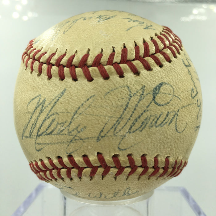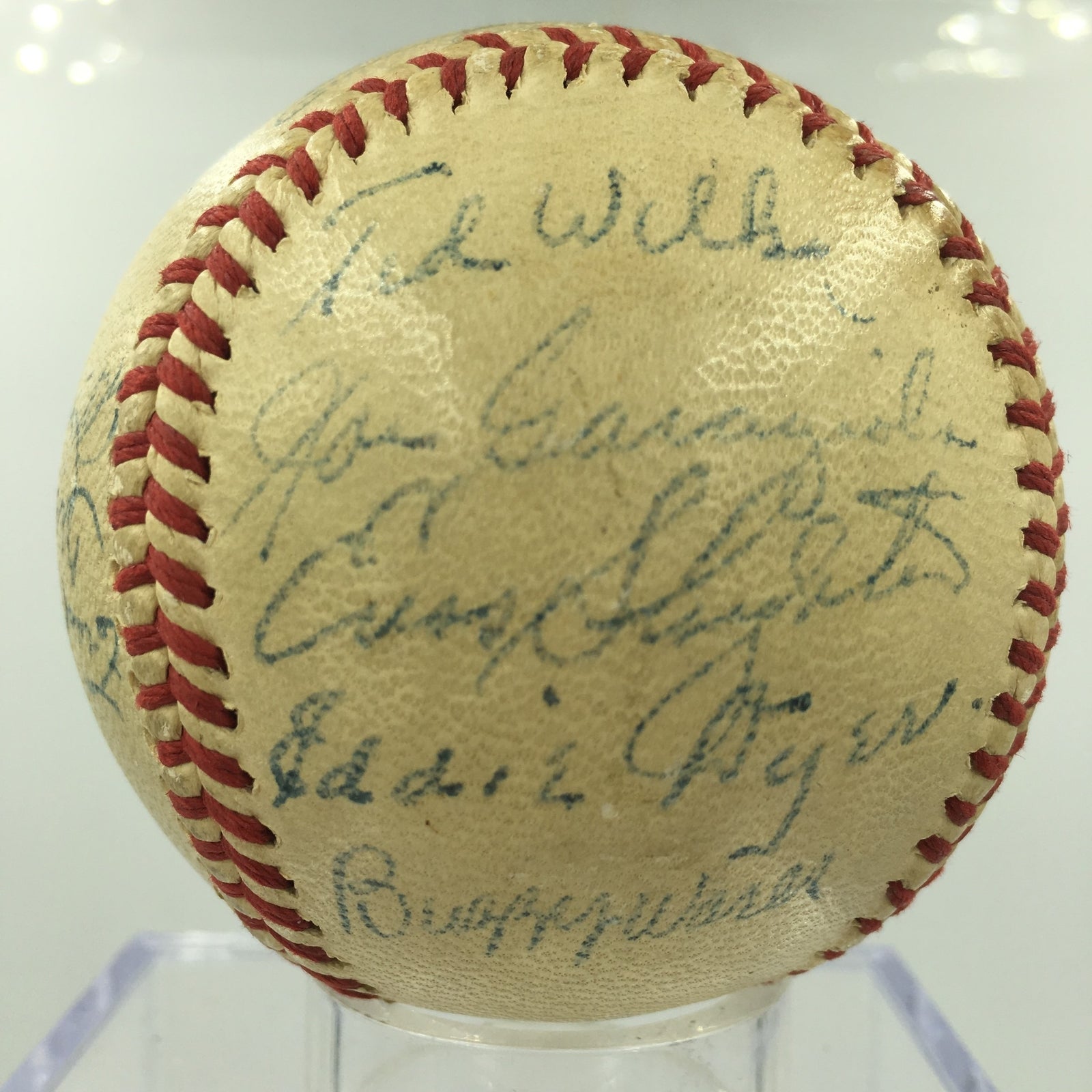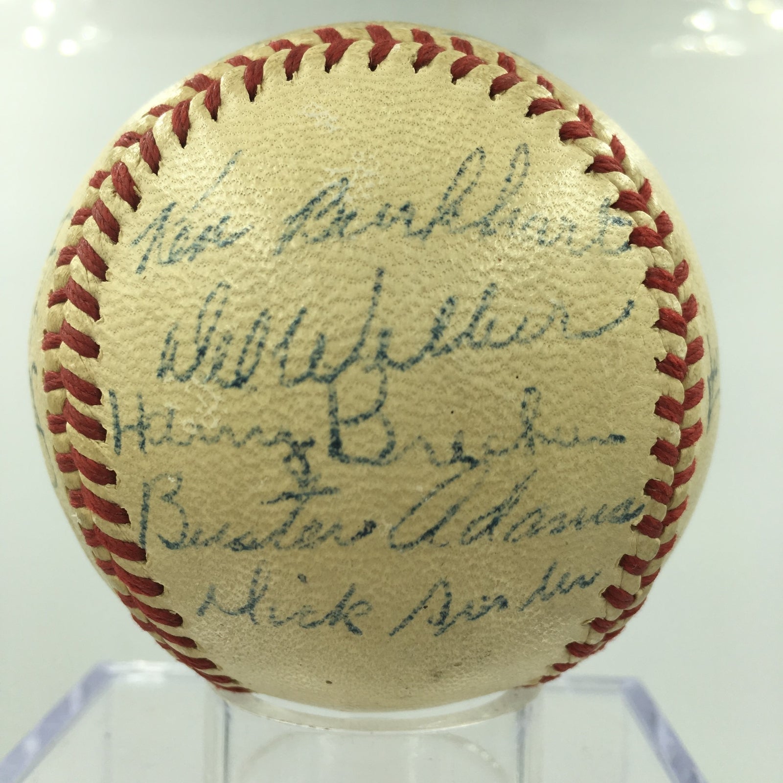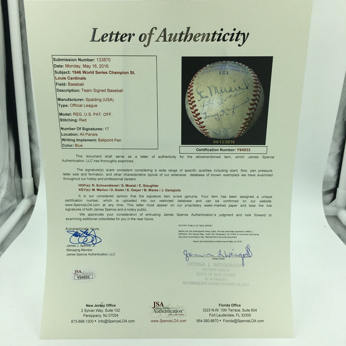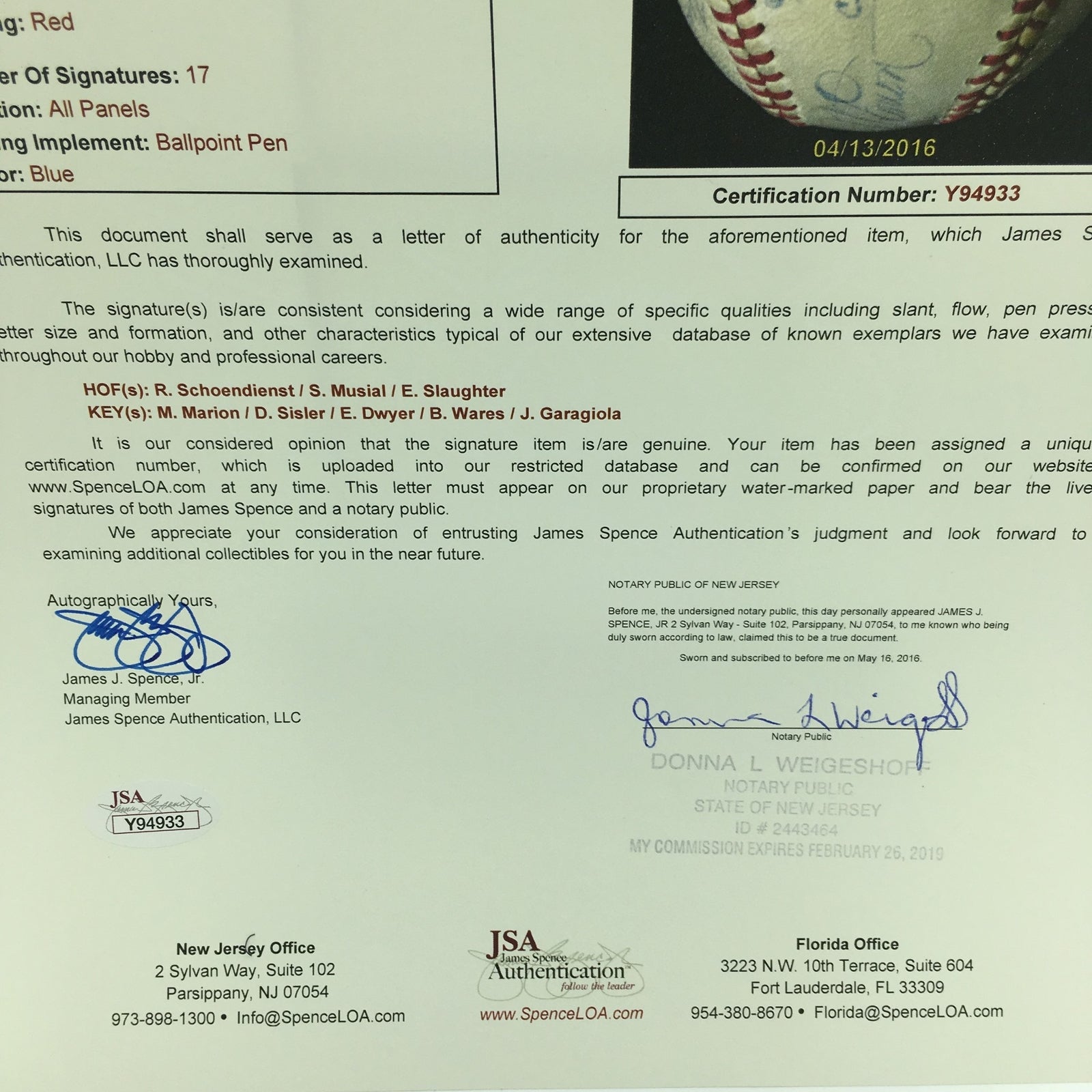 1946 St. Louis Cardinals World Series Champions Team Signed Baseball. Total Of 17 Signatures Key Hall Of Famers: R.Schoendienst , Stan Musial ,Enos Slaughter, Key Players M. Marion, D. Sisler, E. Dwyer ,B. Wares, J. Garagiola. Comes with JSA FULL LETTER COA.
