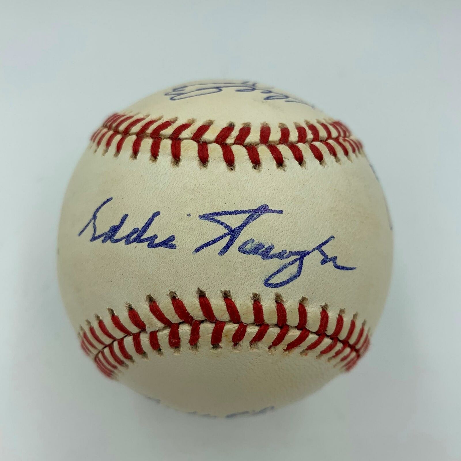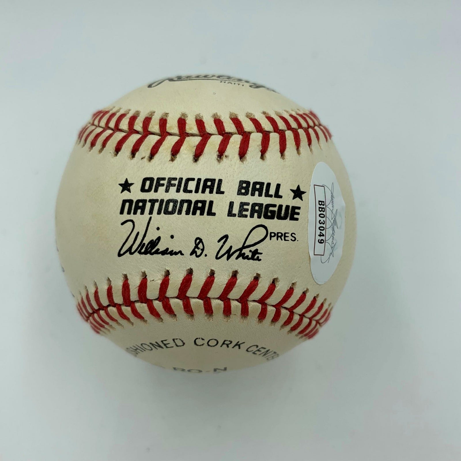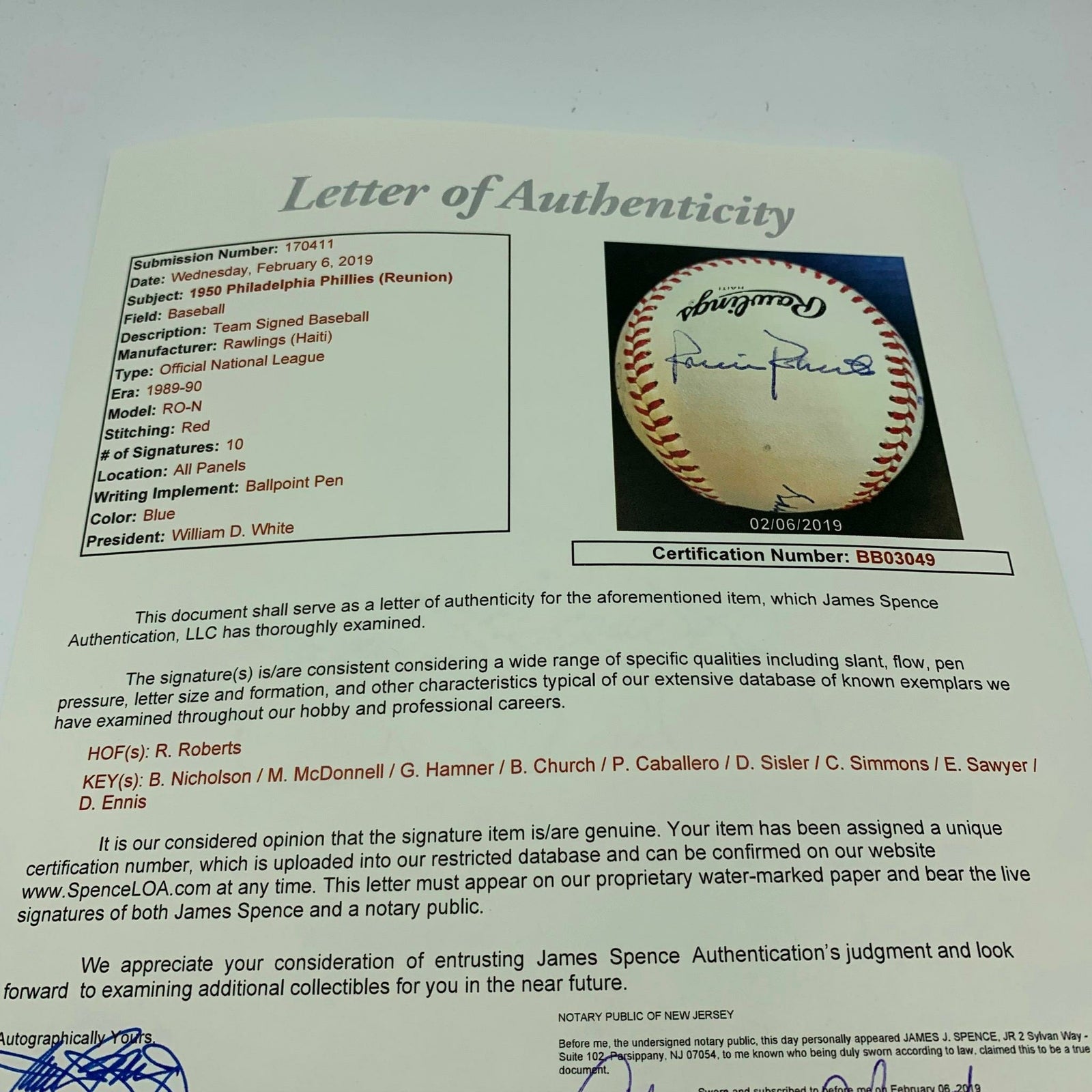 1950 National League Champions Reunion Ball: Official National League Baseball signed in blue ballpoint by: Sweet Spot: Sawyer (manager); North Panel: Ennis, Hamner, Nicholson and McDonnell (coach); South Panel: Church and Caballero; West Panel: Robin Roberts; East Panel: Sisler and Simmons. Full letter JSA COA.